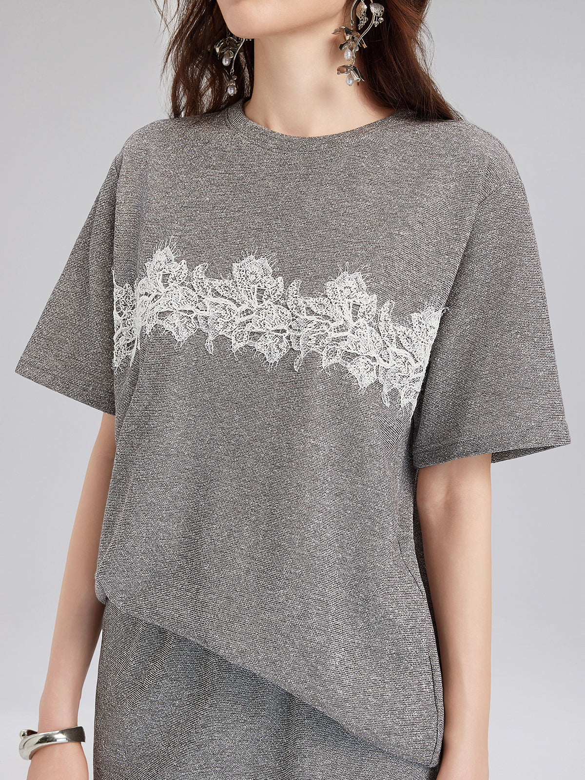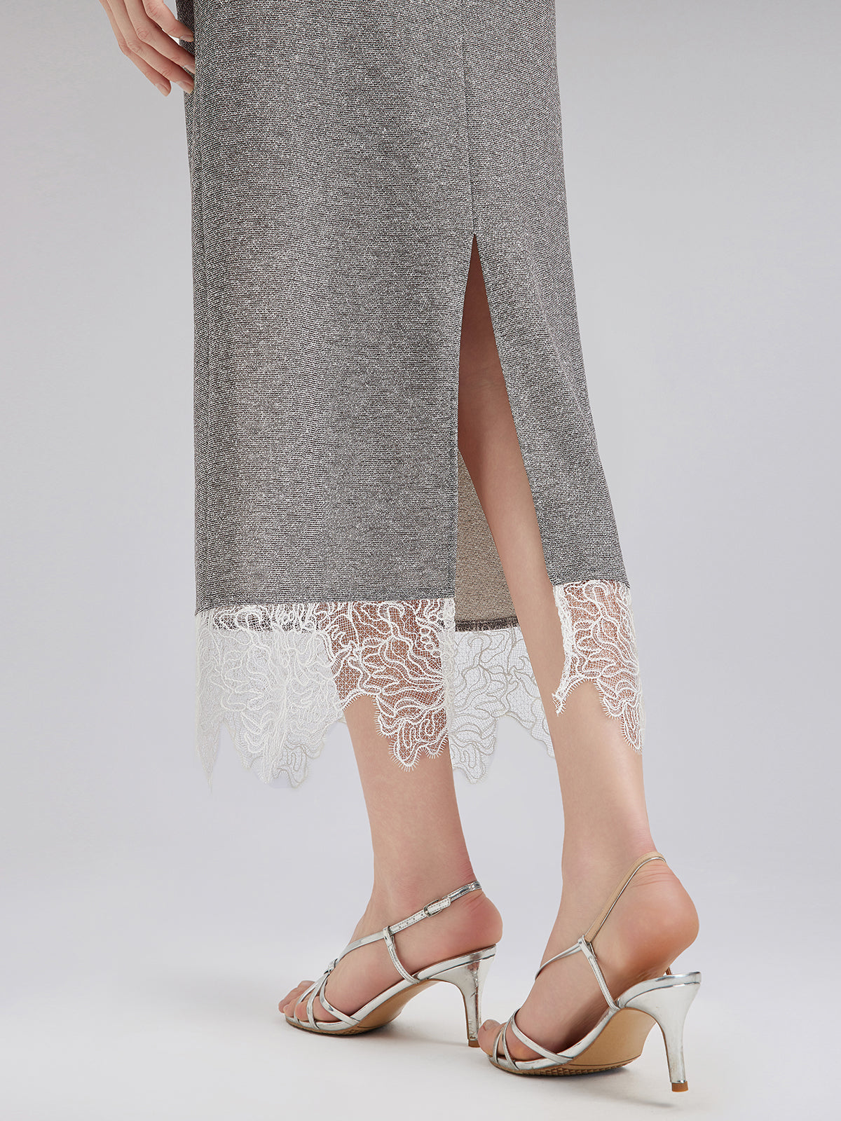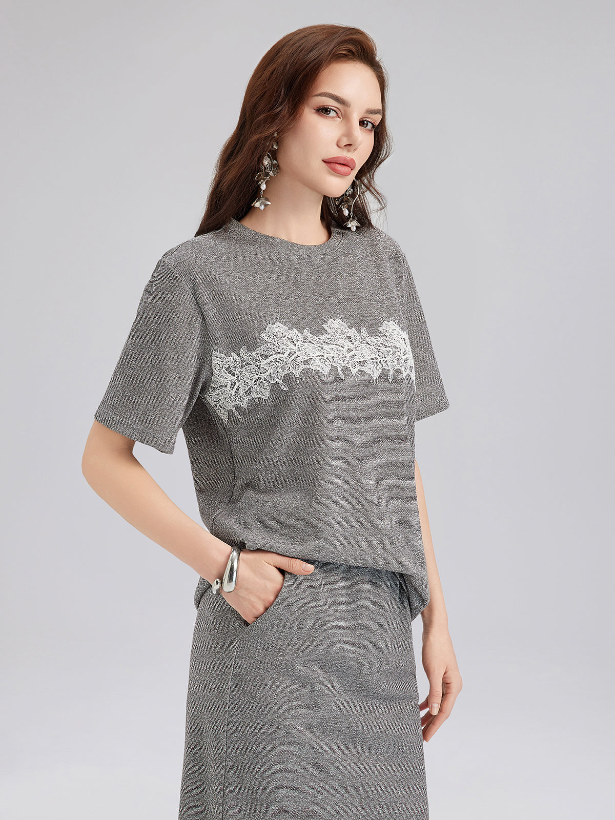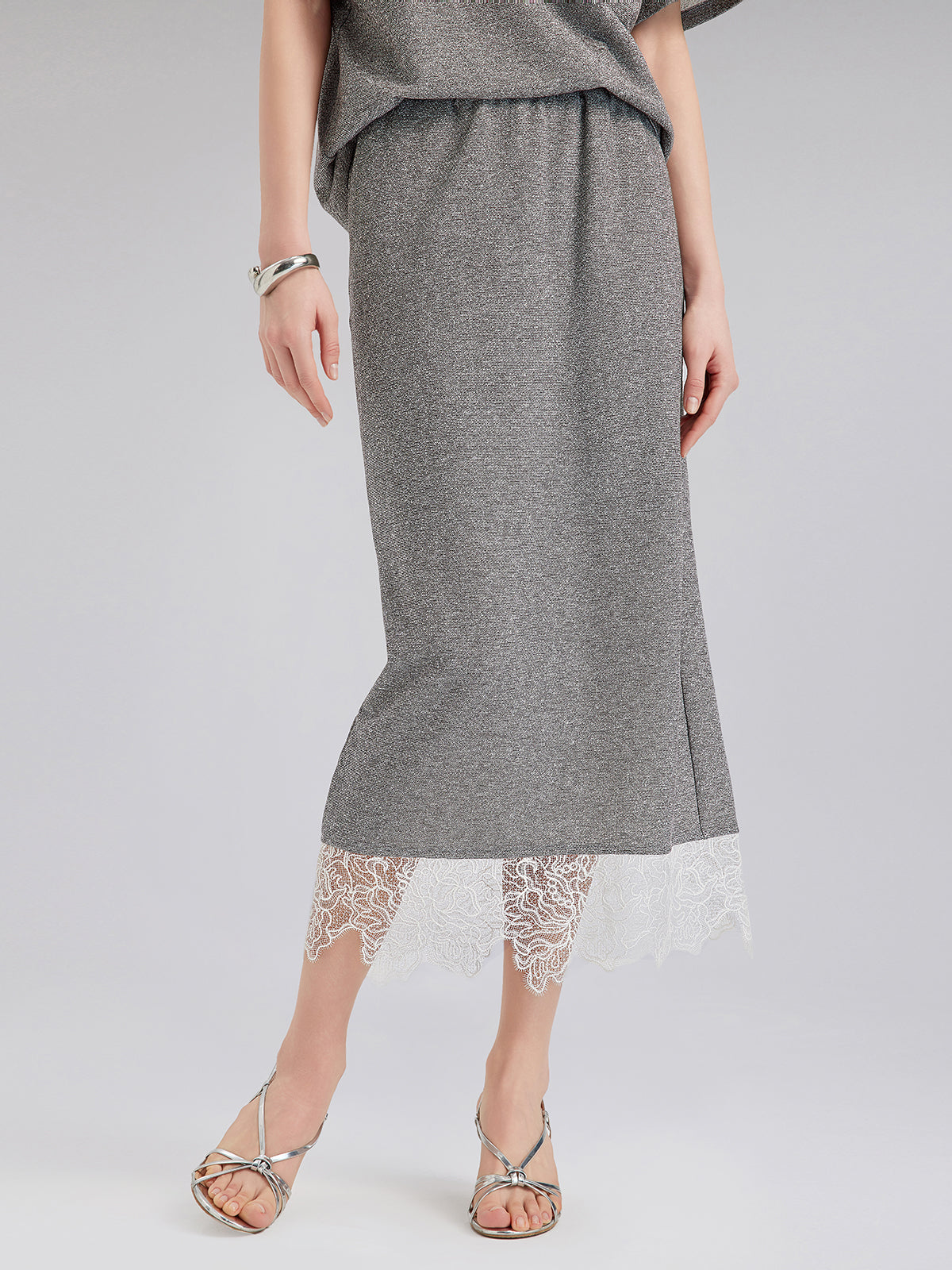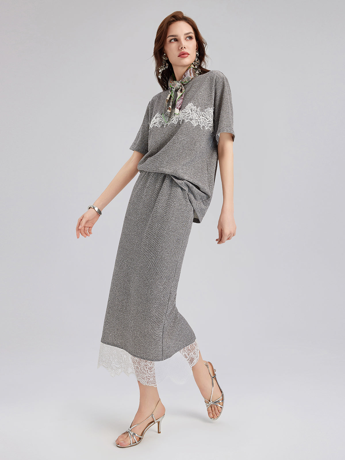 Soft, breathable knit with subtle shimmer and gentle stretch offers both comfort and ease. Contrasting lace on the top adds romantic depth, while the lace-trimmed skirt hem creates a light, airy finish. The relaxed tee cut flatters all body types, paired with a straight skirt featuring an elastic waistband for a snug, comfortable fit.