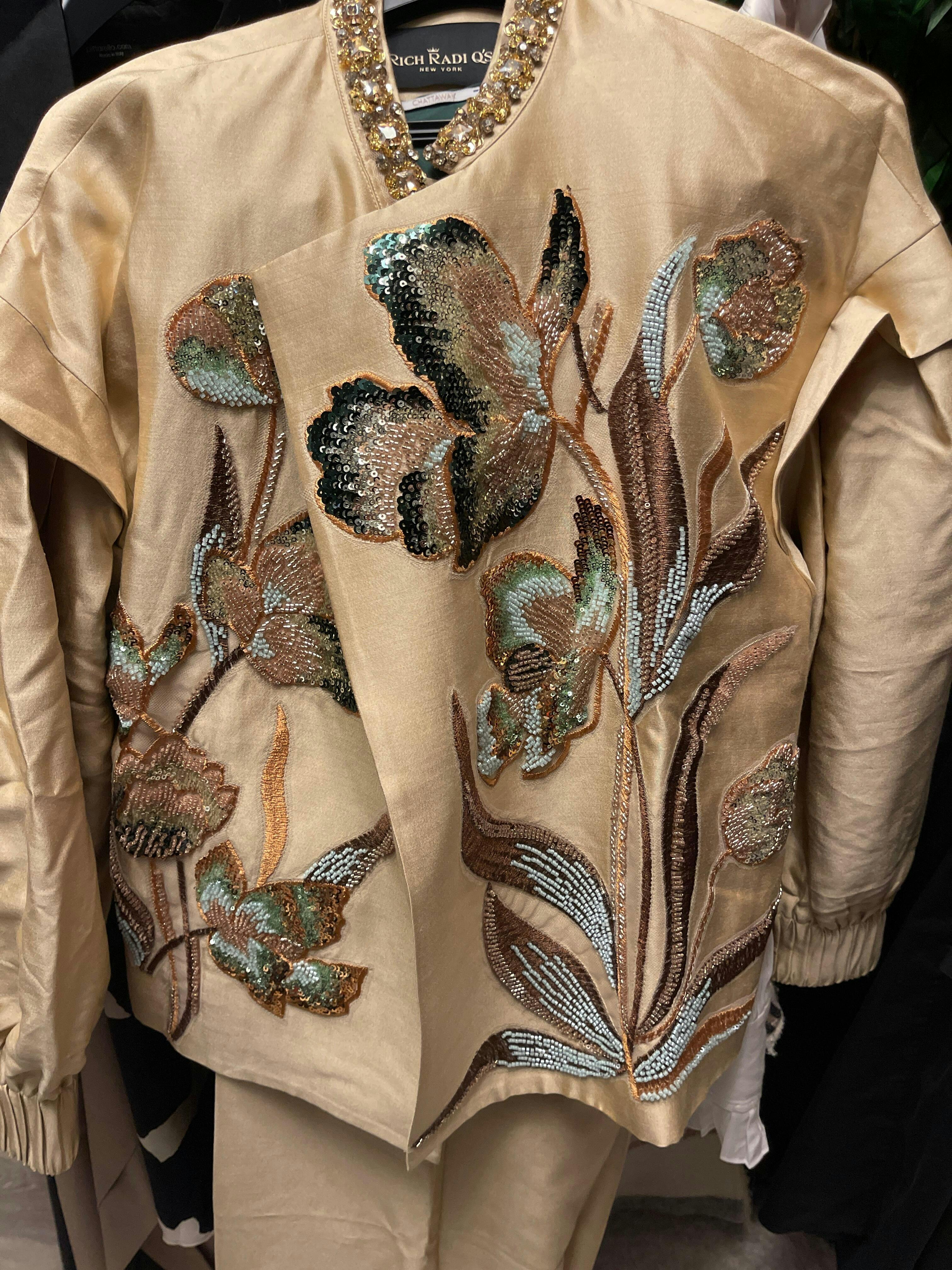 This jacket features intricate floral embroidery with sequins and beads, adding depth and shine. The collar and cuffs are decorated with sparkling details for a touch of luxury. Made from high-quality fabric, the soft, comfortable feel and elegant beige tone make it perfect for various occasions.