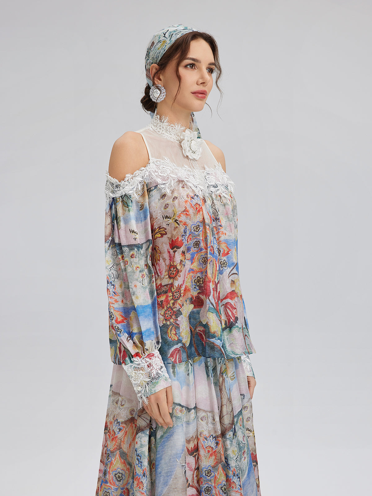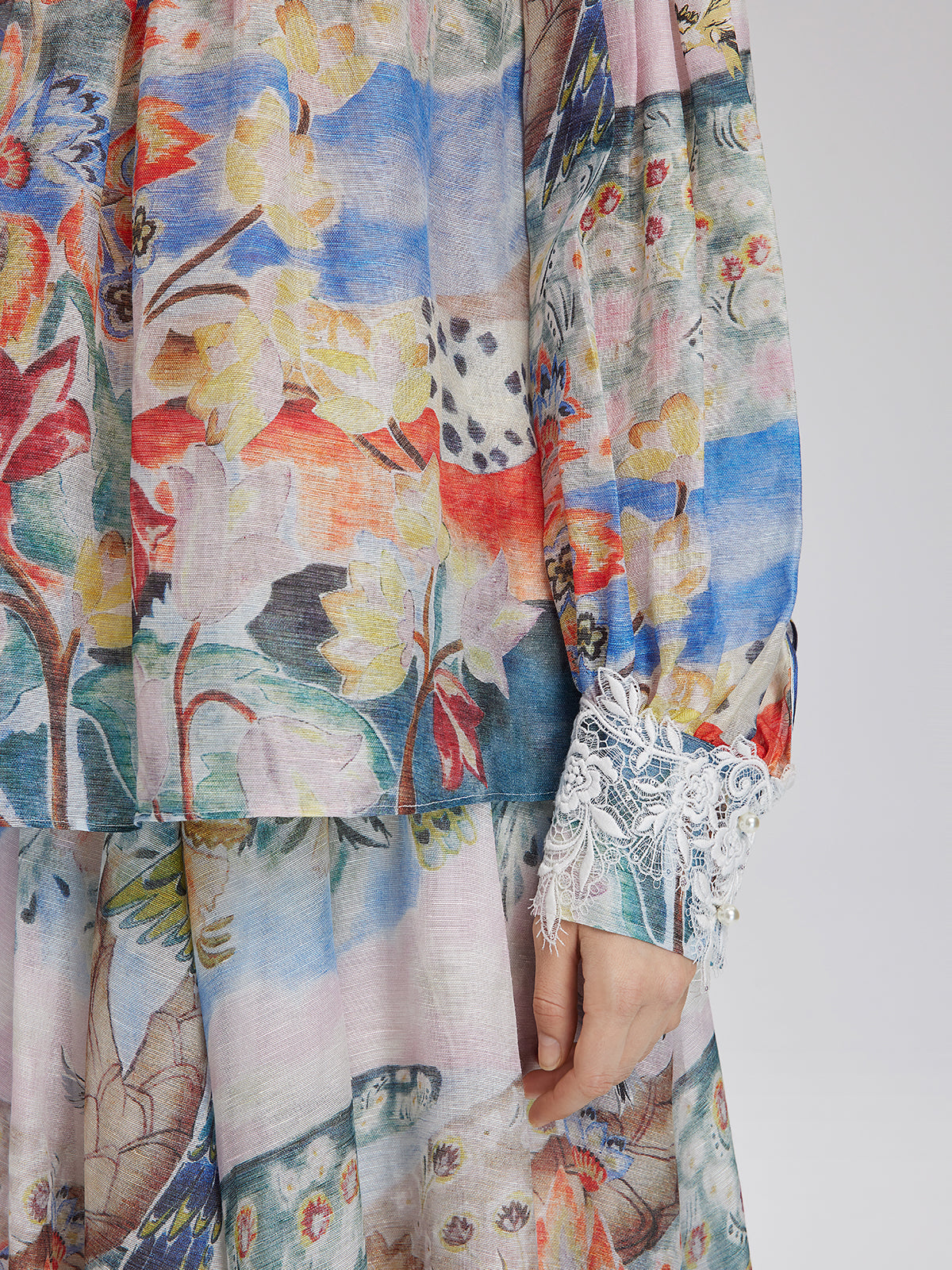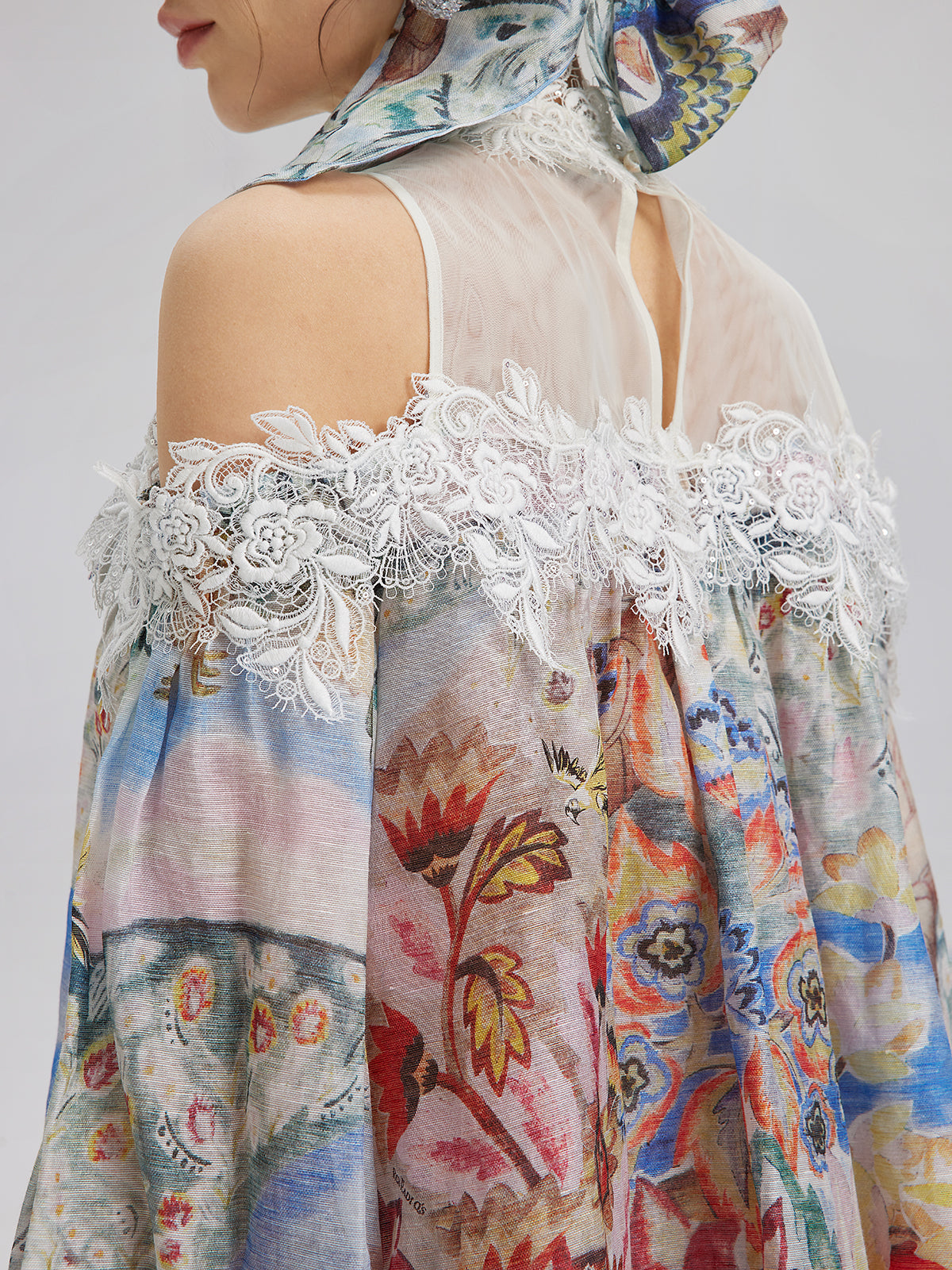 Blending airy mesh with a silk-linen base, the print unfolds like a soft oil painting—romantic, textural, quietly vivid. A sheer high neckline frames the collarbone, while lace trim, a detachable 3D flower, and matching headband add sculptural charm. Relaxed tailoring and gathered pleats bring movement and ease.