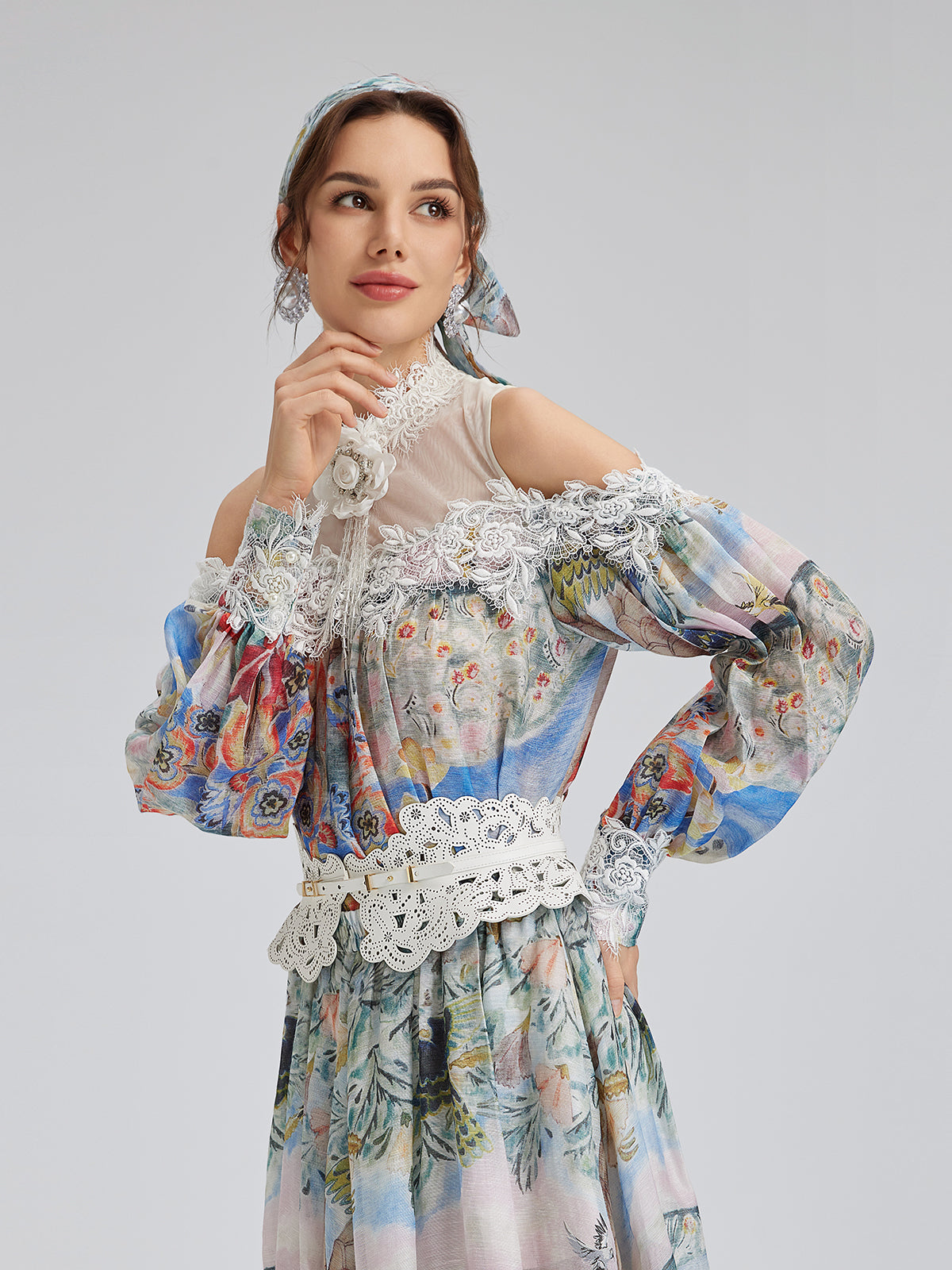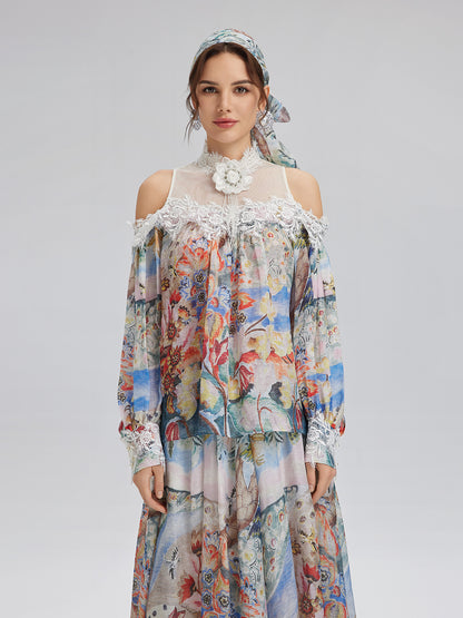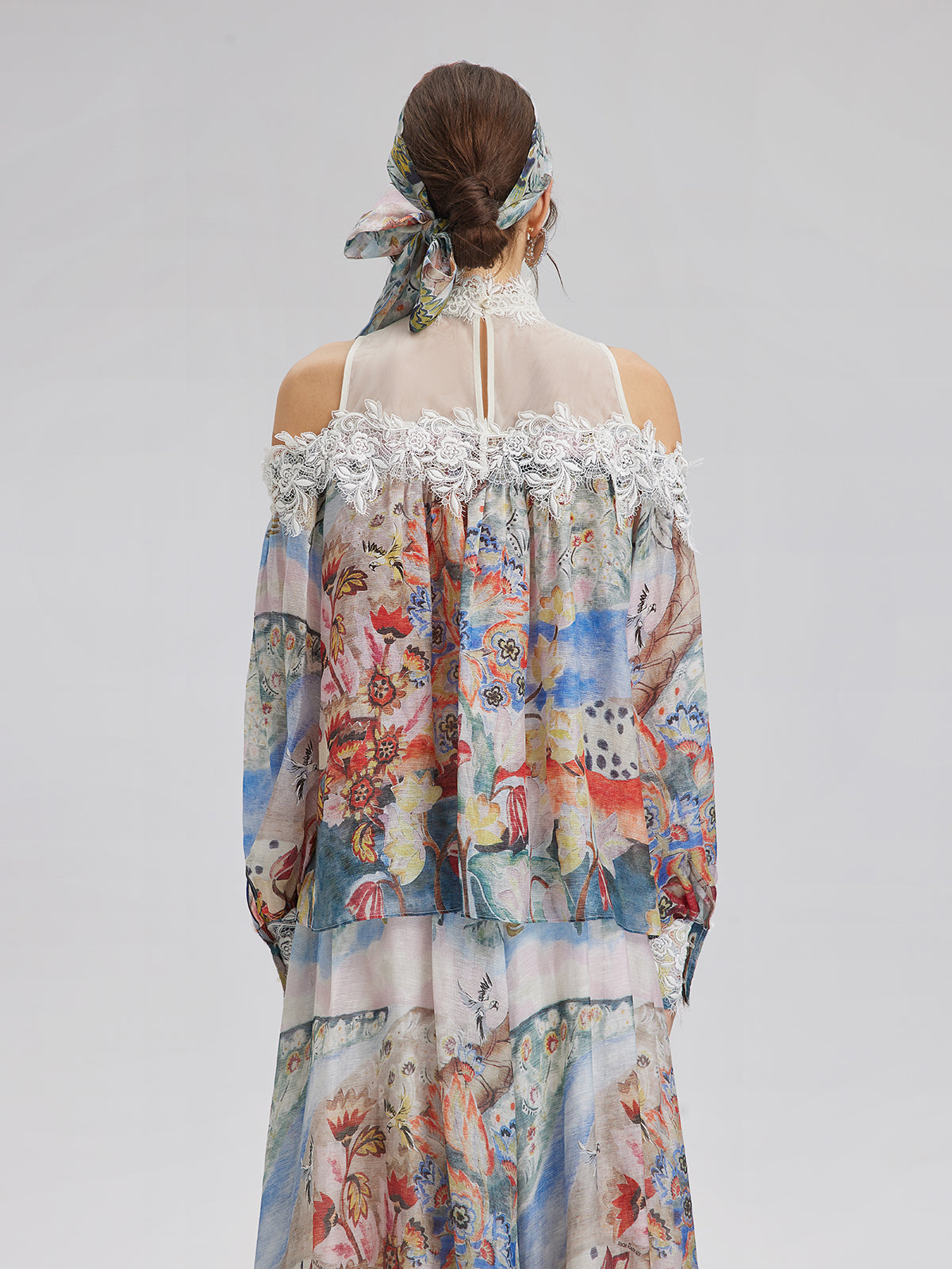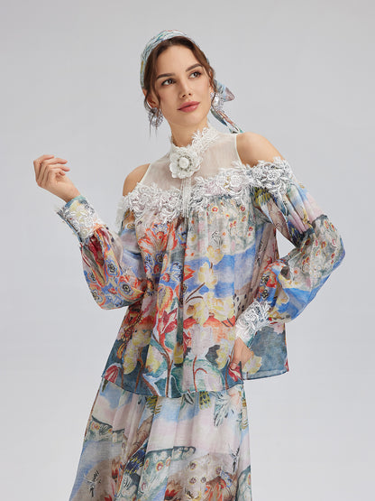 Blending airy mesh with a silk-linen base, the print unfolds like a soft oil painting—romantic, textural, quietly vivid. A sheer high neckline frames the collarbone, while lace trim, a detachable 3D flower, and matching headband add sculptural charm. Relaxed tailoring and gathered pleats bring movement and ease.