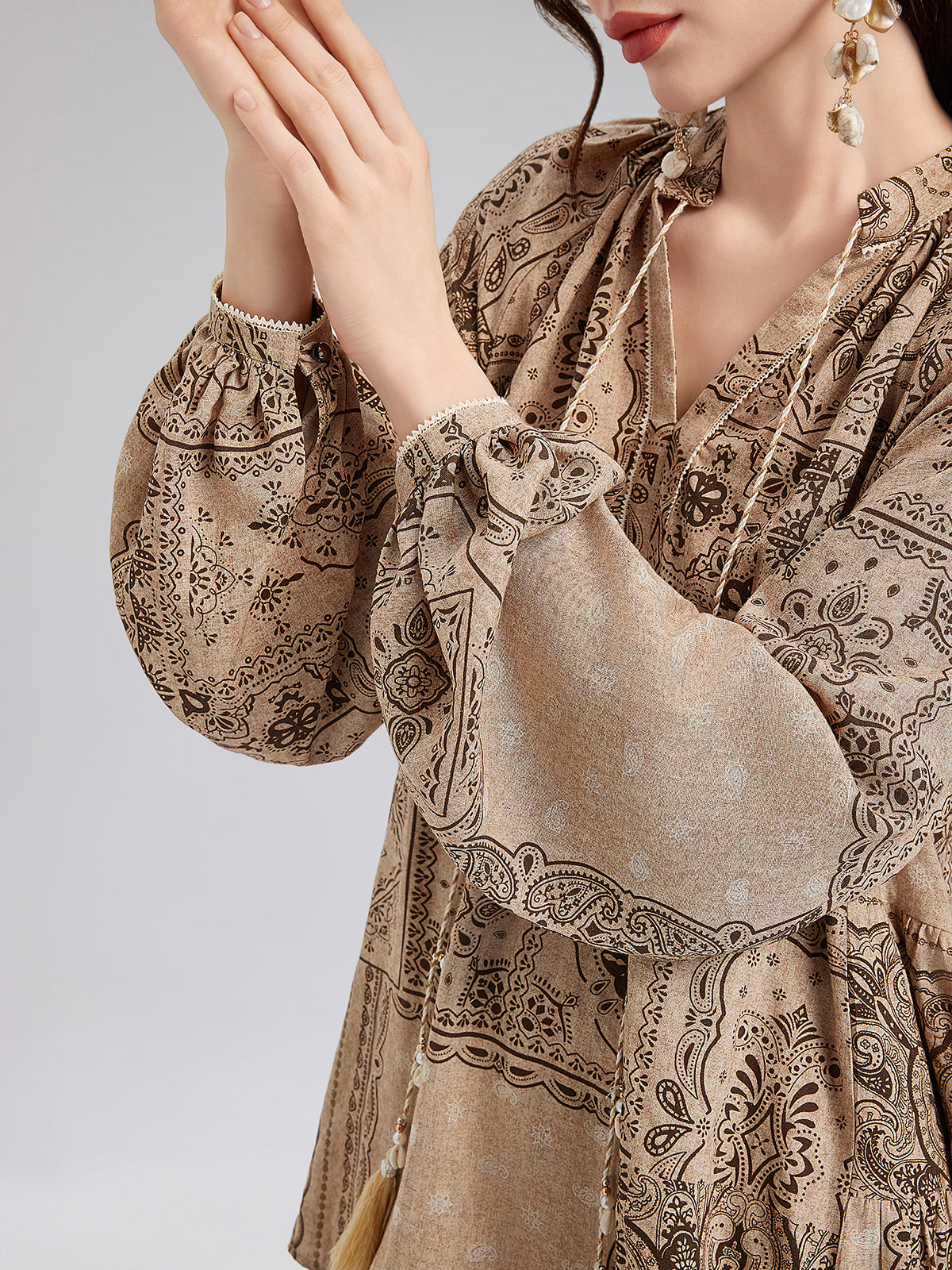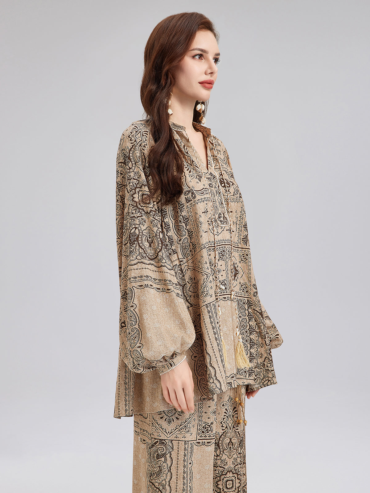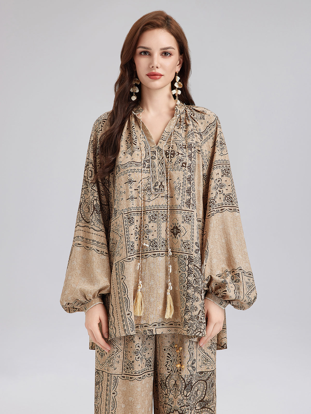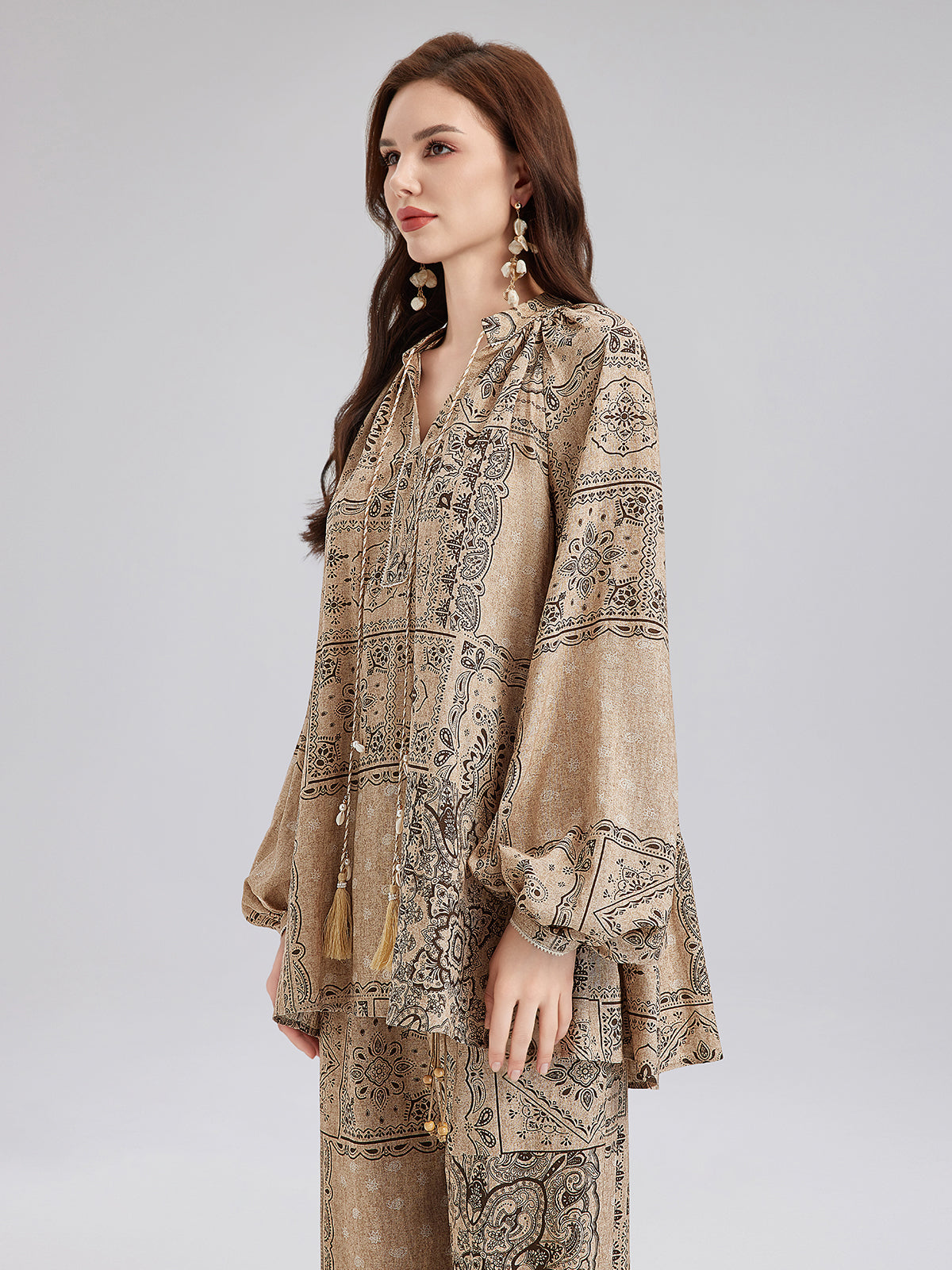 Featuring a vibrant paisley print with an exotic touch, this blouse has a V-neck with adjustable ties, accented by natural shell and tassel details. Delicate lace trims at the neckline and cuffs add a romantic feel. The relaxed fit offers ease and versatility.