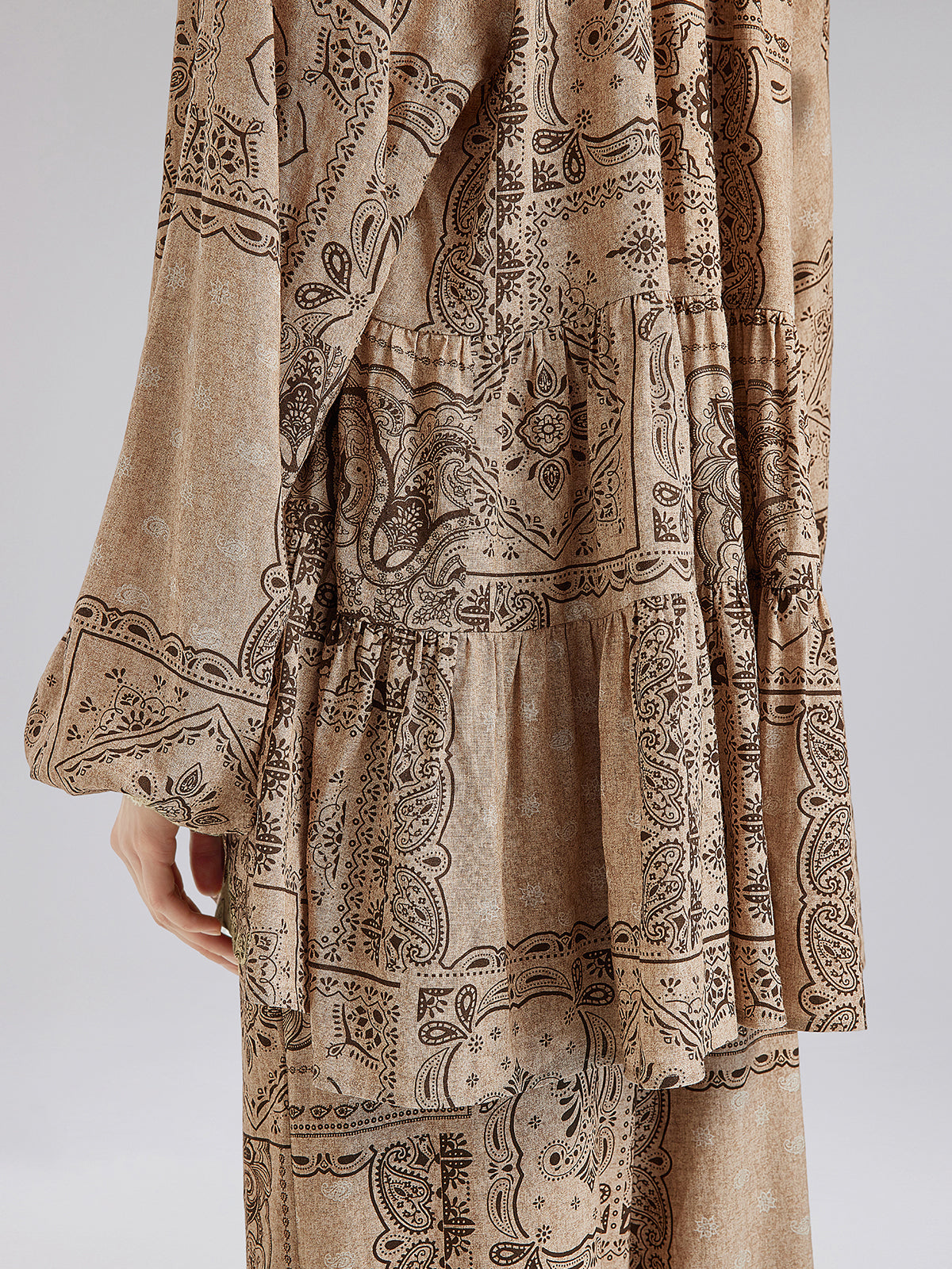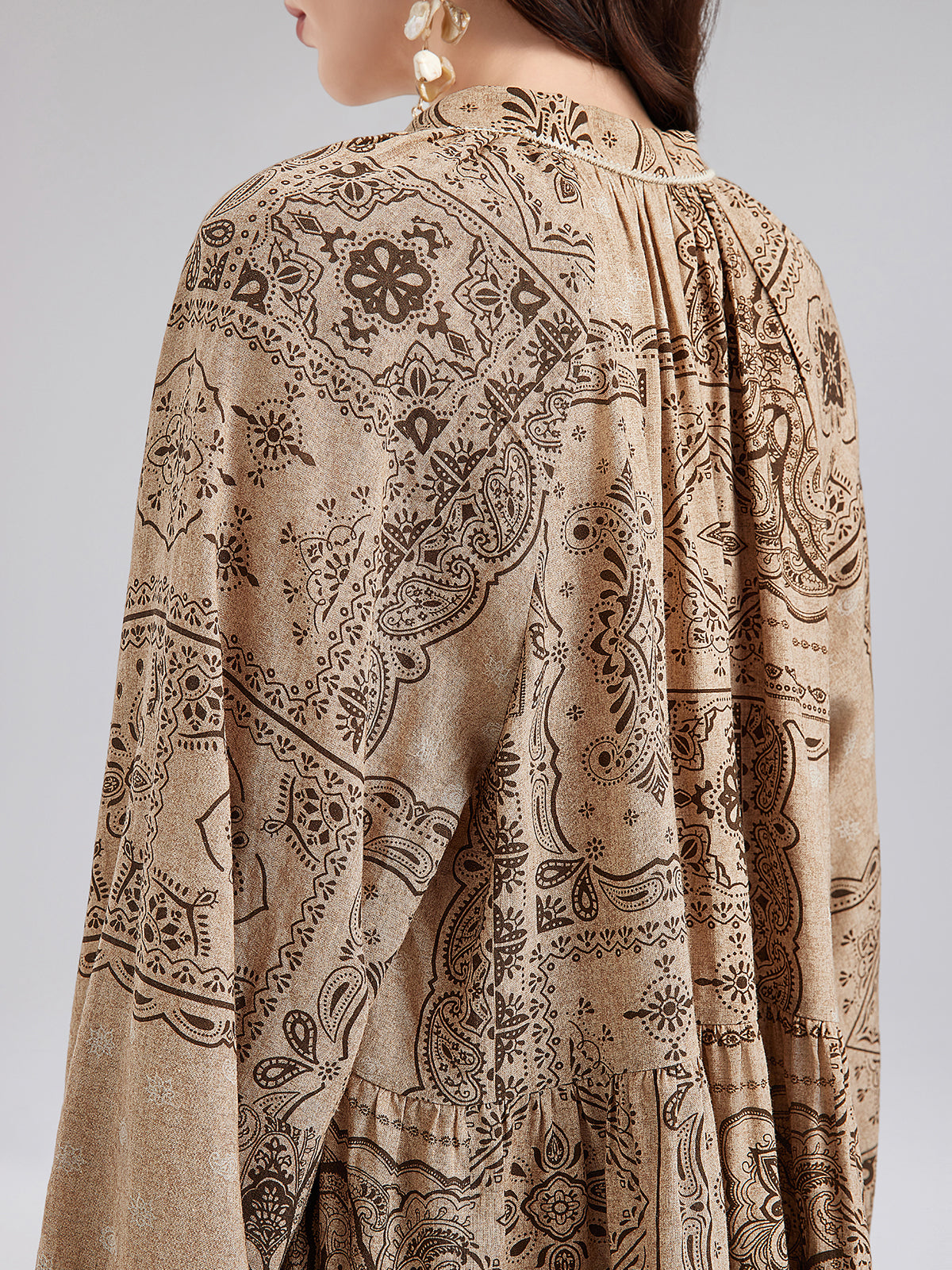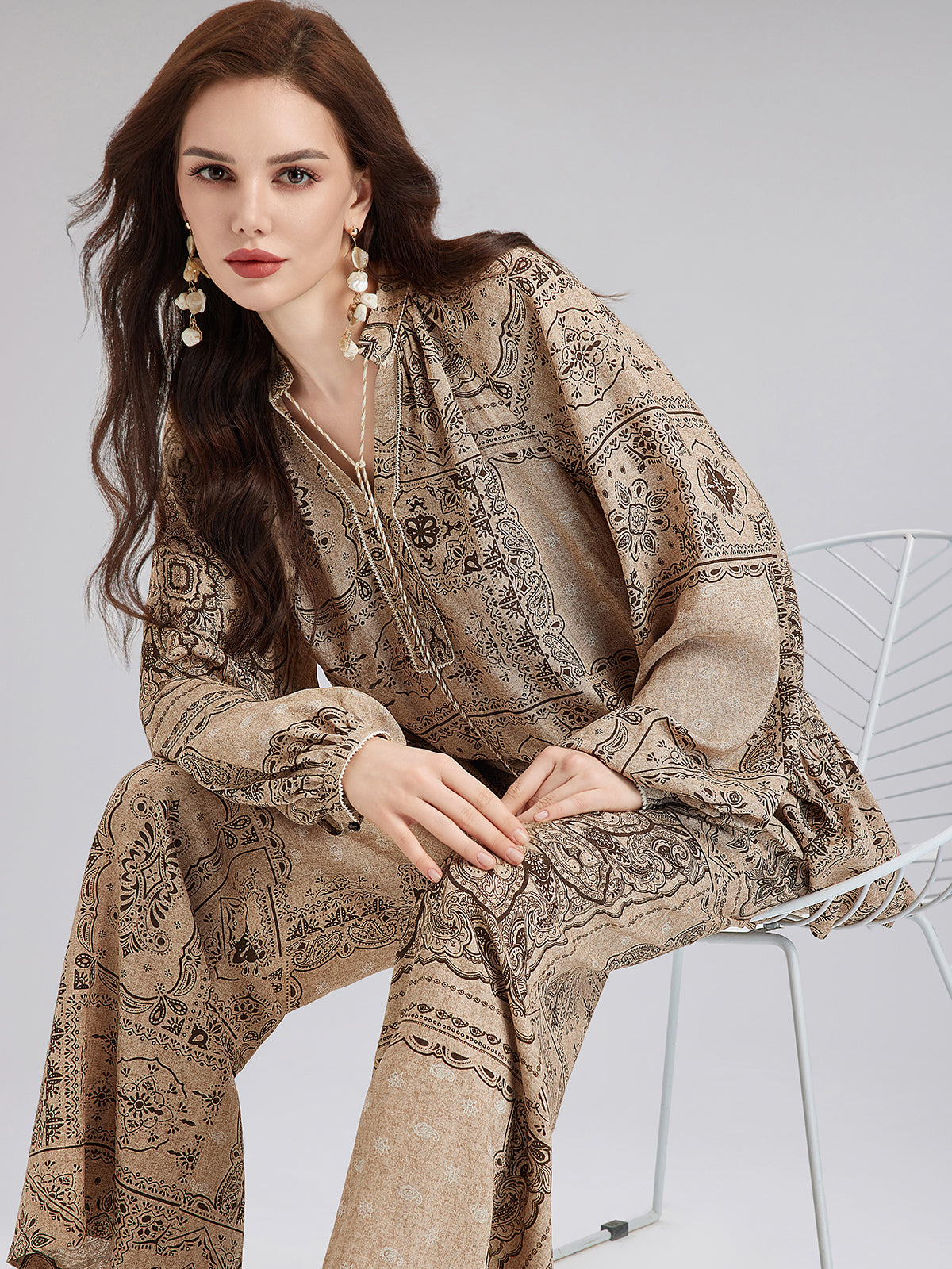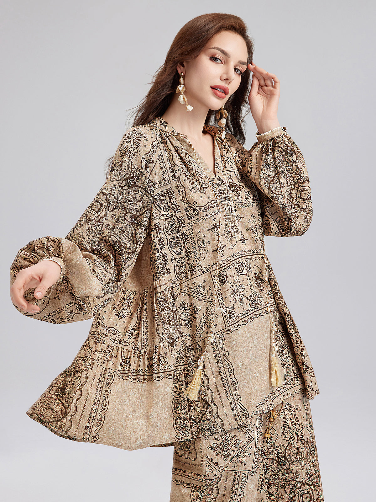 Featuring a vibrant paisley print with an exotic touch, this blouse has a V-neck with adjustable ties, accented by natural shell and tassel details. Delicate lace trims at the neckline and cuffs add a romantic feel. The relaxed fit offers ease and versatility.