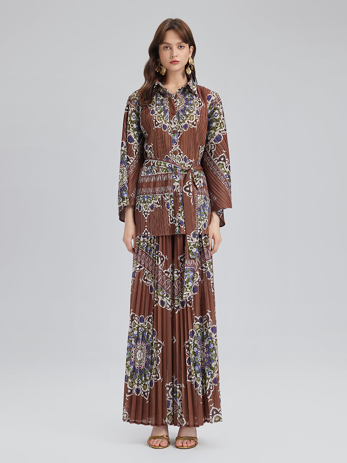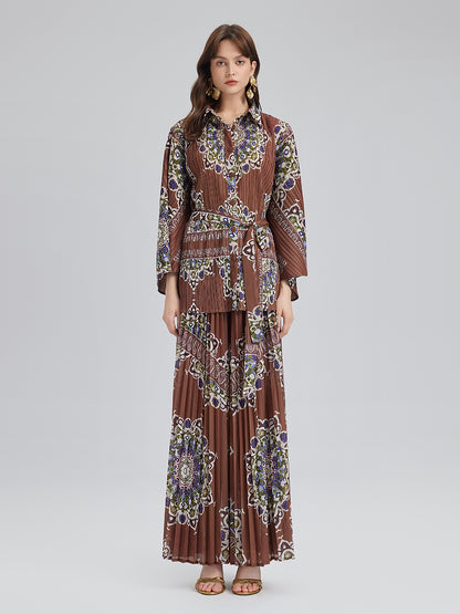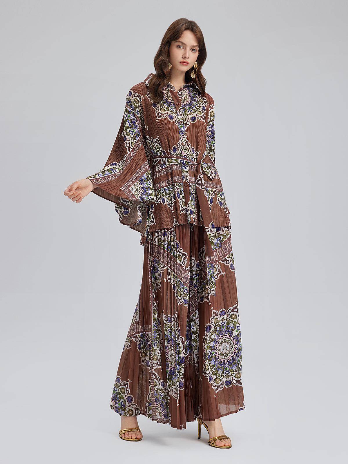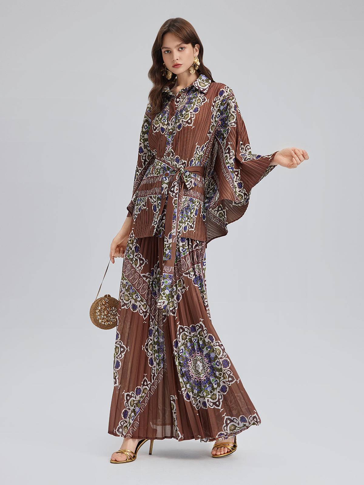 High-quality pleated fabric with vintage-inspired print. Relaxed top features, matching buttons, and an adjustable waist for versatile styling. The wide-leg pants come with an elastic waistband for added comfort and flexibility. (Comes with a matching belt.)