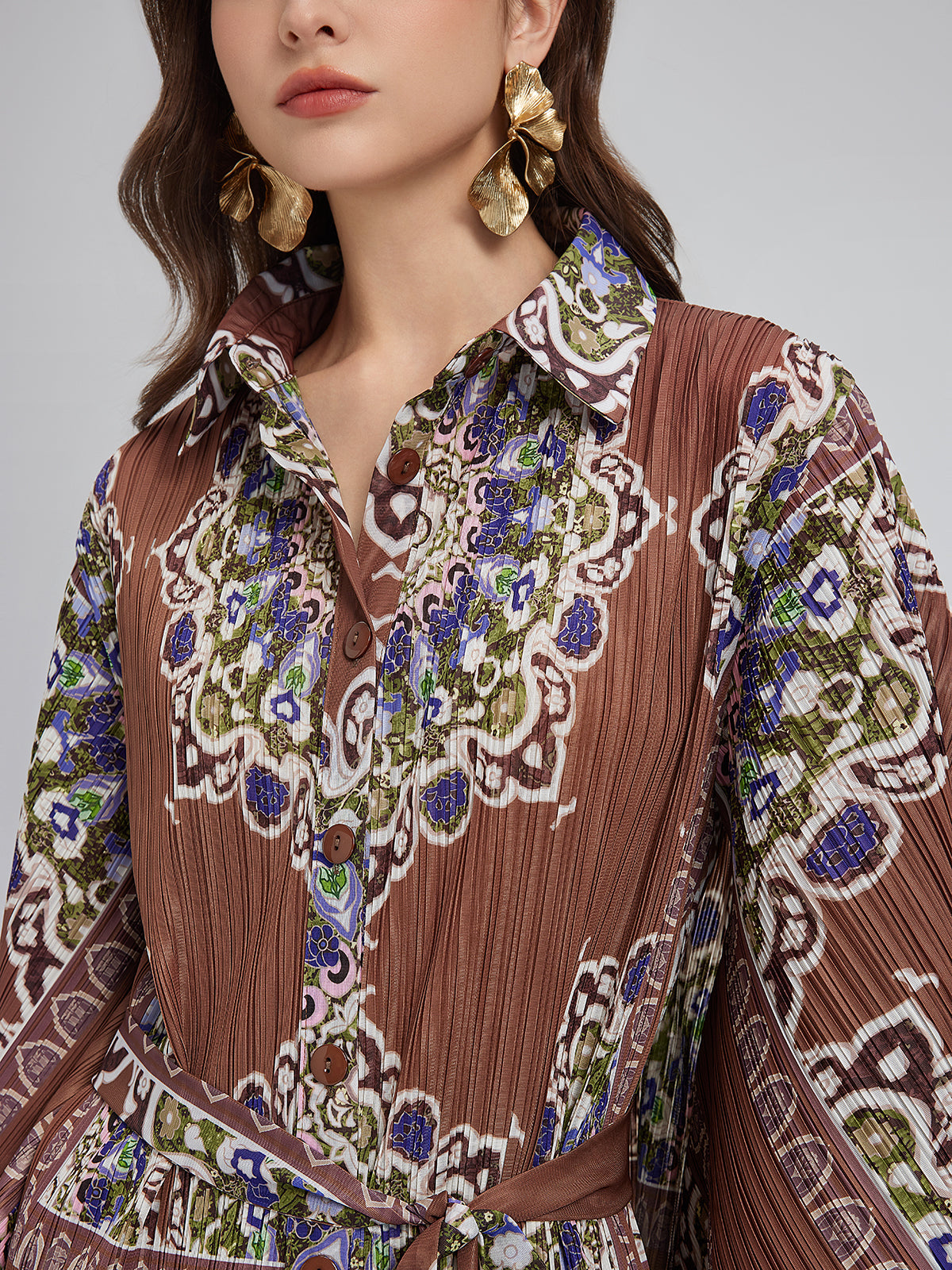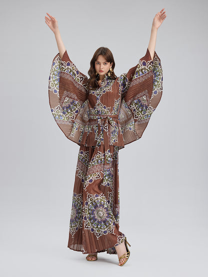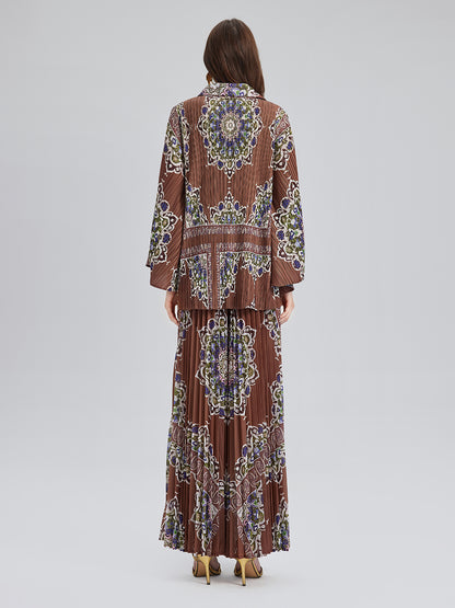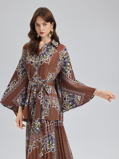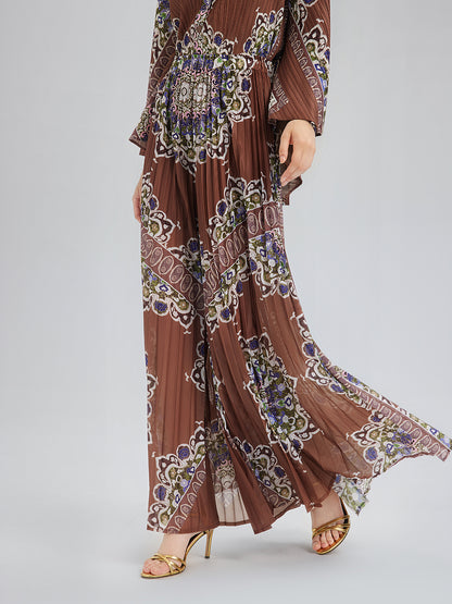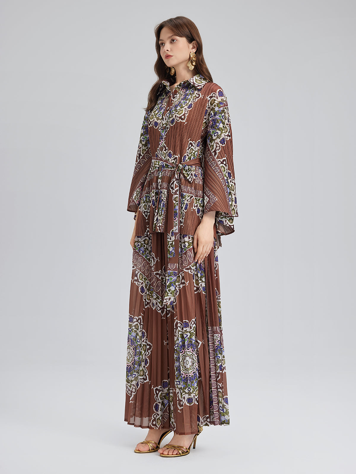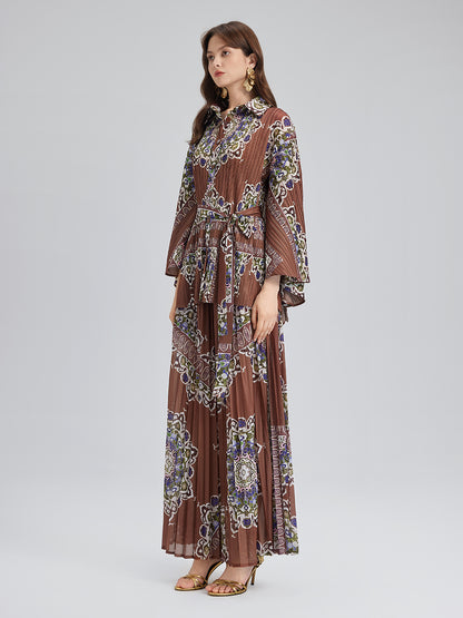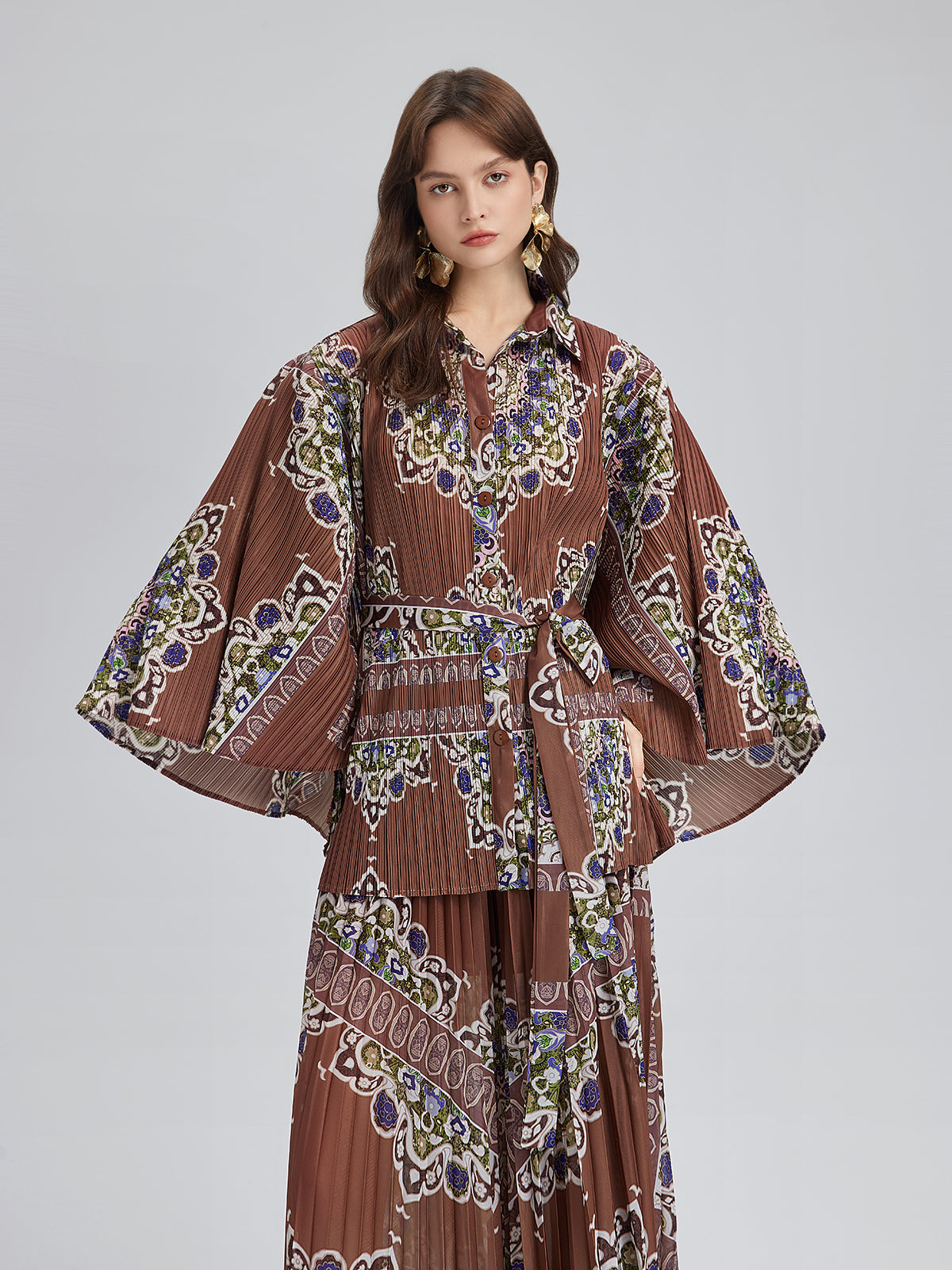 High-quality pleated fabric with vintage-inspired print. Relaxed top features, matching buttons, and an adjustable waist for versatile styling. The wide-leg pants come with an elastic waistband for added comfort and flexibility. (Comes with a matching belt.)