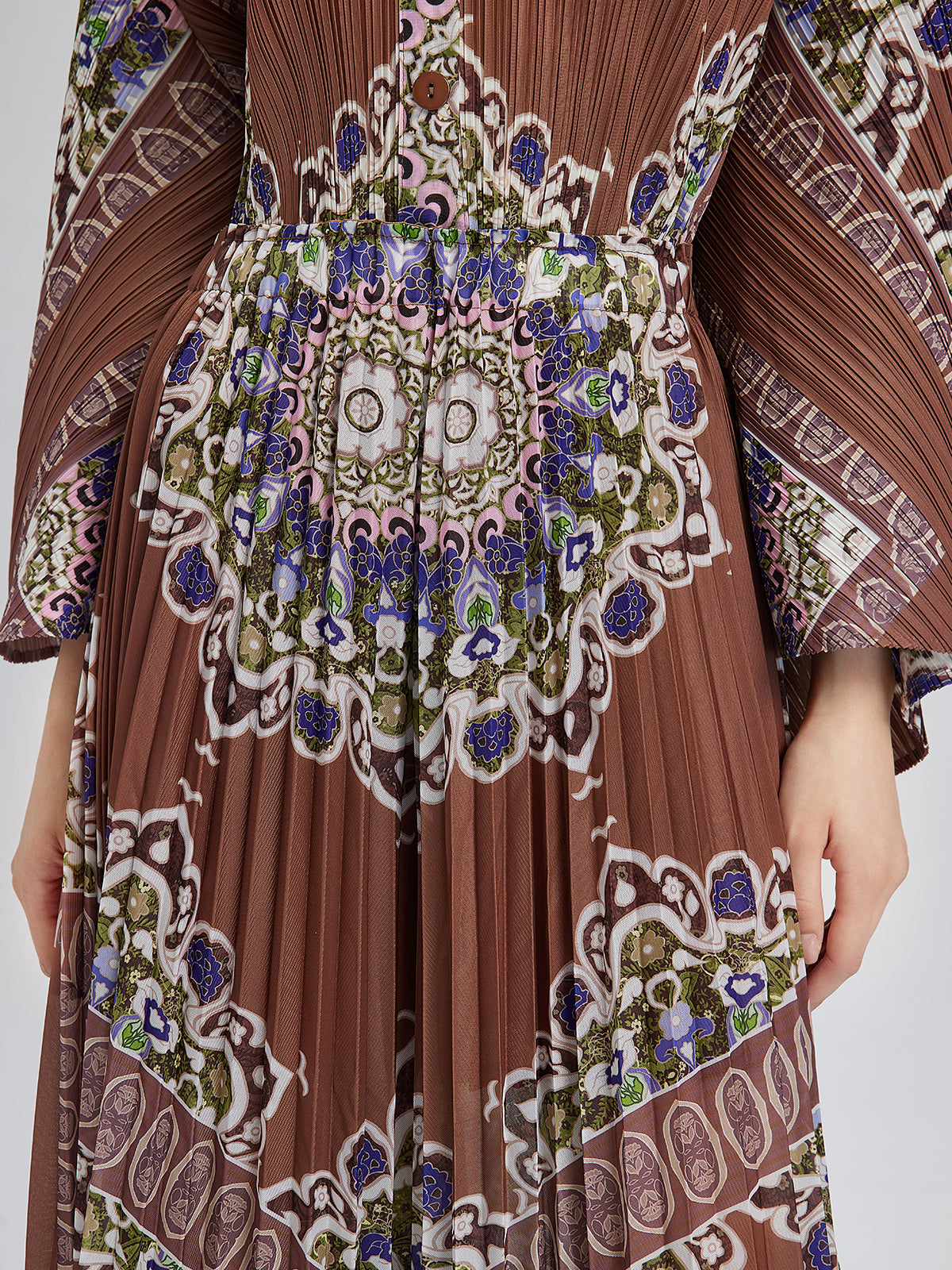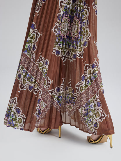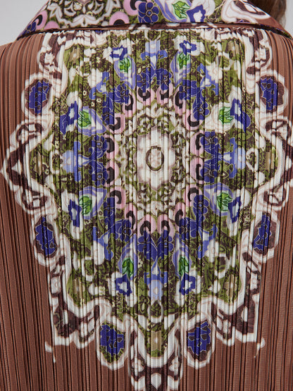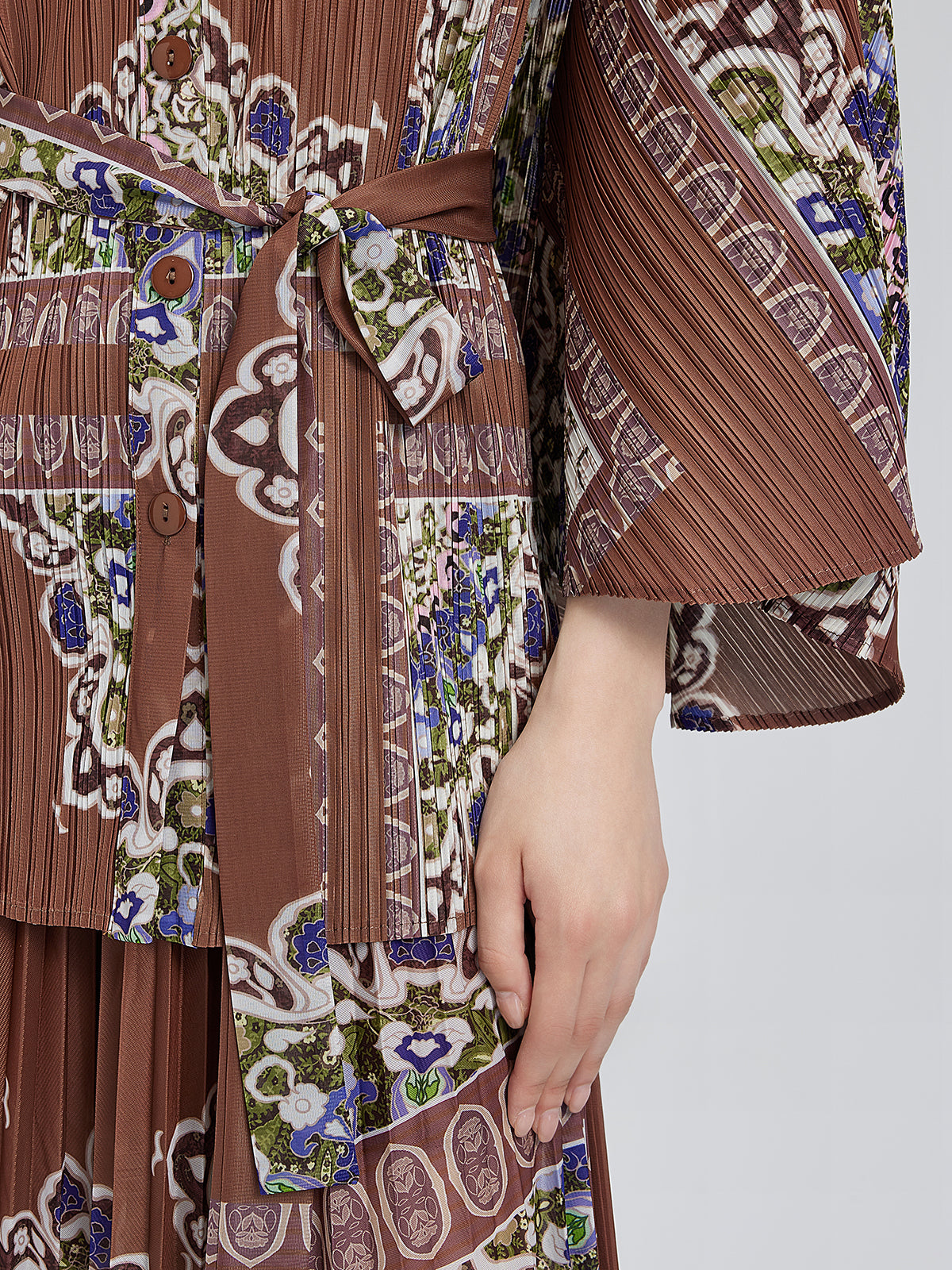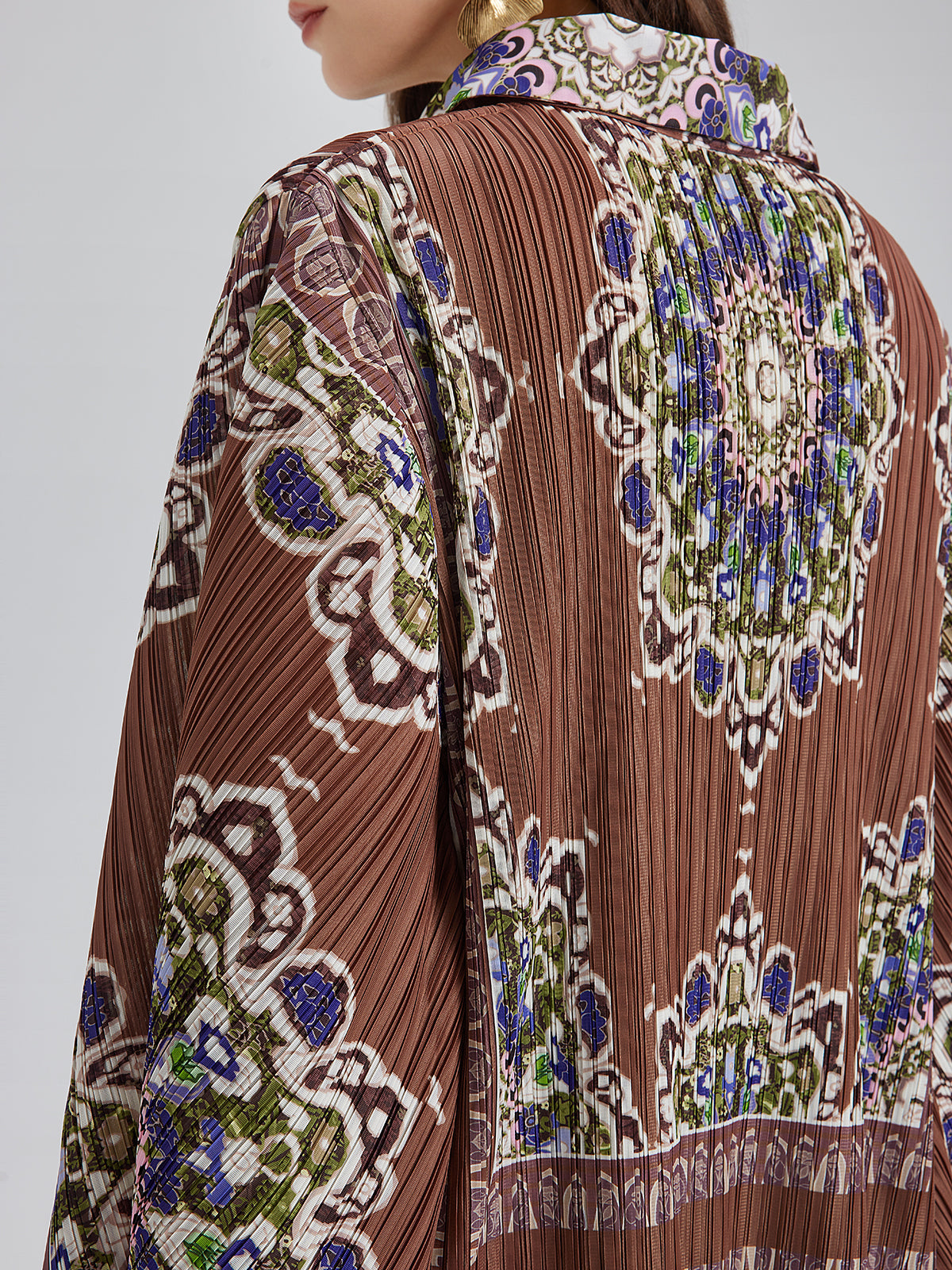 High-quality pleated fabric with vintage-inspired print. Relaxed top features, matching buttons, and an adjustable waist for versatile styling. The wide-leg pants come with an elastic waistband for added comfort and flexibility. (Comes with a matching belt.)
