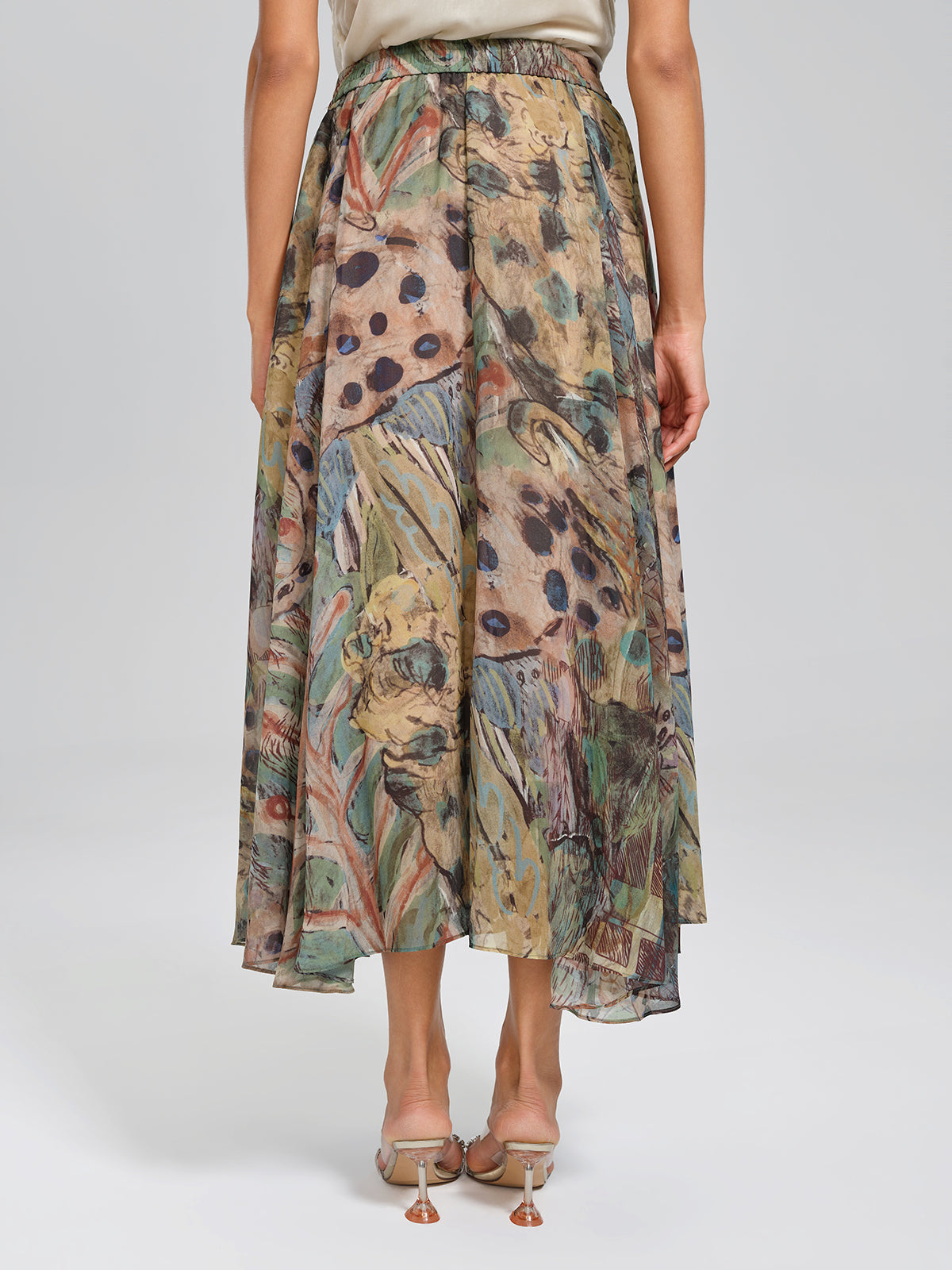 Designed with a flowing A-line silhouette and a flexible elastic waistband, this skirt offers comfort and versatility. Crafted from custom-printed fabric with soft texture, the layered color composition enhances visual depth. Effortlessly elegant, it adapts easily to a variety of occasions.