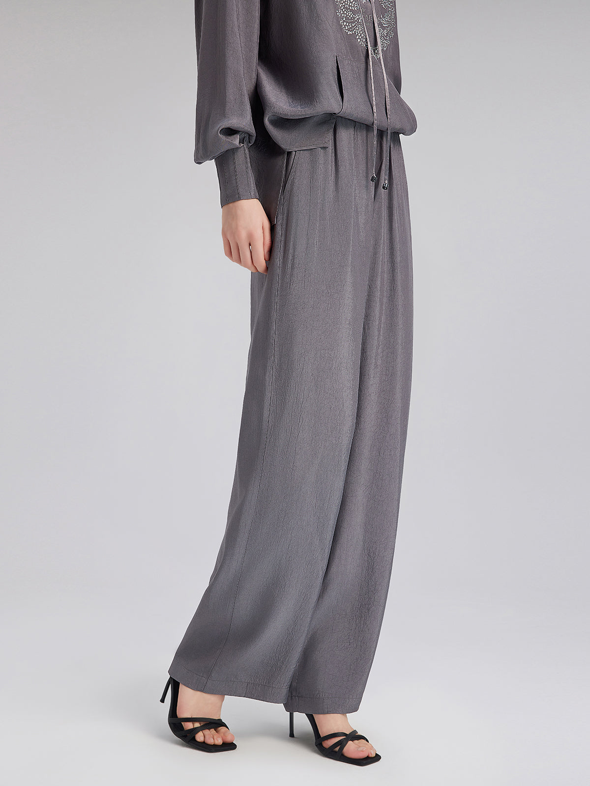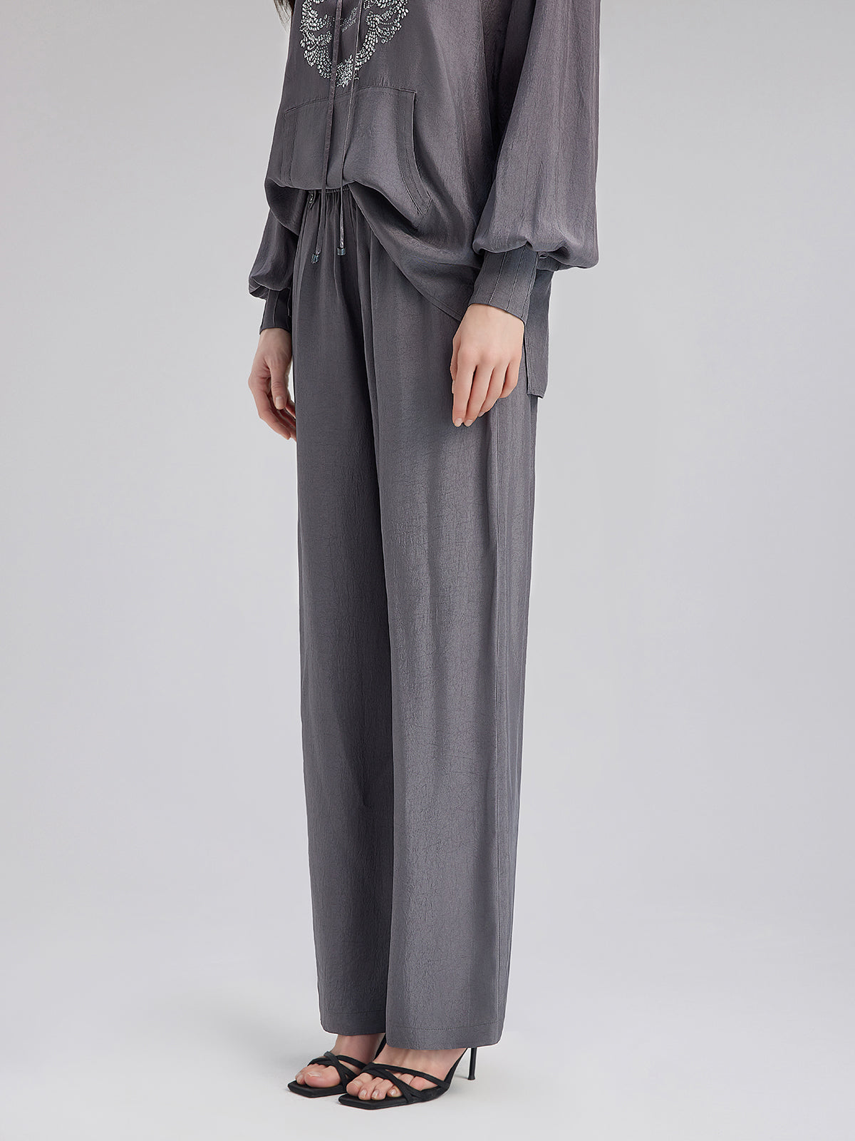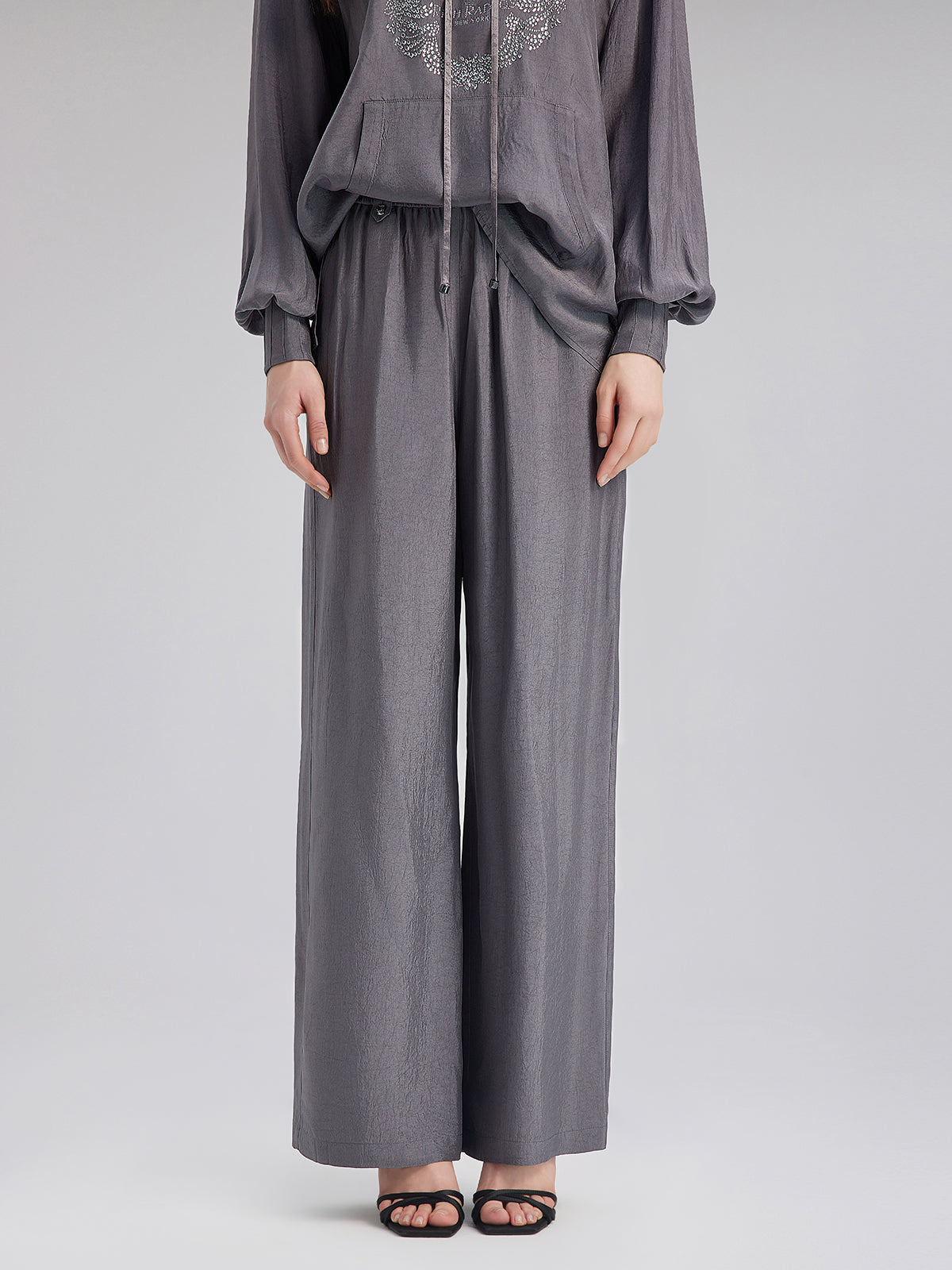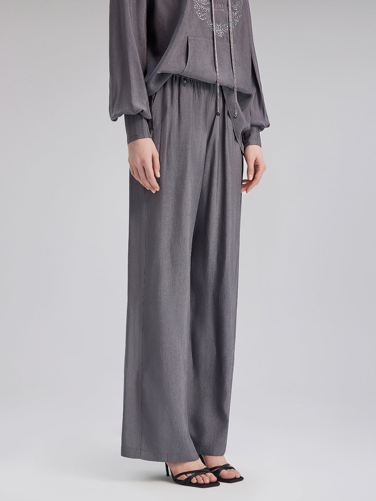 Crafted from high-quality acetate, these pants offer a silky, breathable feel. Elastic waistband with metal button detailing. Side pockets design. And a flattering high-waisted, straight-leg fit that elongates the legs. The retro-inspired drawstring features a decorative end, adding a stylish touch. Matte finish provides a sophisticated, understated look.