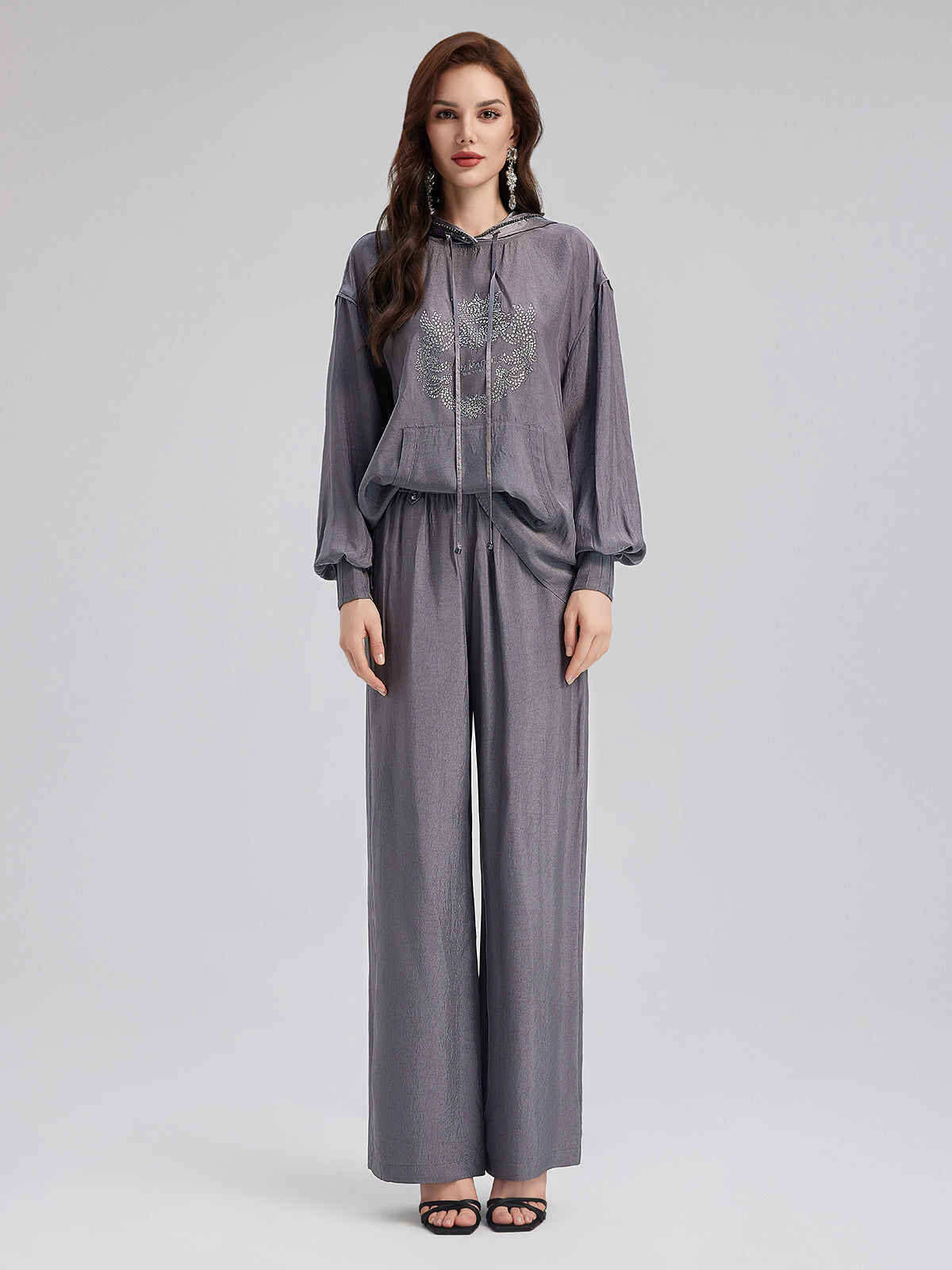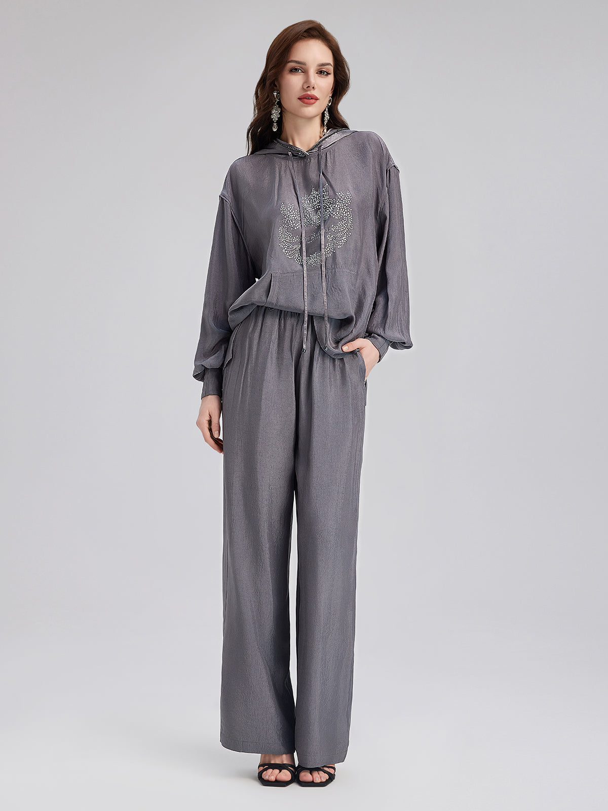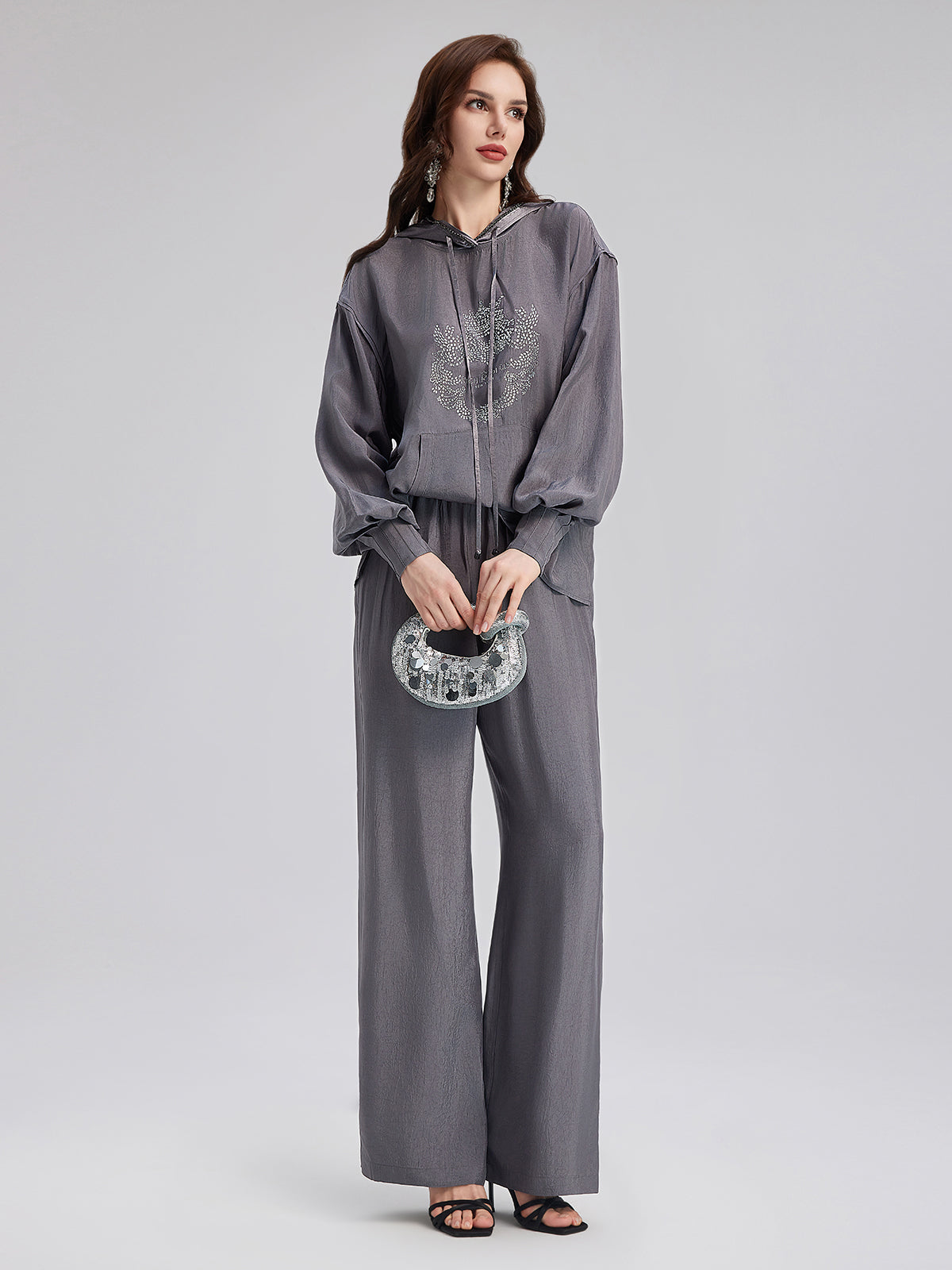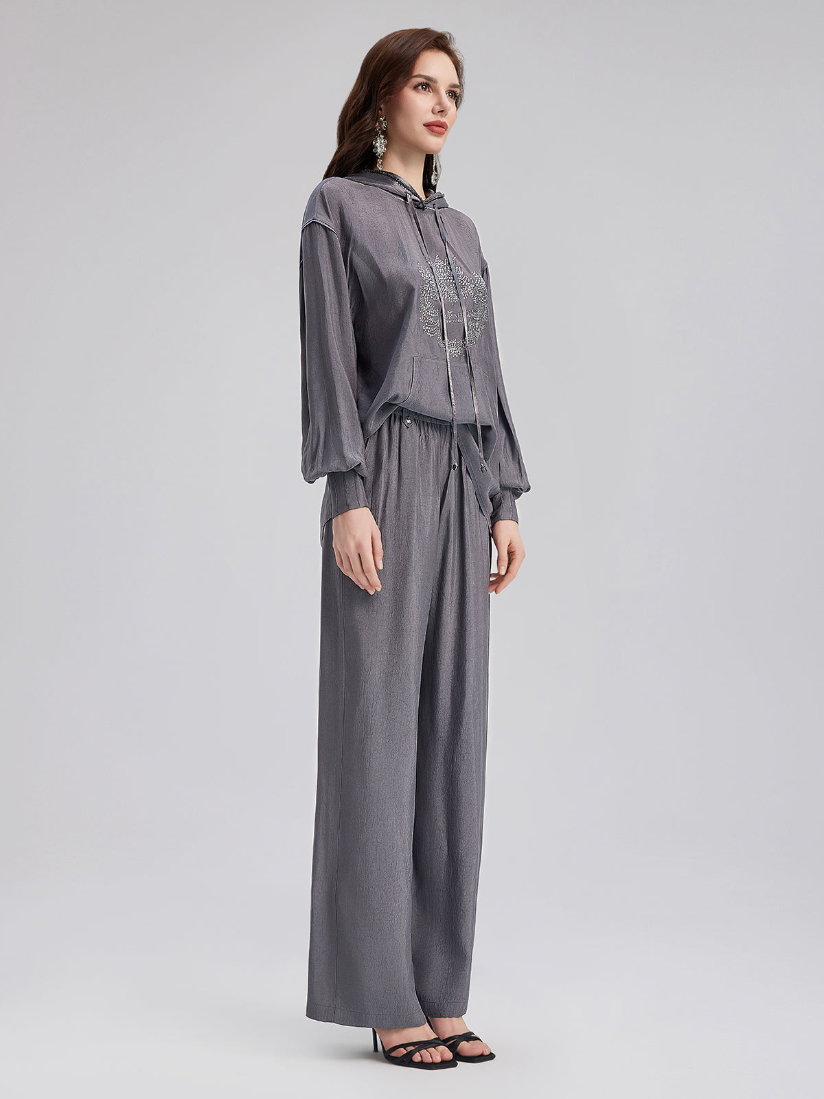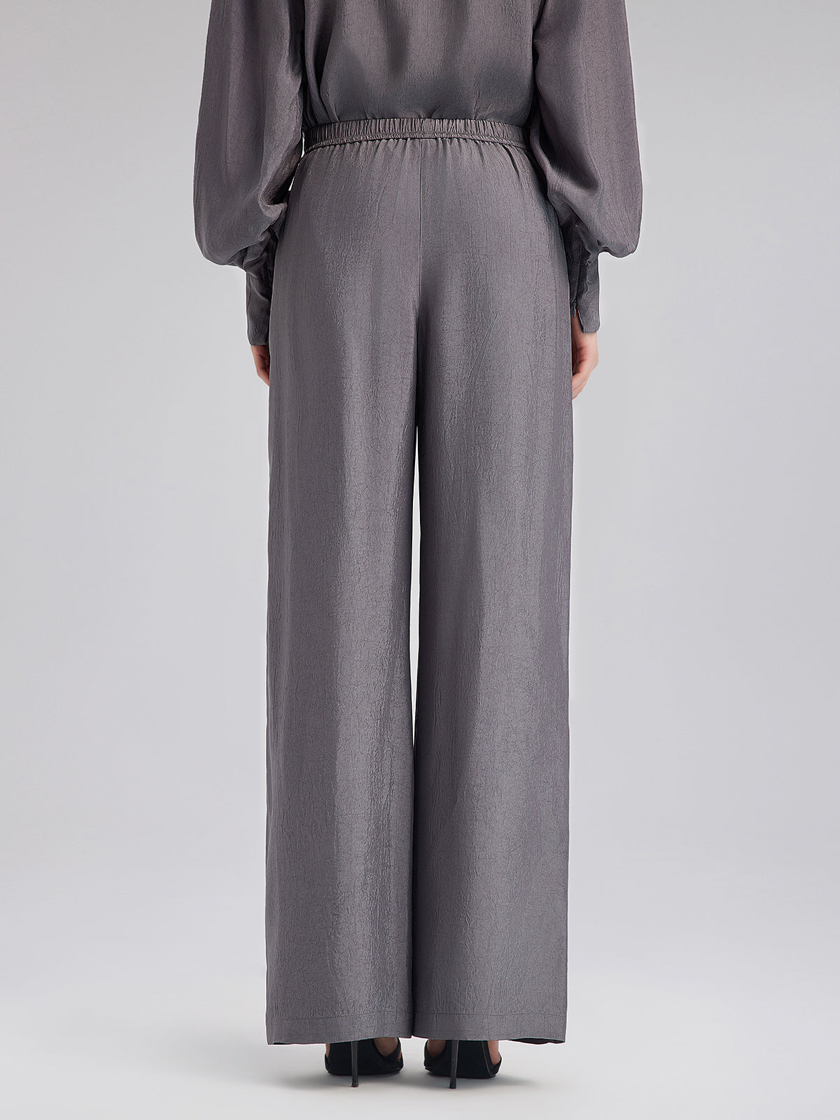 Crafted from high-quality acetate, these pants offer a silky, breathable feel. Elastic waistband with metal button detailing. Side pockets design. And a flattering high-waisted, straight-leg fit that elongates the legs. The retro-inspired drawstring features a decorative end, adding a stylish touch. Matte finish provides a sophisticated, understated look.