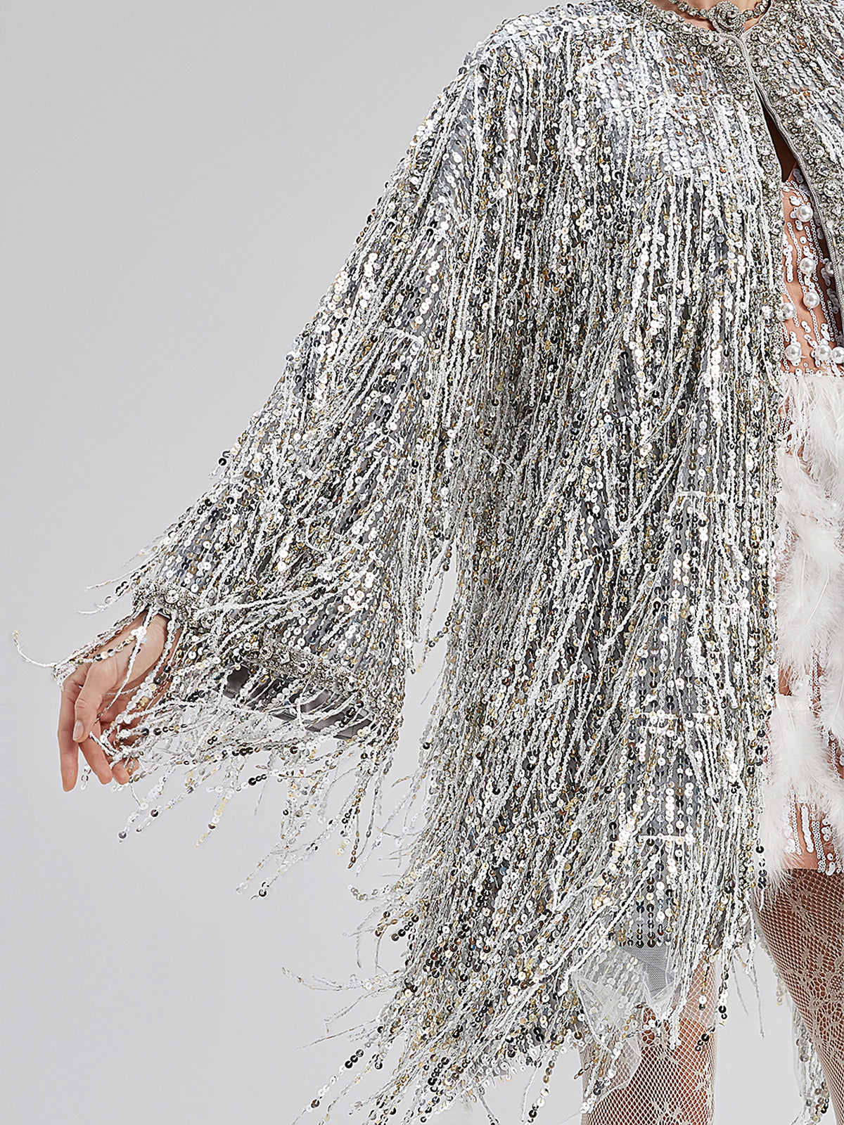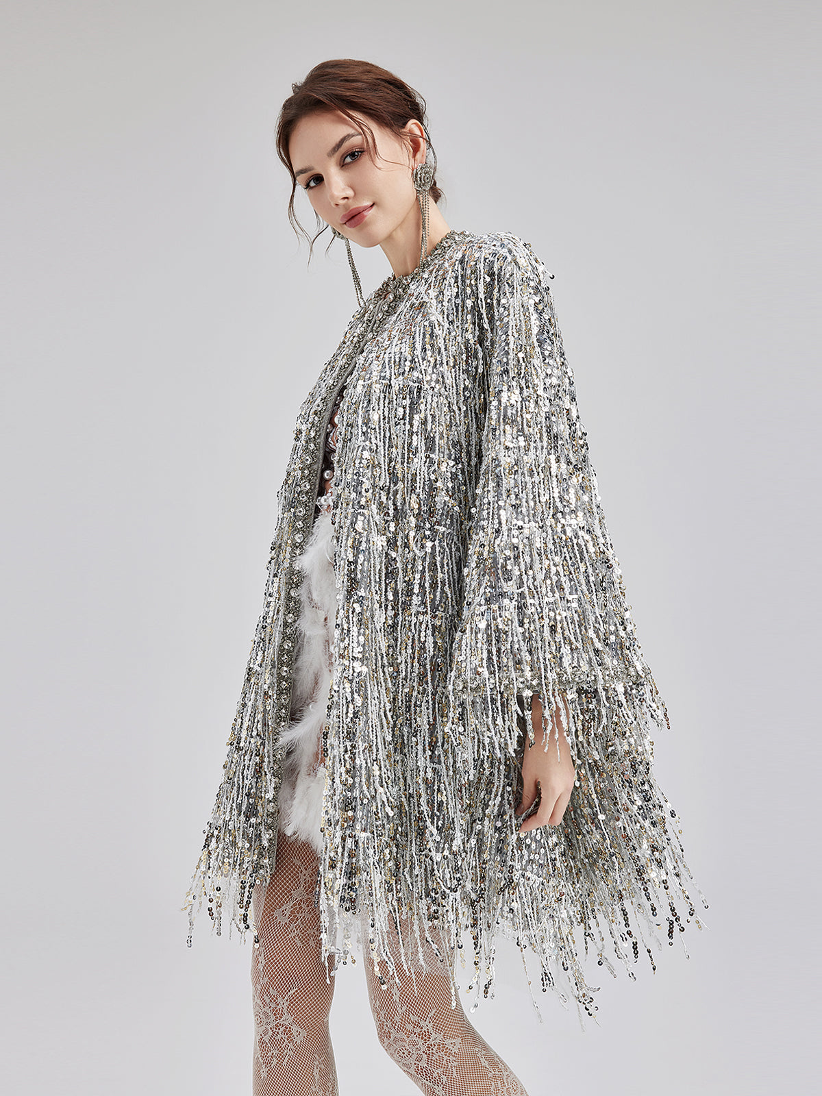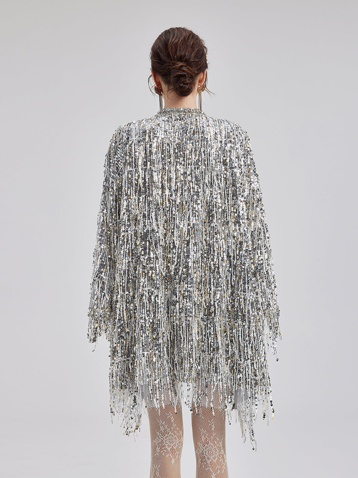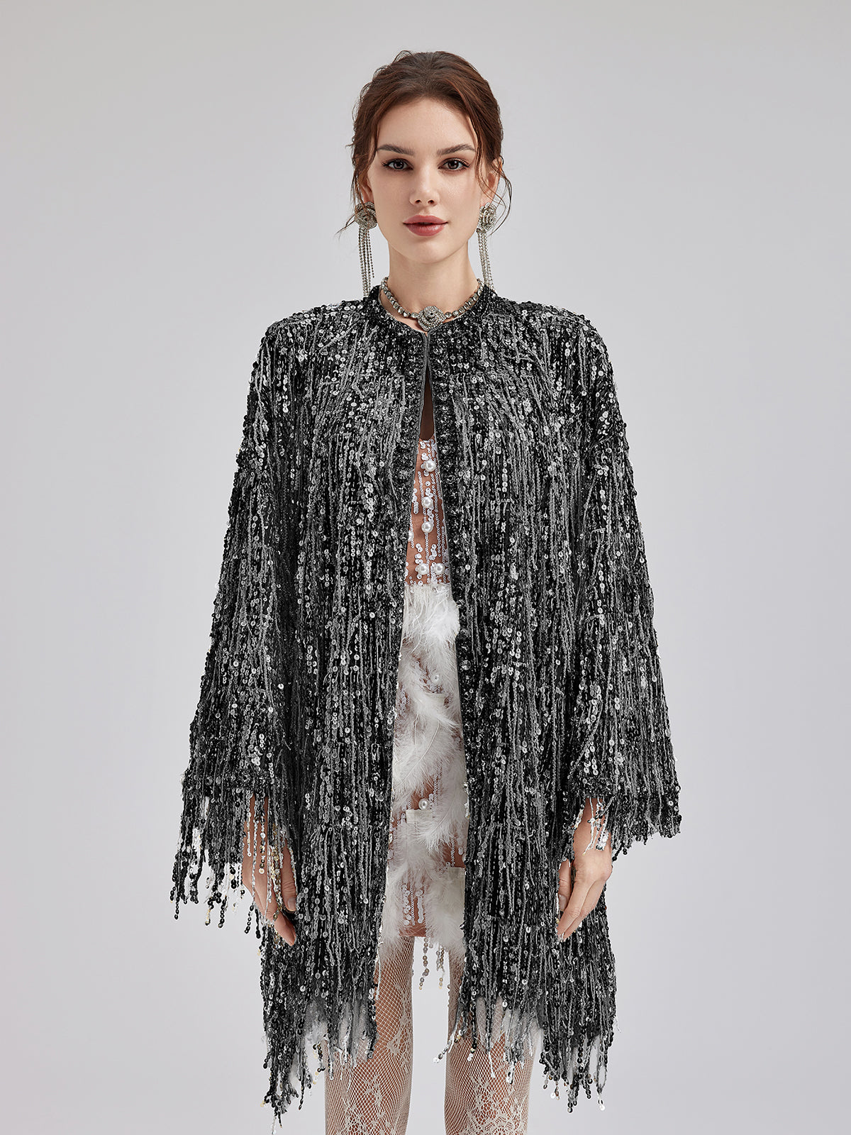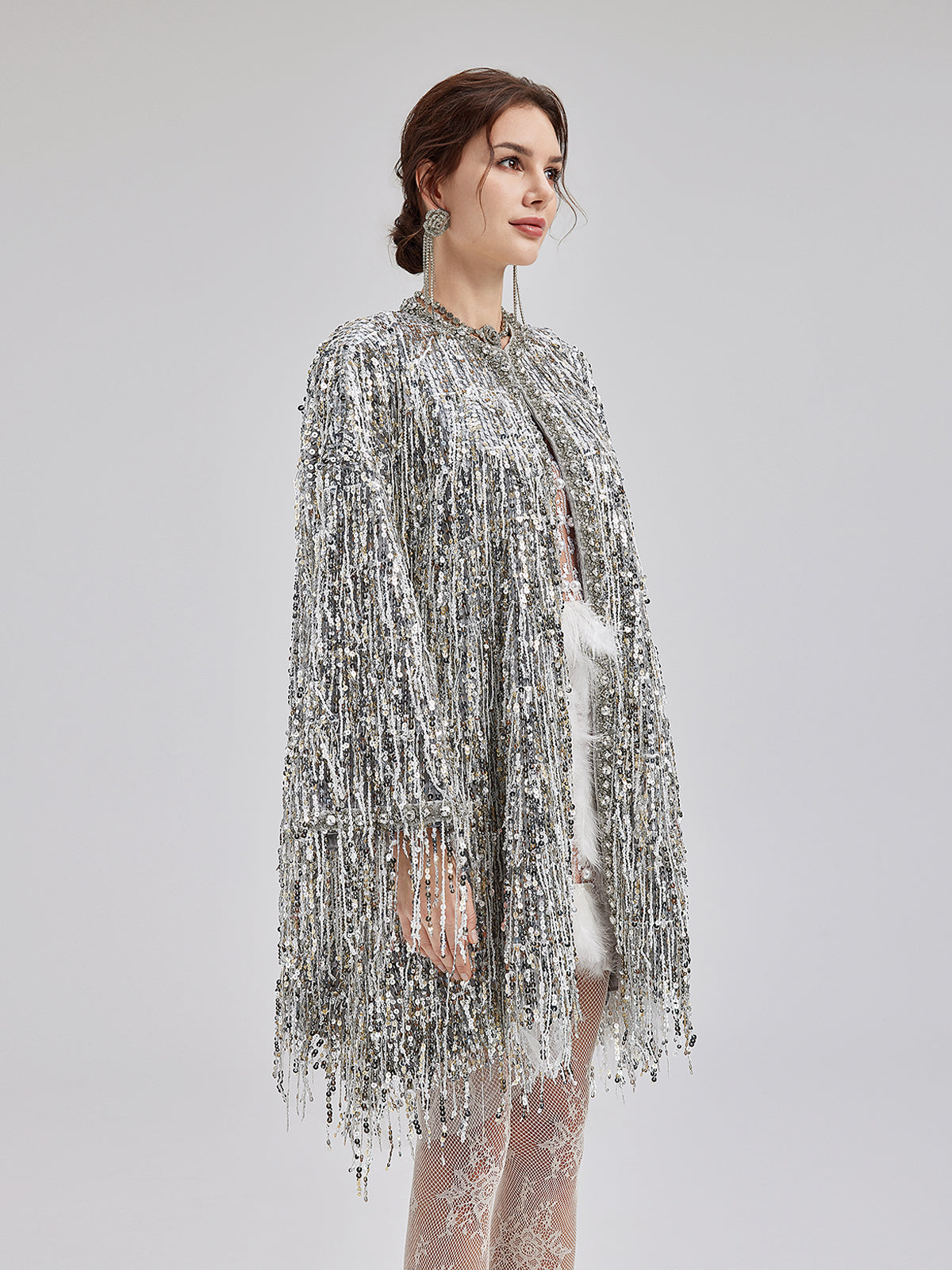 Sequin Beaded Tassel Cape Coat