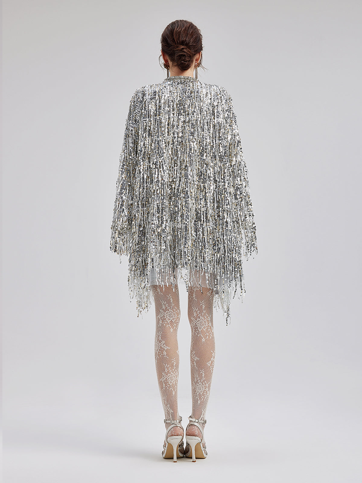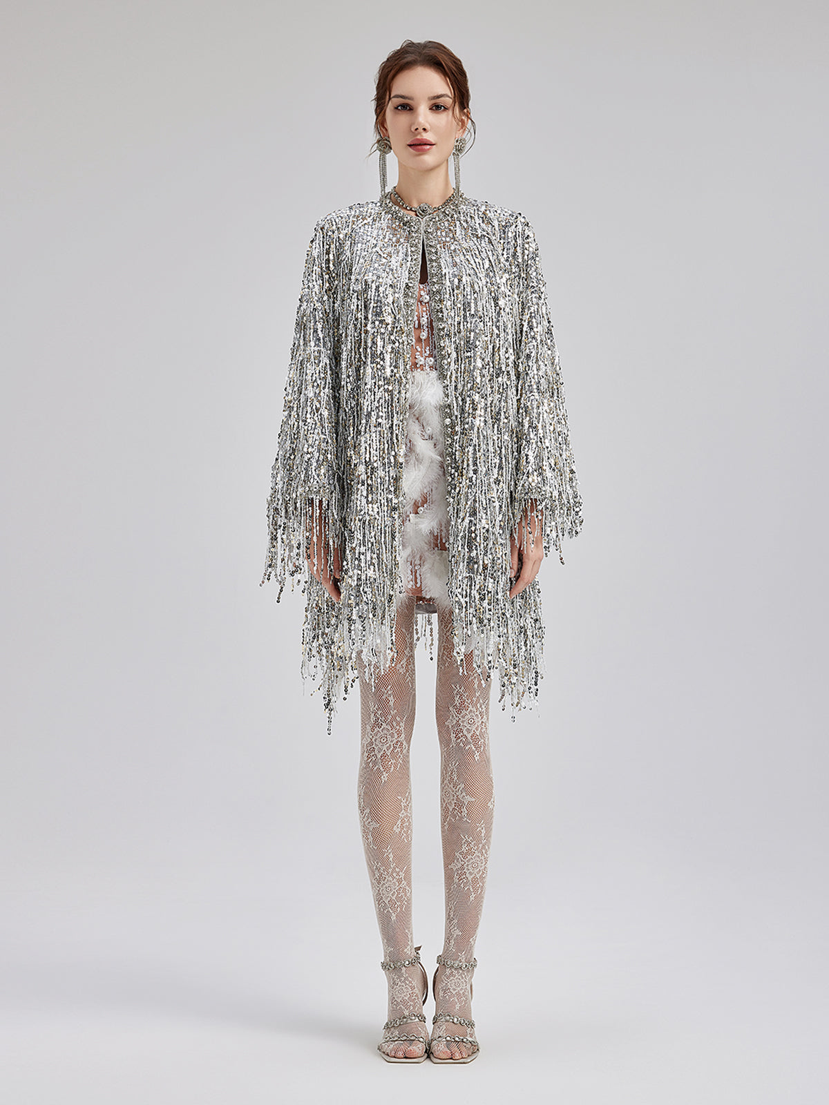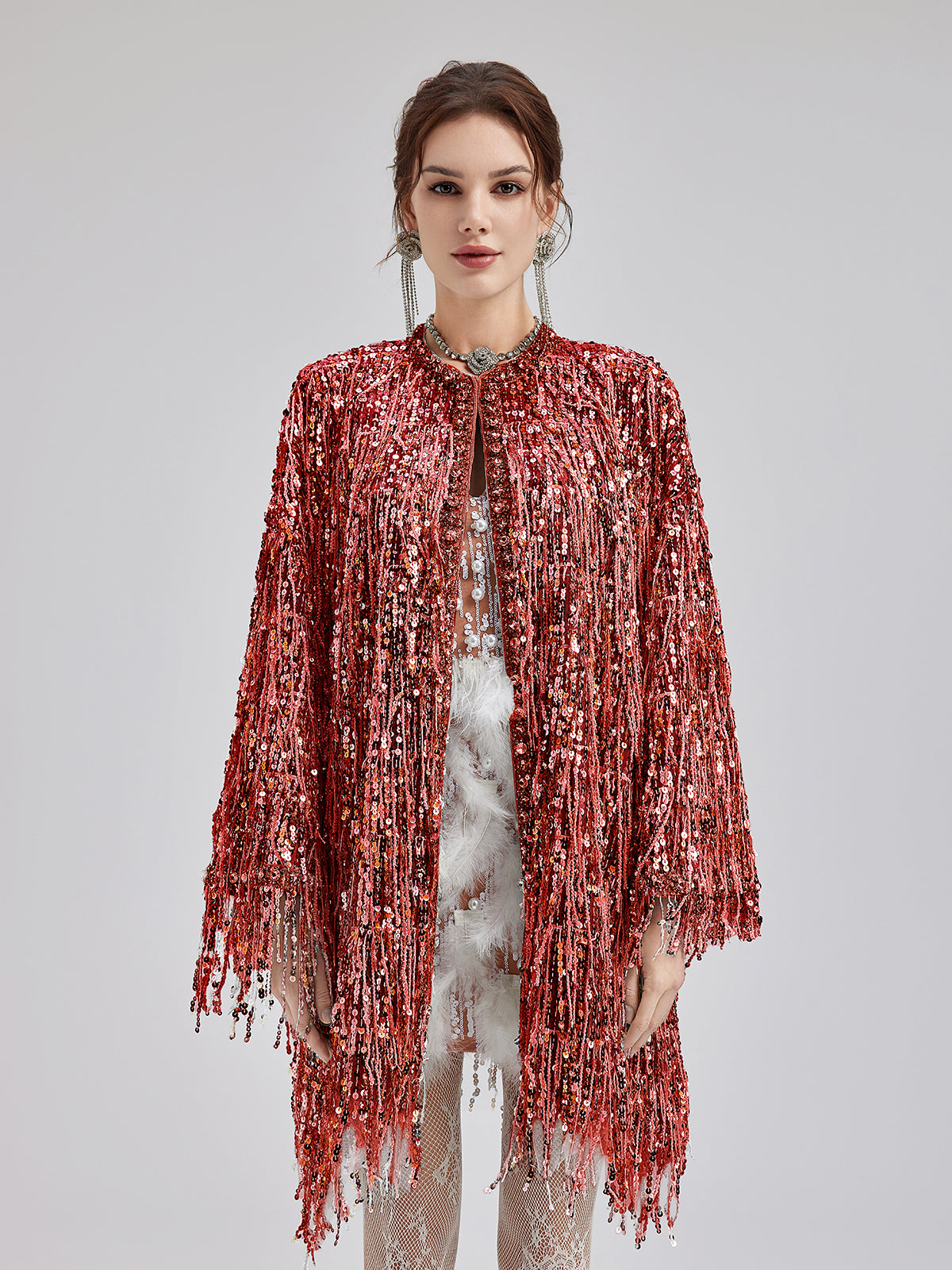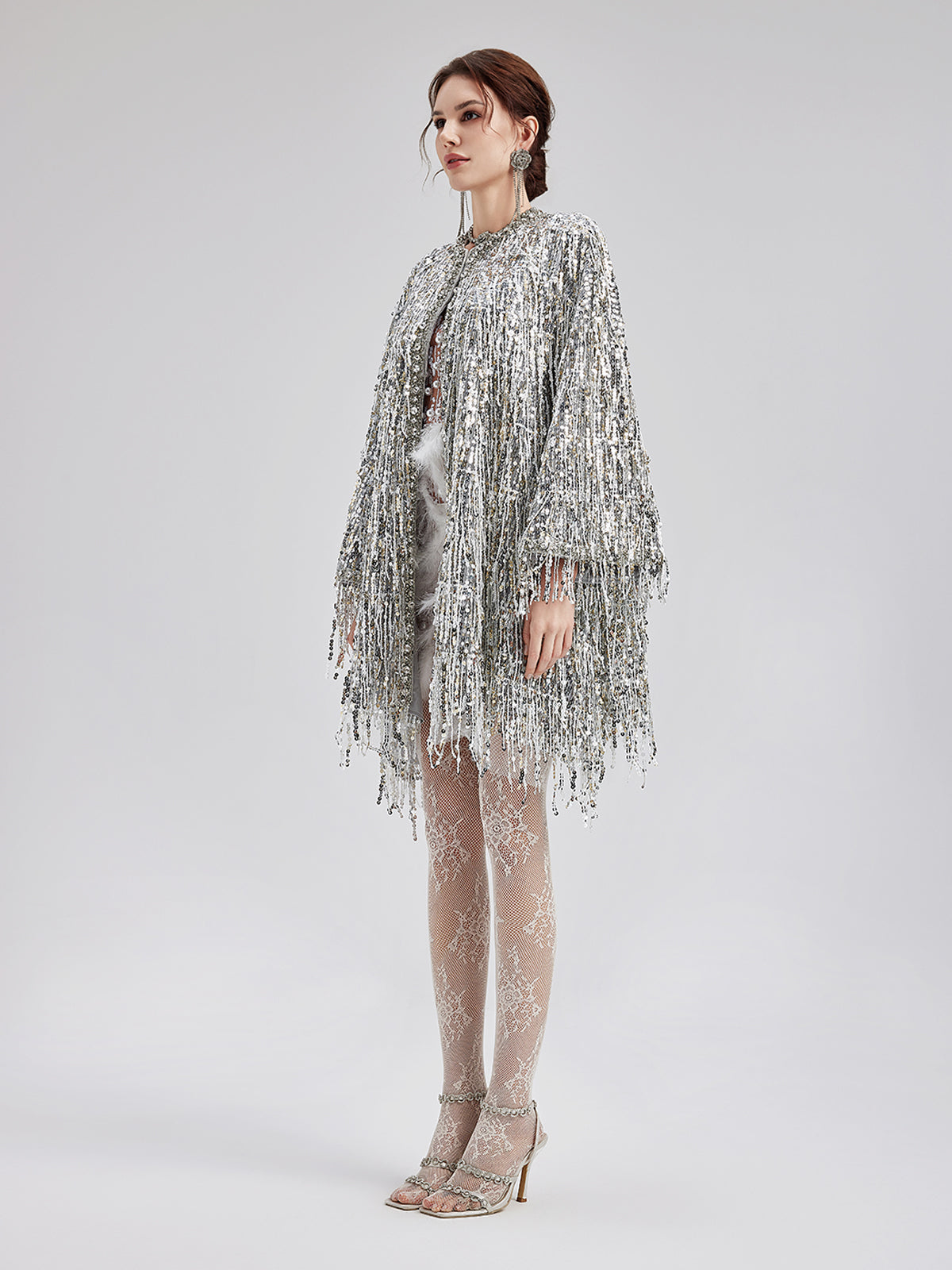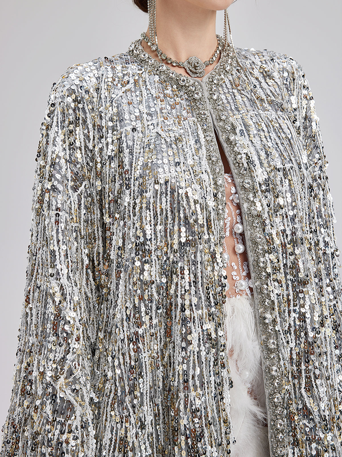 Sequin Beaded Tassel Cape Coat