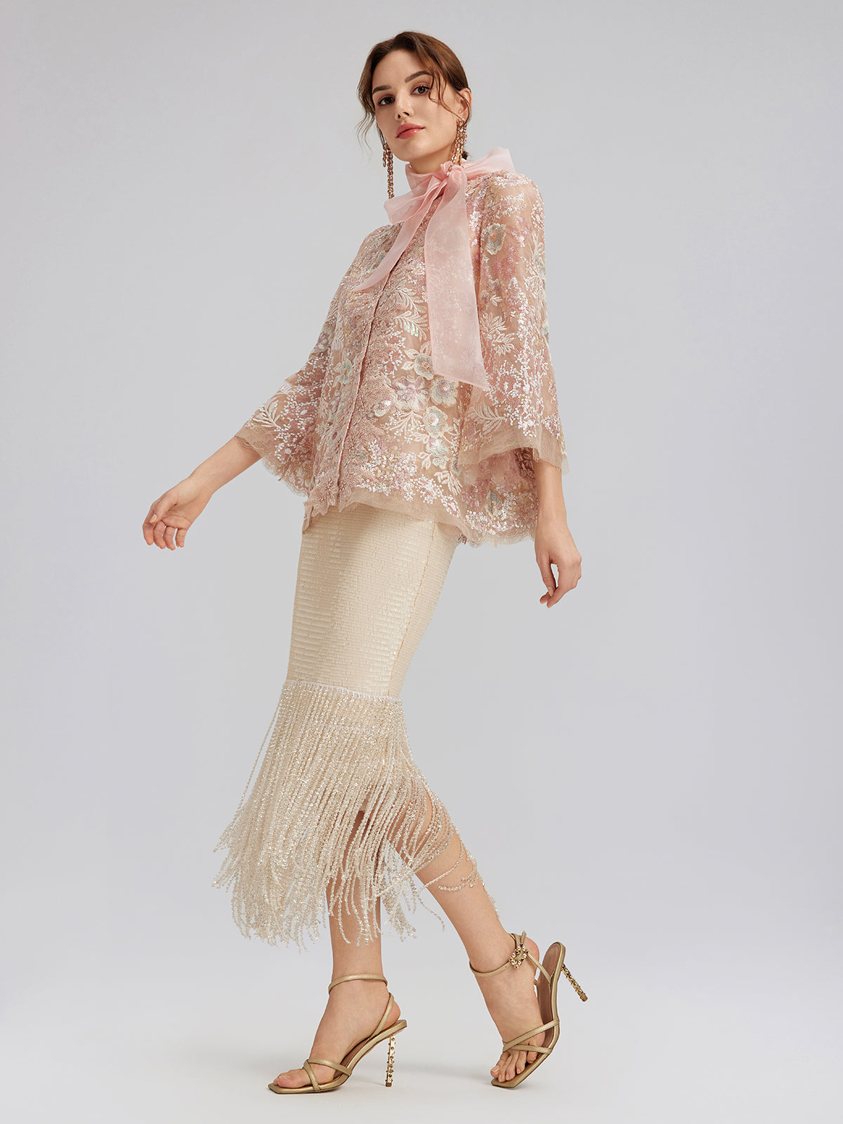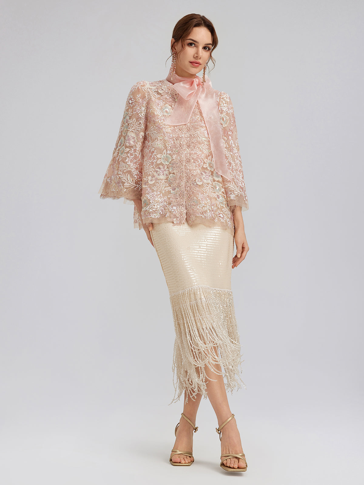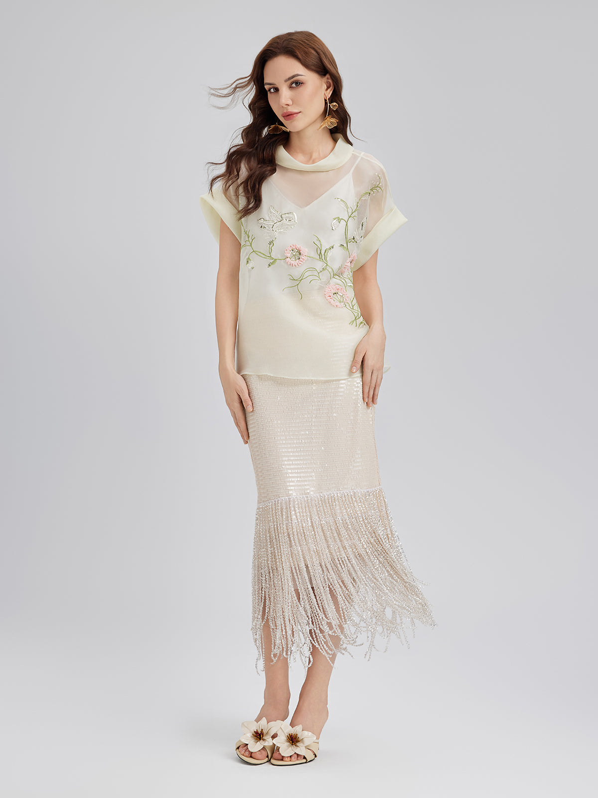 This skirt features sequin and crystal bead embellishments for a dazzling effect. Fringe details add movement and texture. A back slit enhances leg lines and mobility. The right-side invisible zipper maintains a smooth silhouette. Slightly stretchy fabric provides comfort, while the knit lining enhances softness and body inclusivity.