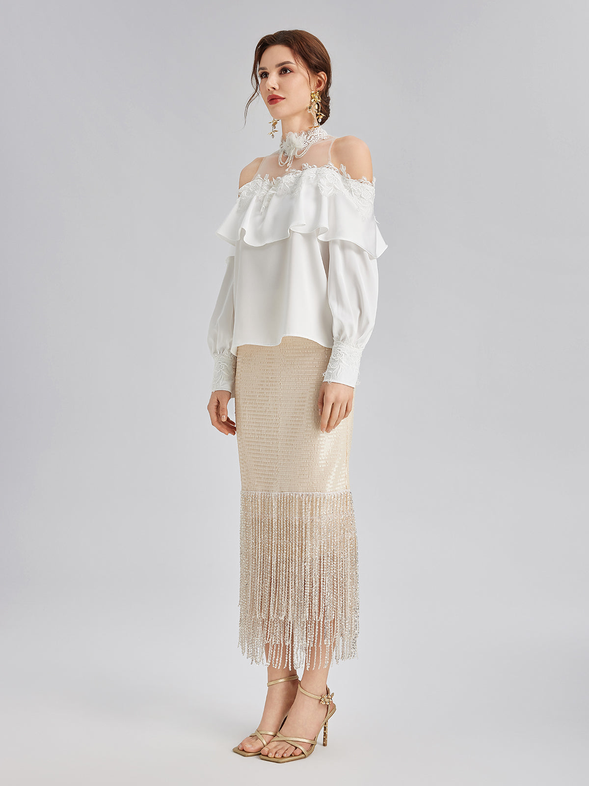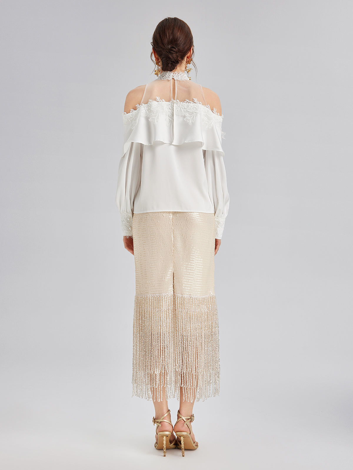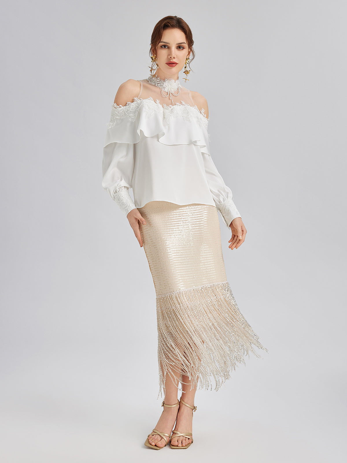This skirt features sequin and crystal bead embellishments for a dazzling effect. Fringe details add movement and texture. A back slit enhances leg lines and mobility. The right-side invisible zipper maintains a smooth silhouette. Slightly stretchy fabric provides comfort, while the knit lining enhances softness and body inclusivity.