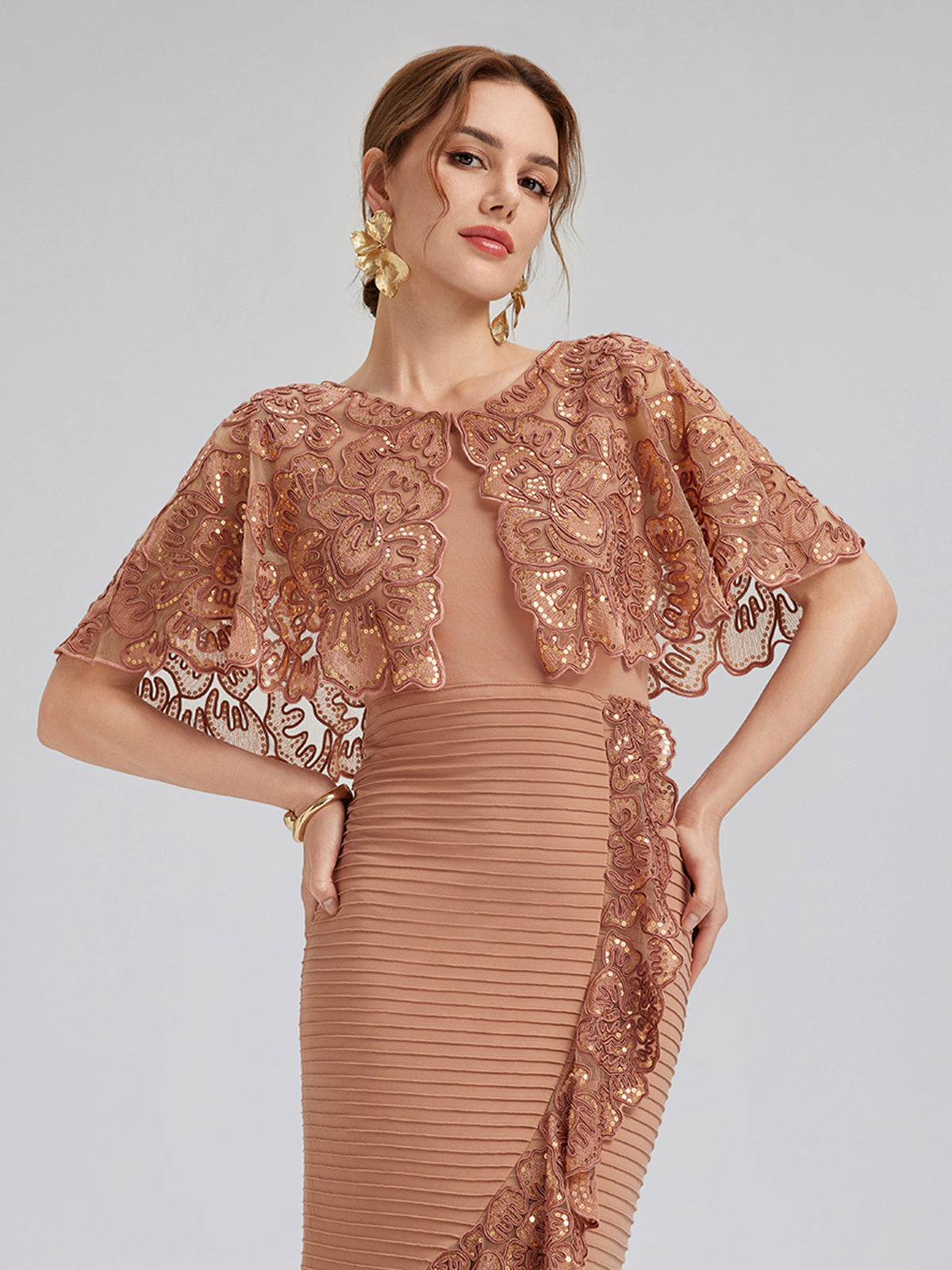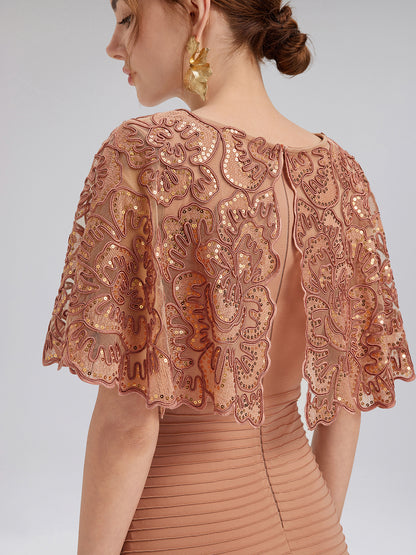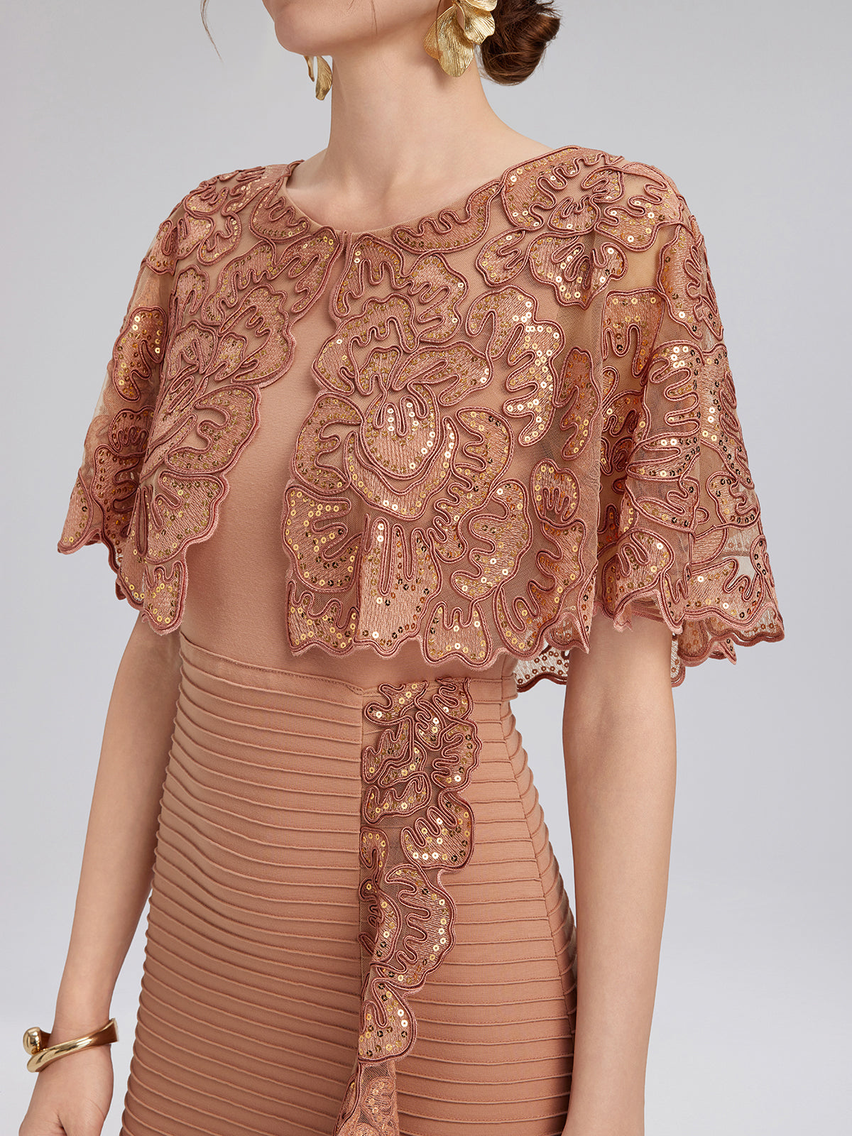 Dimensional embroidery adds a refined, feminine touch, enhanced by soft sequin accents that shimmer subtly. Pleated detailing shapes the body with ease, and the asymmetric hem lends movement and modern edge. With light stretch and a concealed back zip, it's structured yet easy to wear.