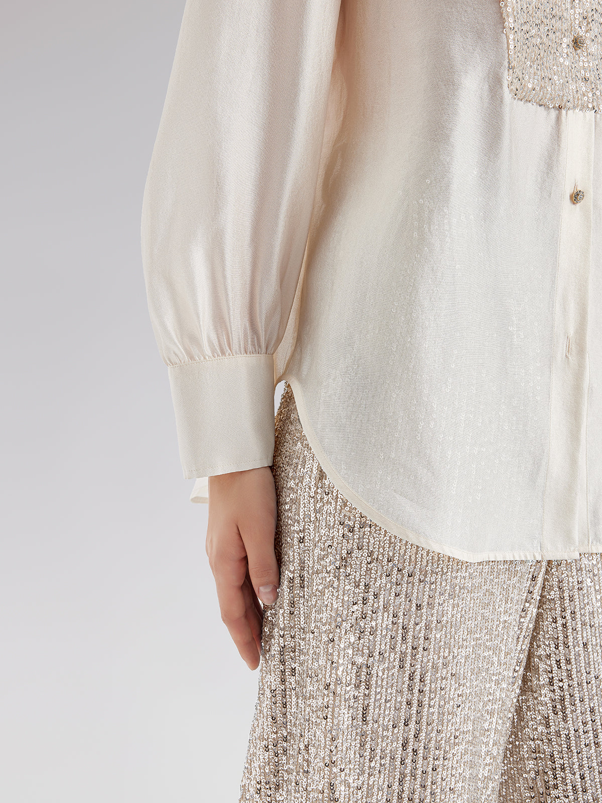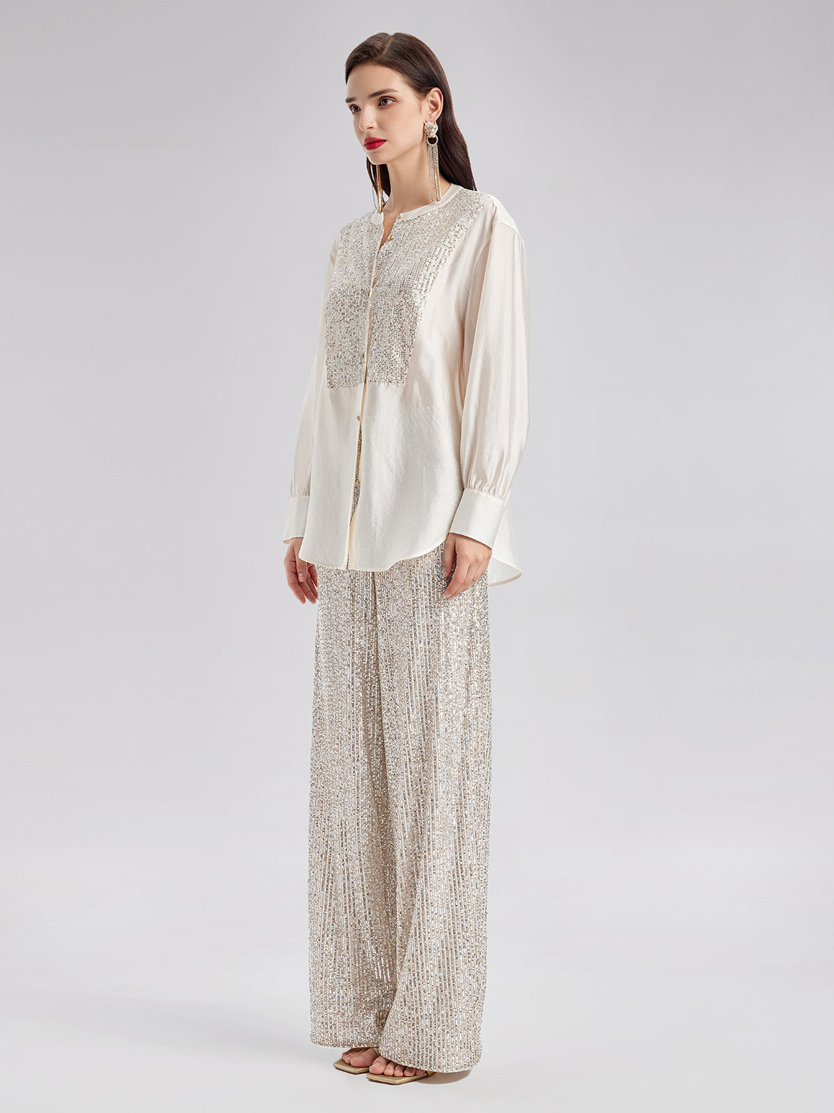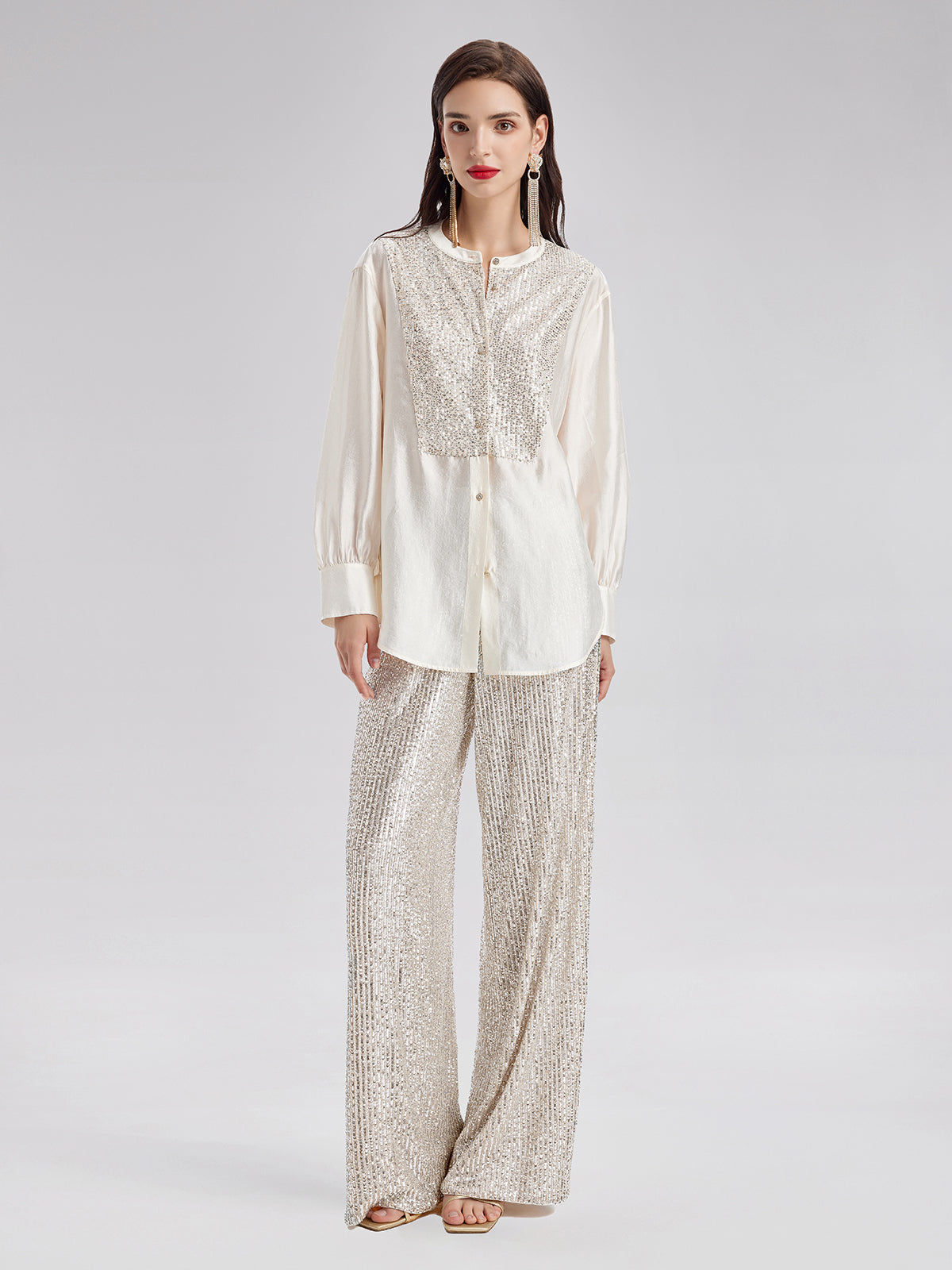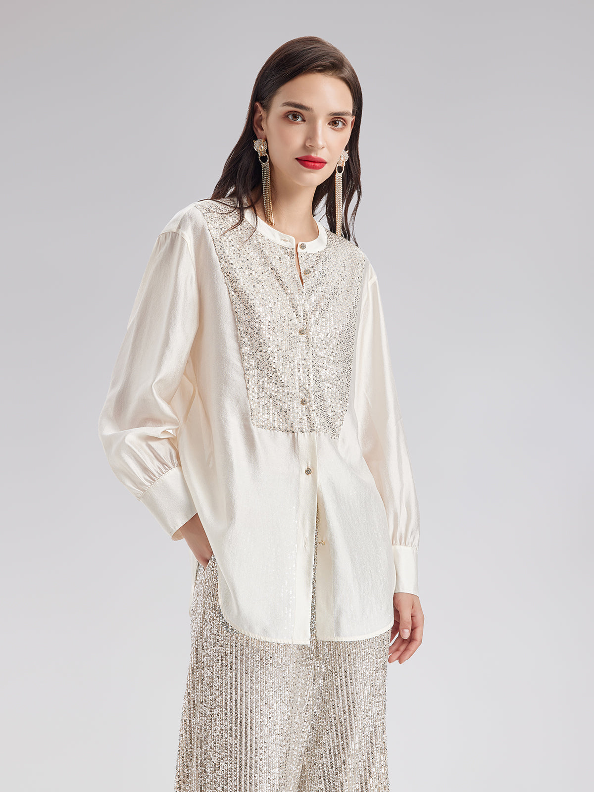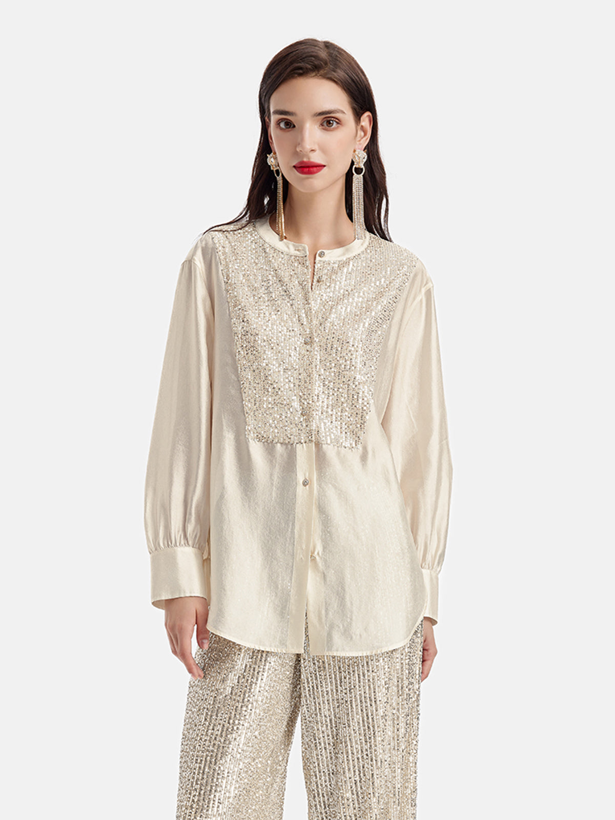 This shirt features high-quality sequin stitching for a unique visual effect, showcasing exquisite details. The collarless design enhances the necklines, adding an elegant touch while effortlessly creating a relaxed, natural style. Perfect for daily outings, dates, or the workplace, it allows the wearer to stand out on various occasions.