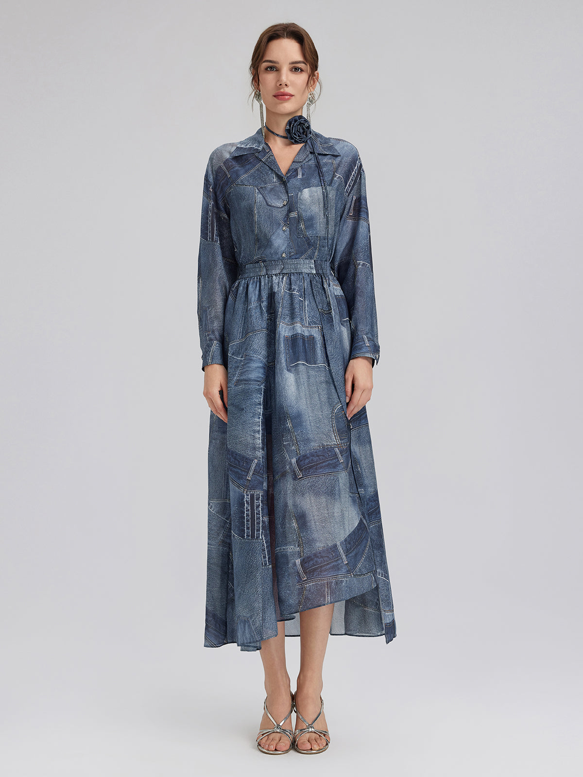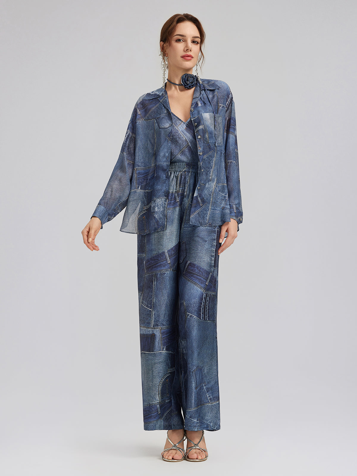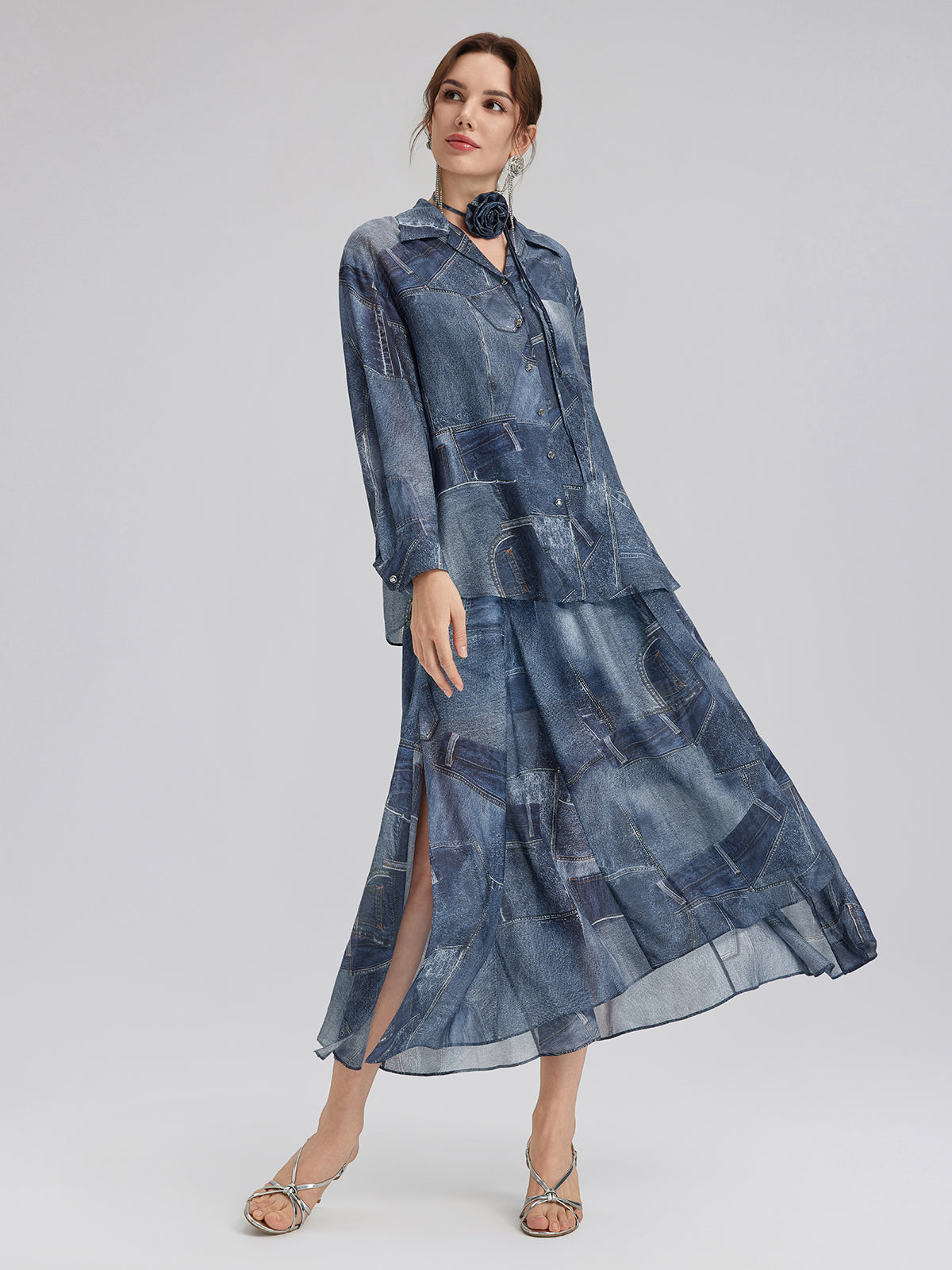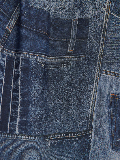 Crafted from soft, smooth silk chiffon for a lightweight, breathable feel. Features a unique artistic touch with reworked denim print details. Relaxed fit offers comfortable ease and freedom of movement.