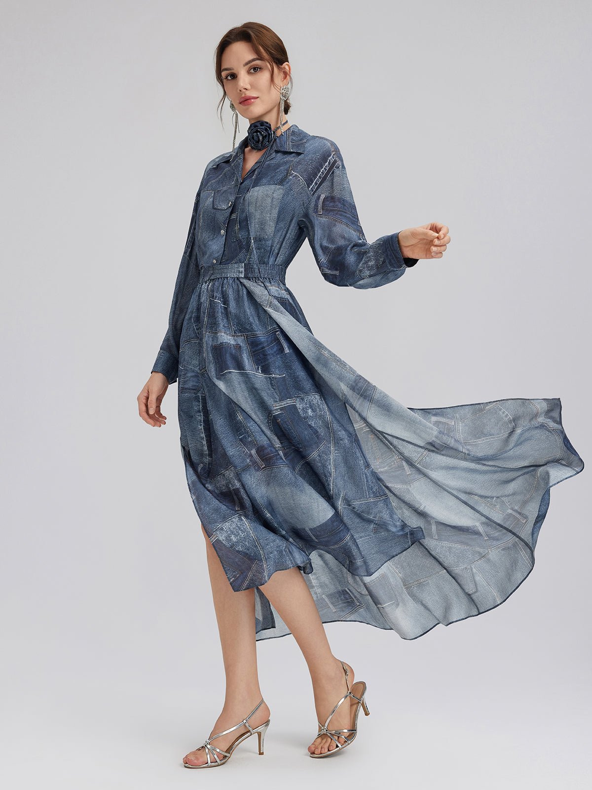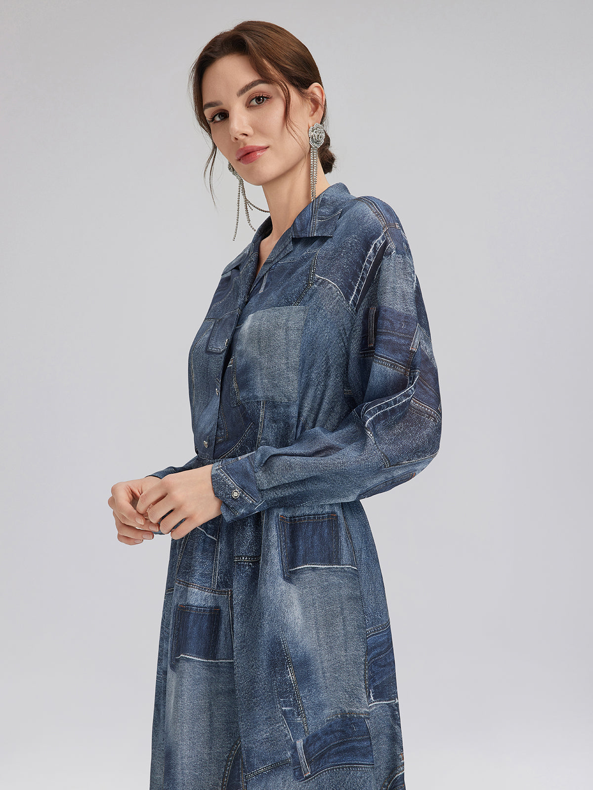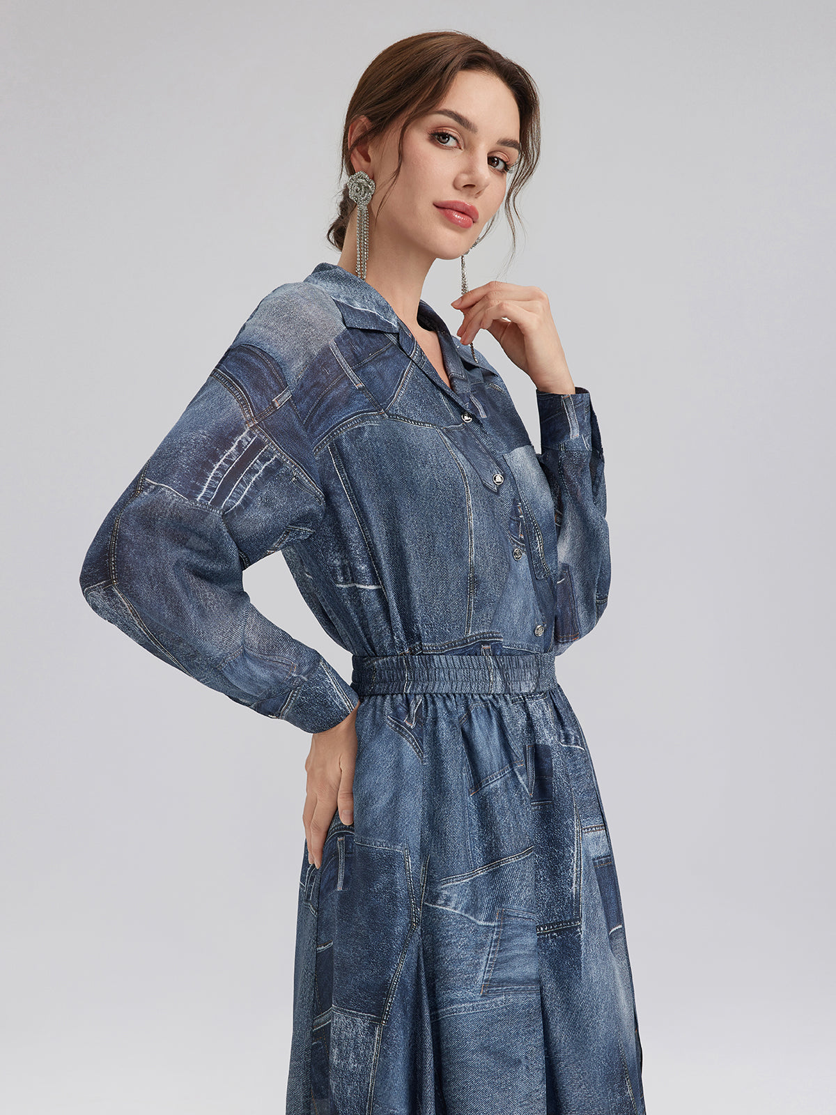 Crafted from soft, smooth silk chiffon for a lightweight, breathable feel. Features a unique artistic touch with reworked denim print details. Relaxed fit offers comfortable ease and freedom of movement.