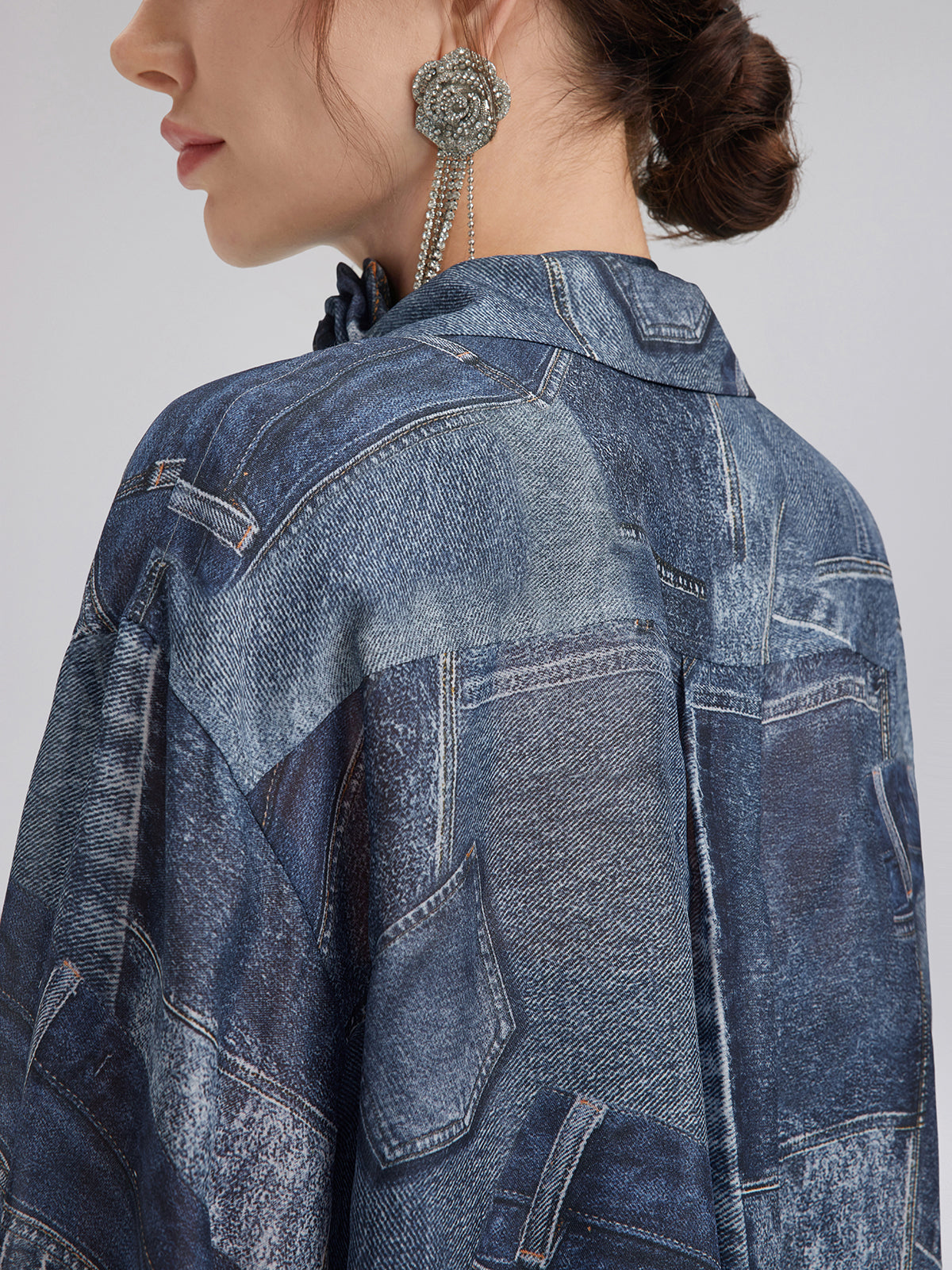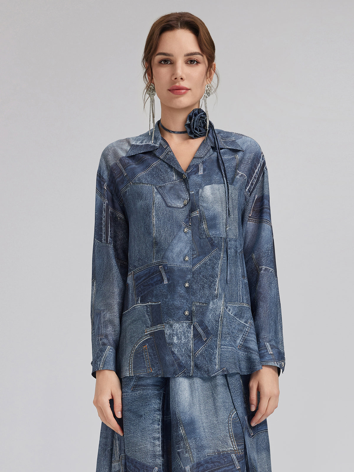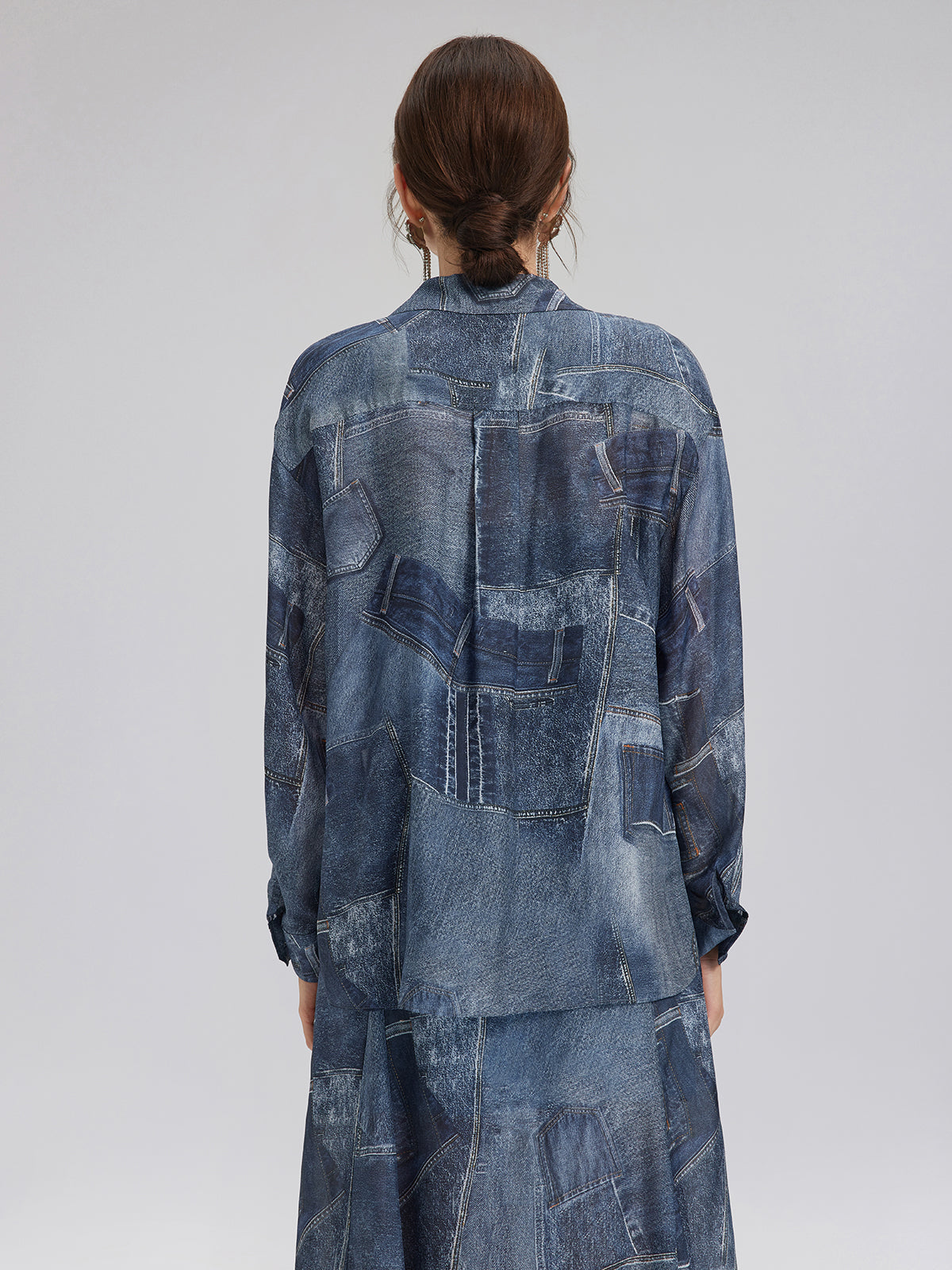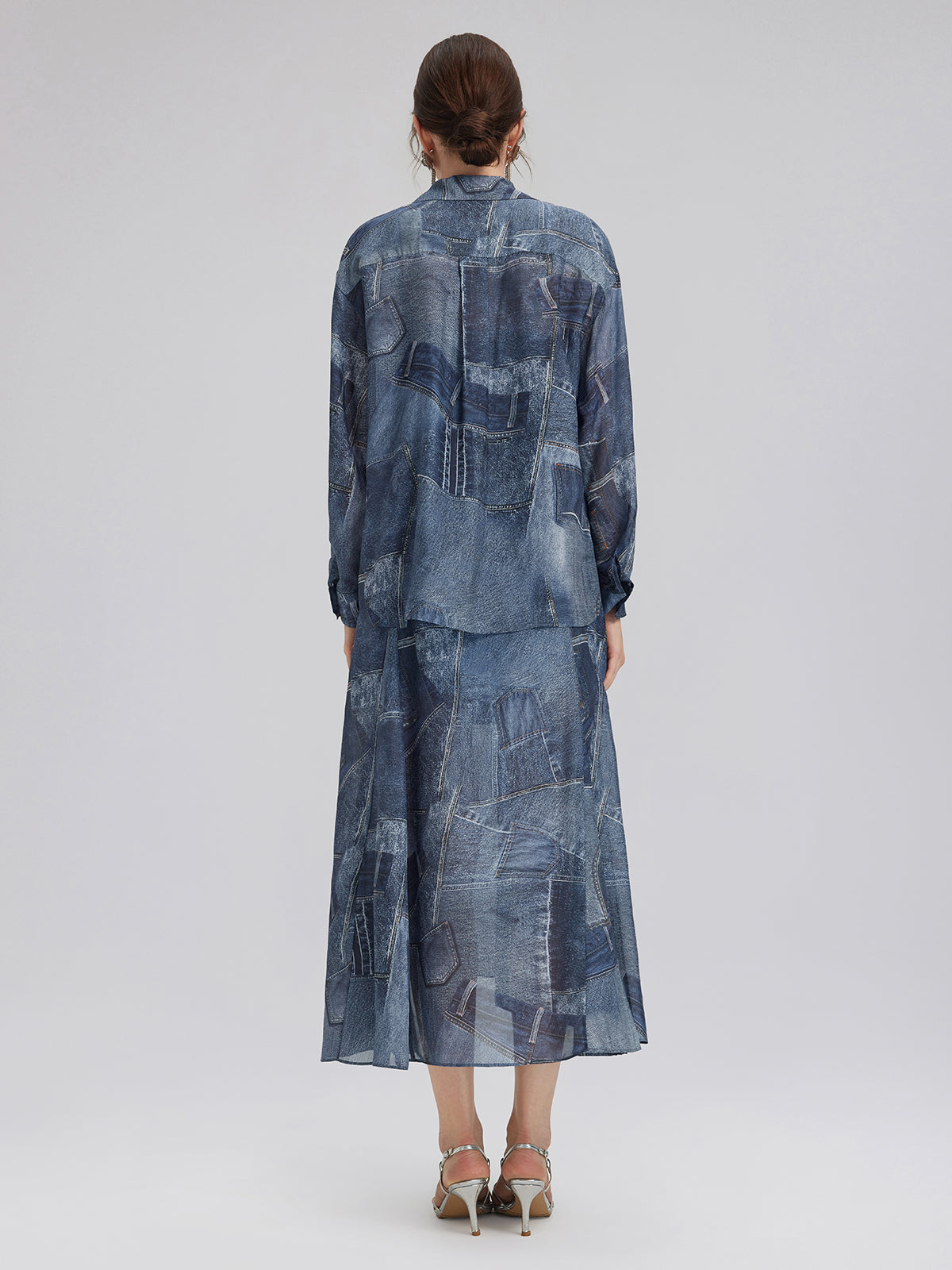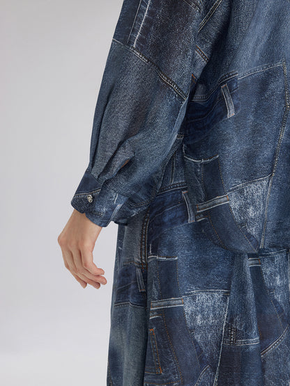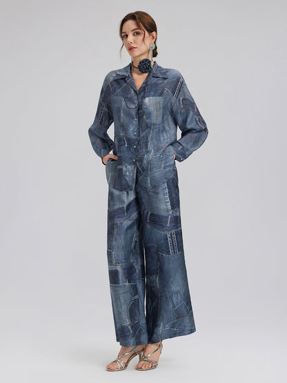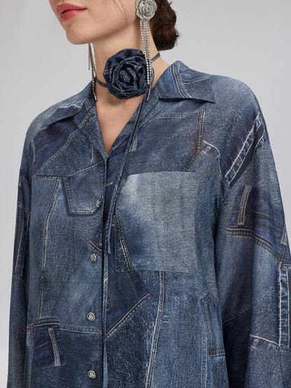 Silk Chiffon Denim-Print Shirt