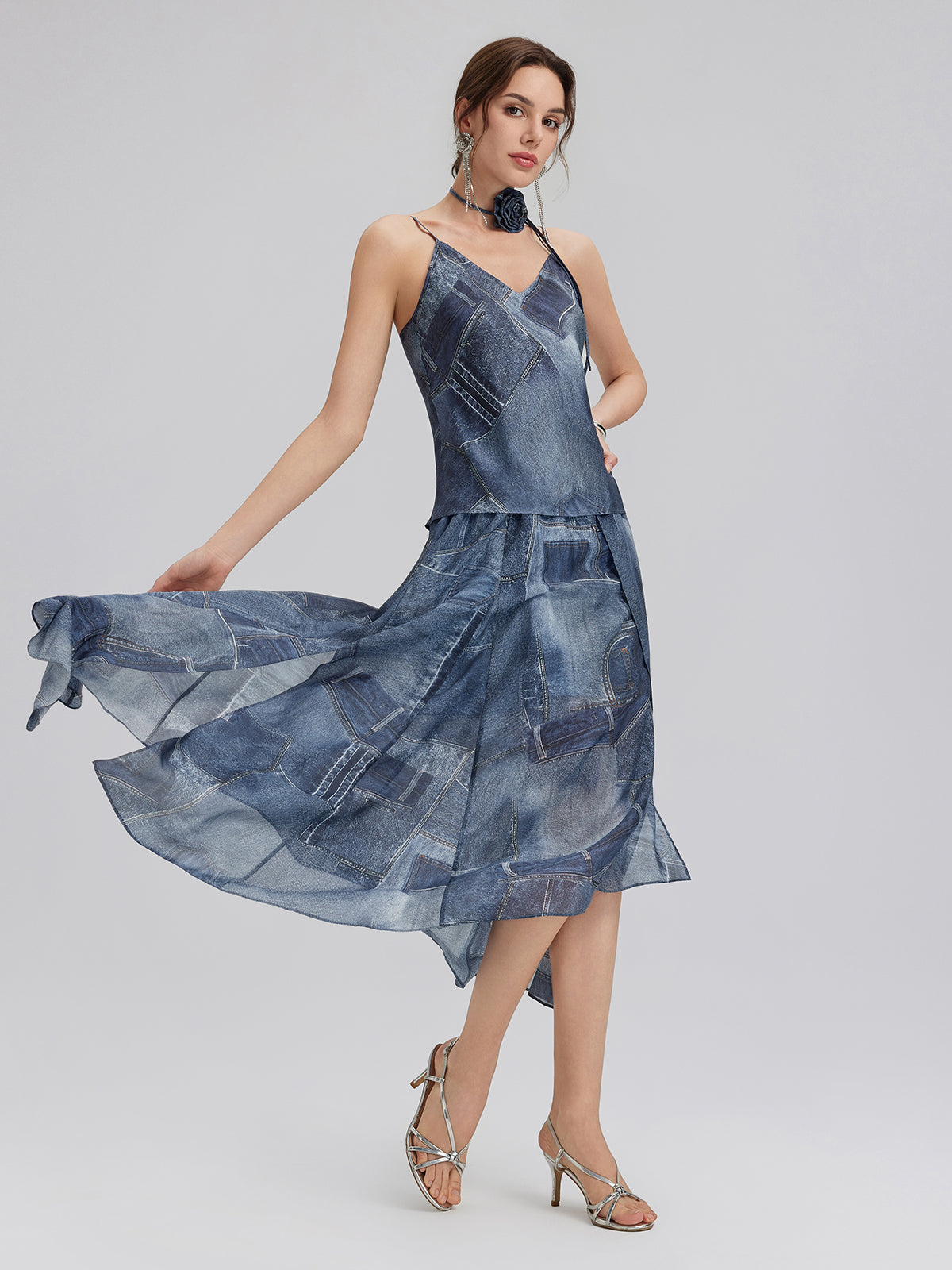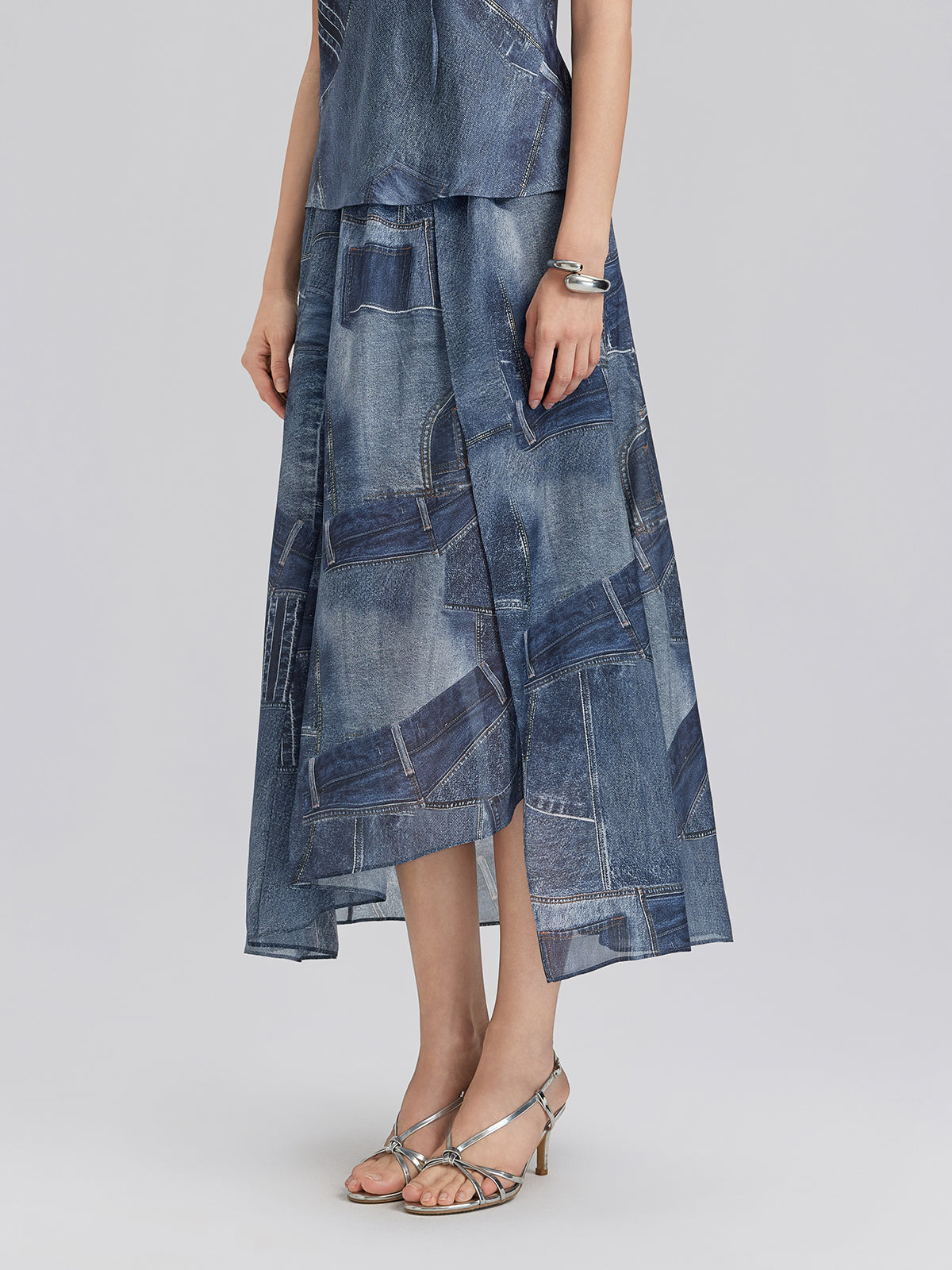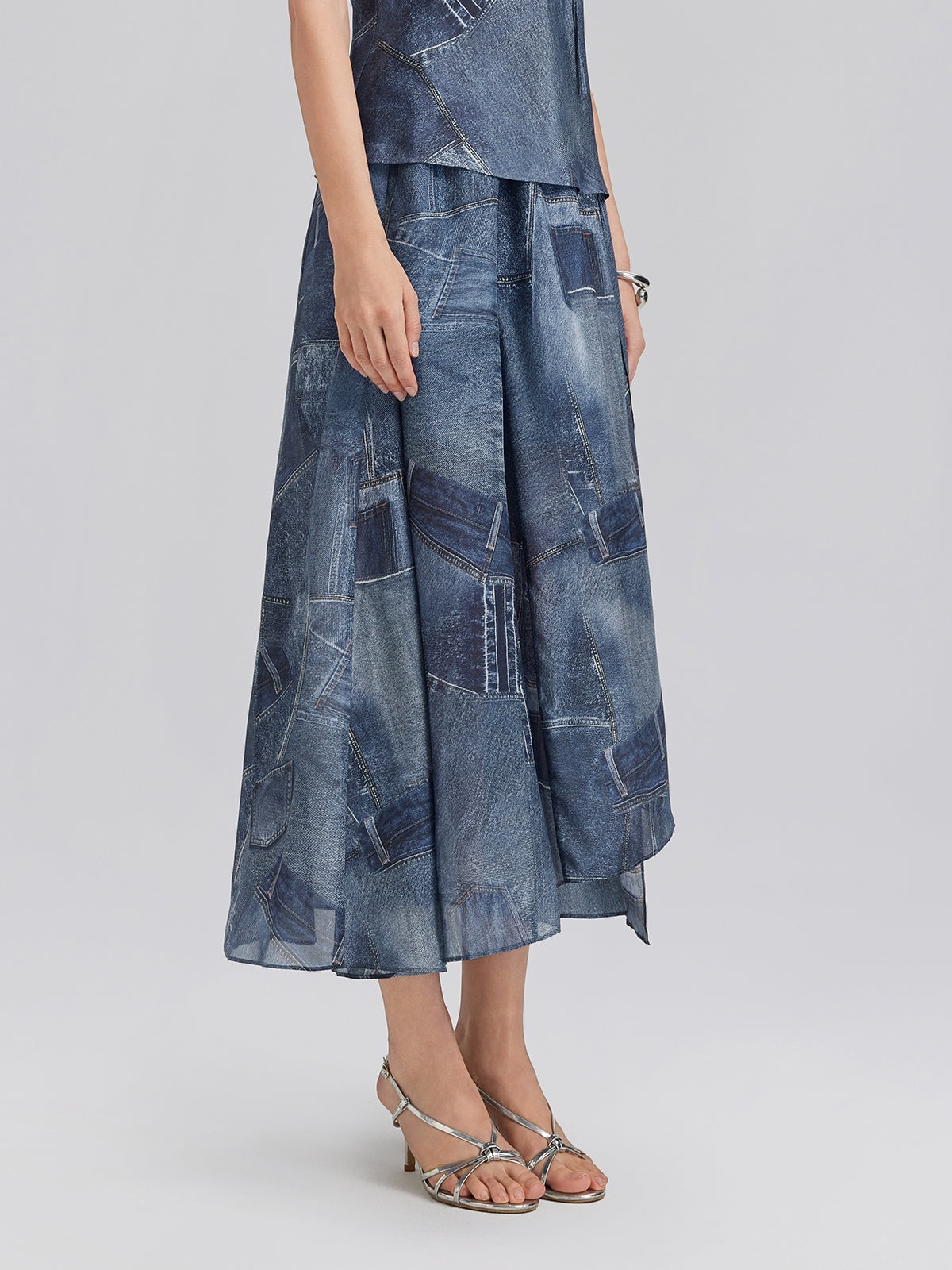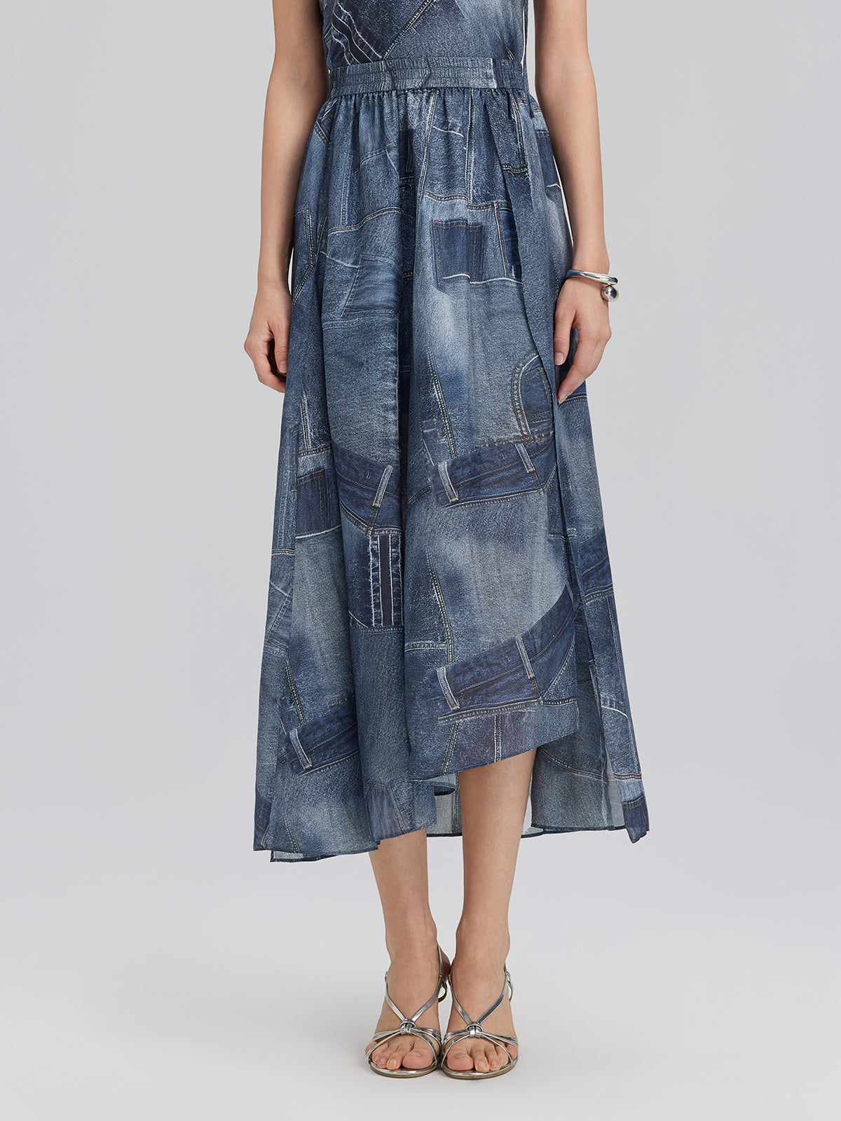 Made from soft, smooth silk chiffon that’s lightweight and breathable. Features reworked denim print details for a unique artistic edge. An irregular hem adds fluidity and movement. Elastic waistband ensures a comfortable fit and easy wear.