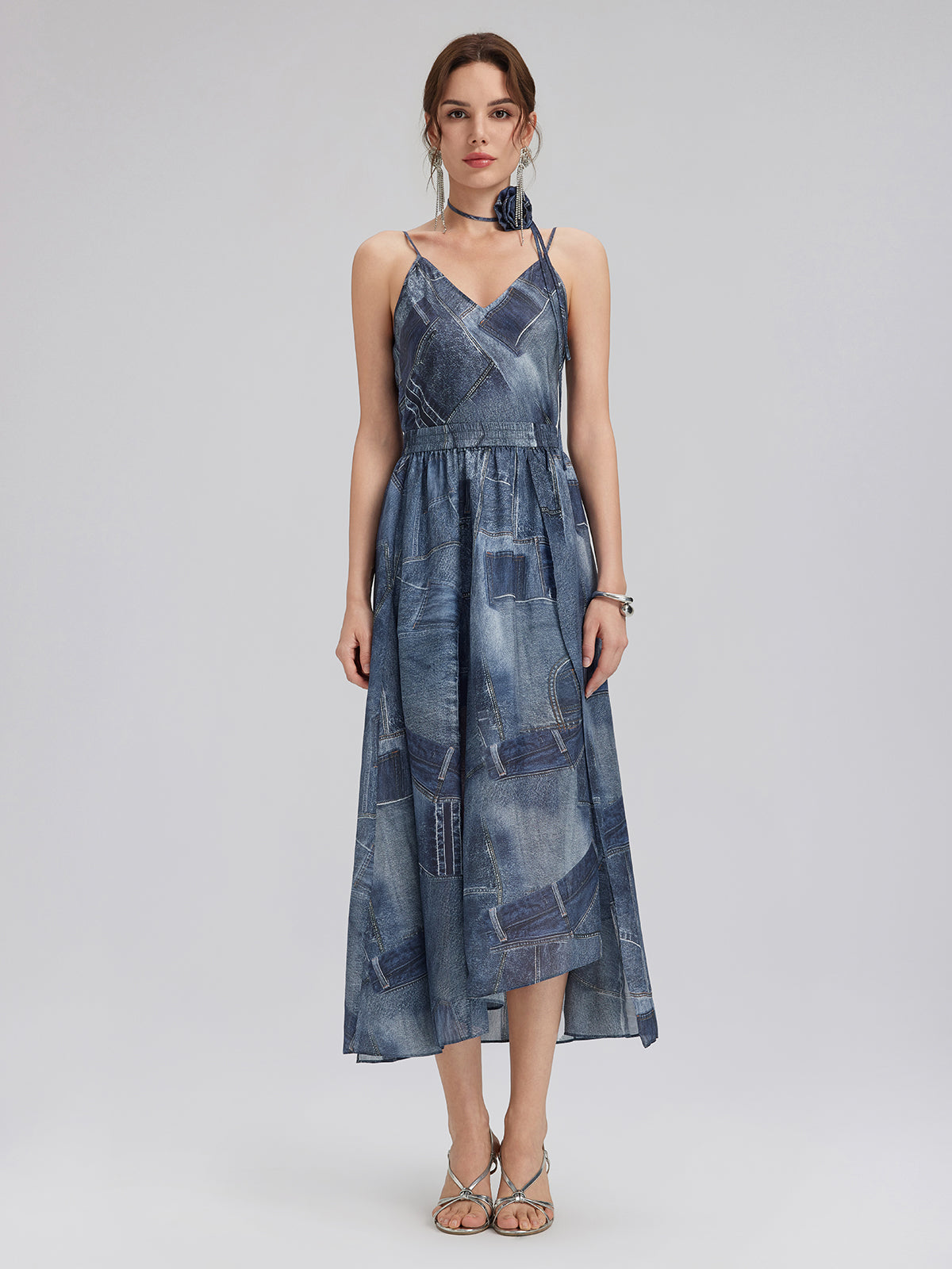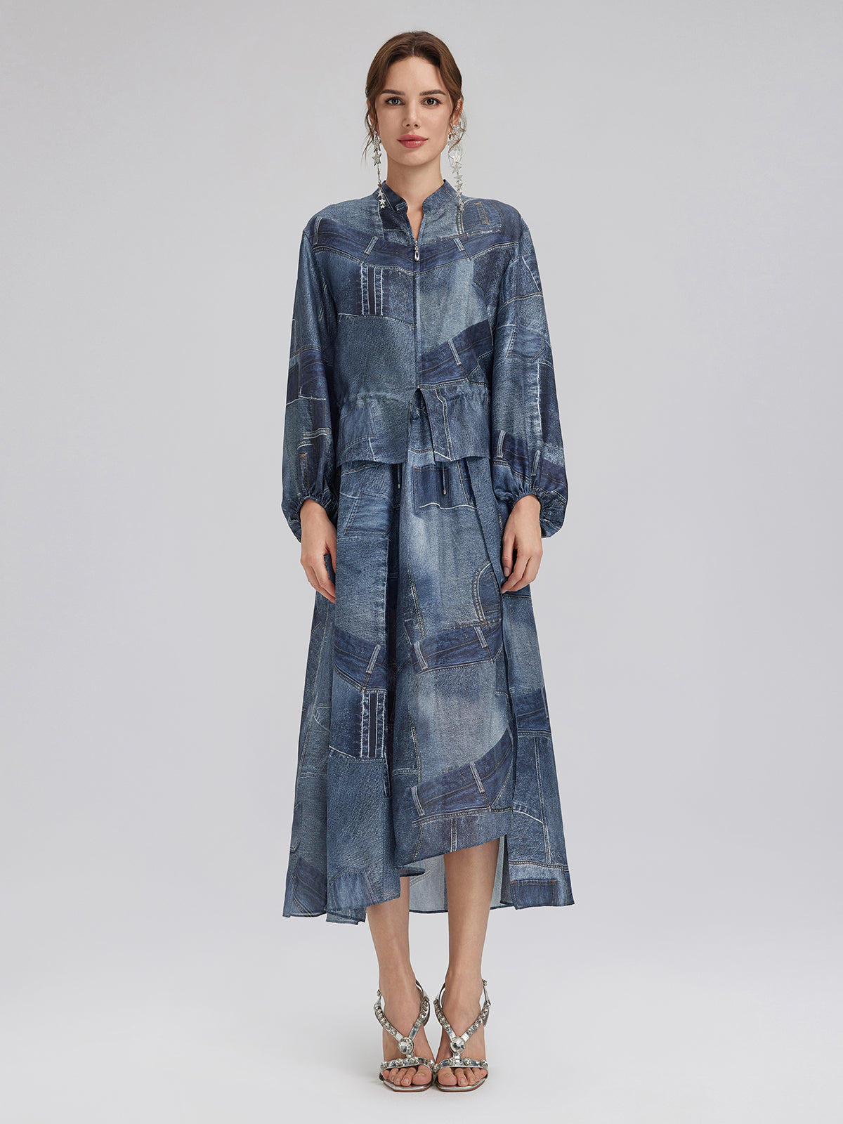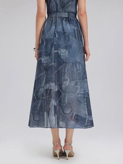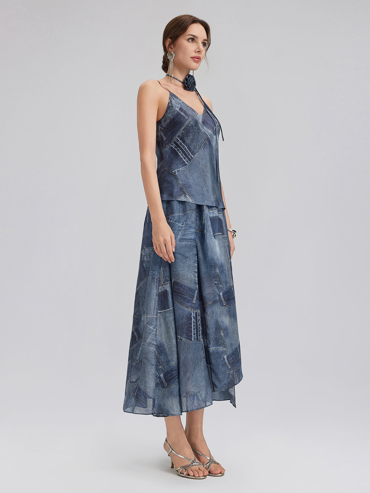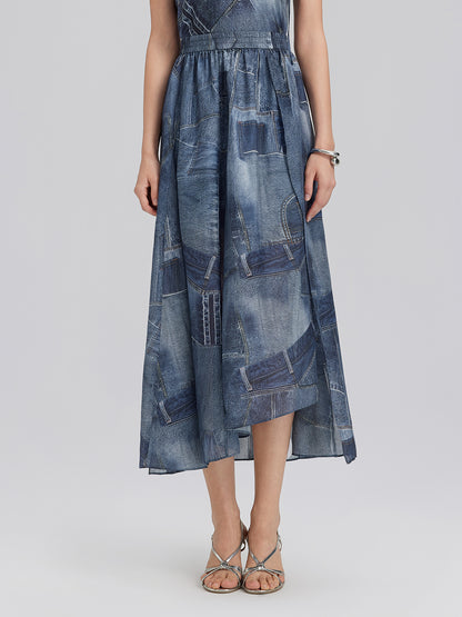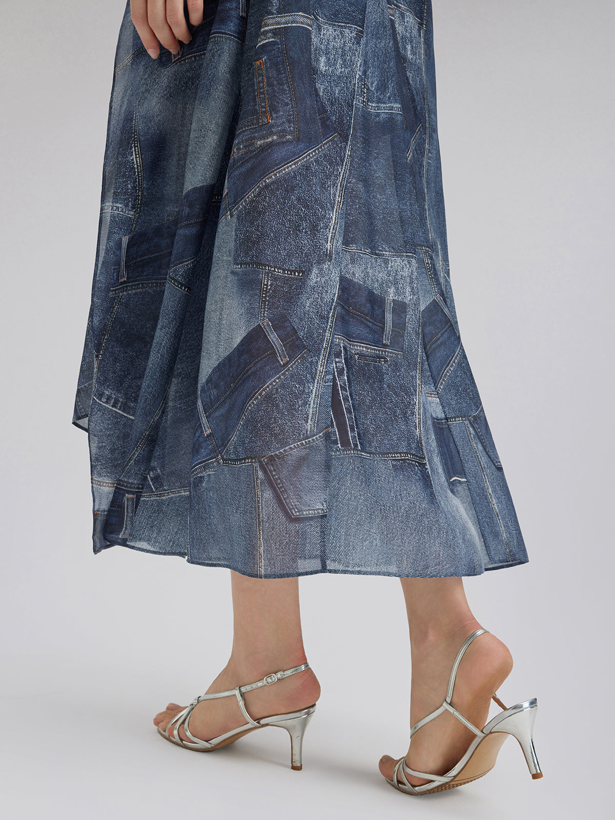 Made from soft, smooth silk chiffon that’s lightweight and breathable. Features reworked denim print details for a unique artistic edge. An irregular hem adds fluidity and movement. Elastic waistband ensures a comfortable fit and easy wear.
