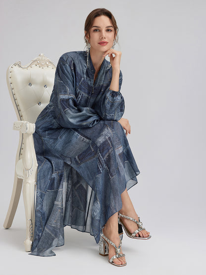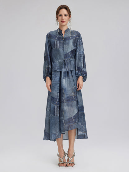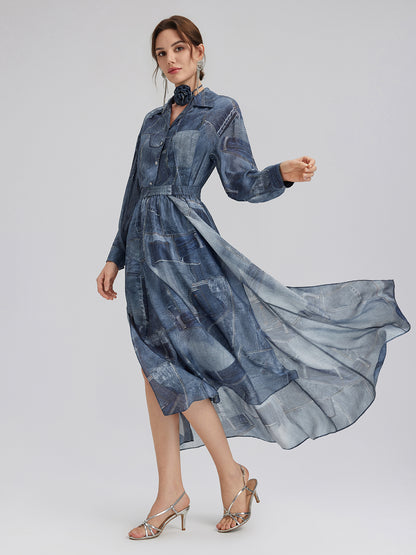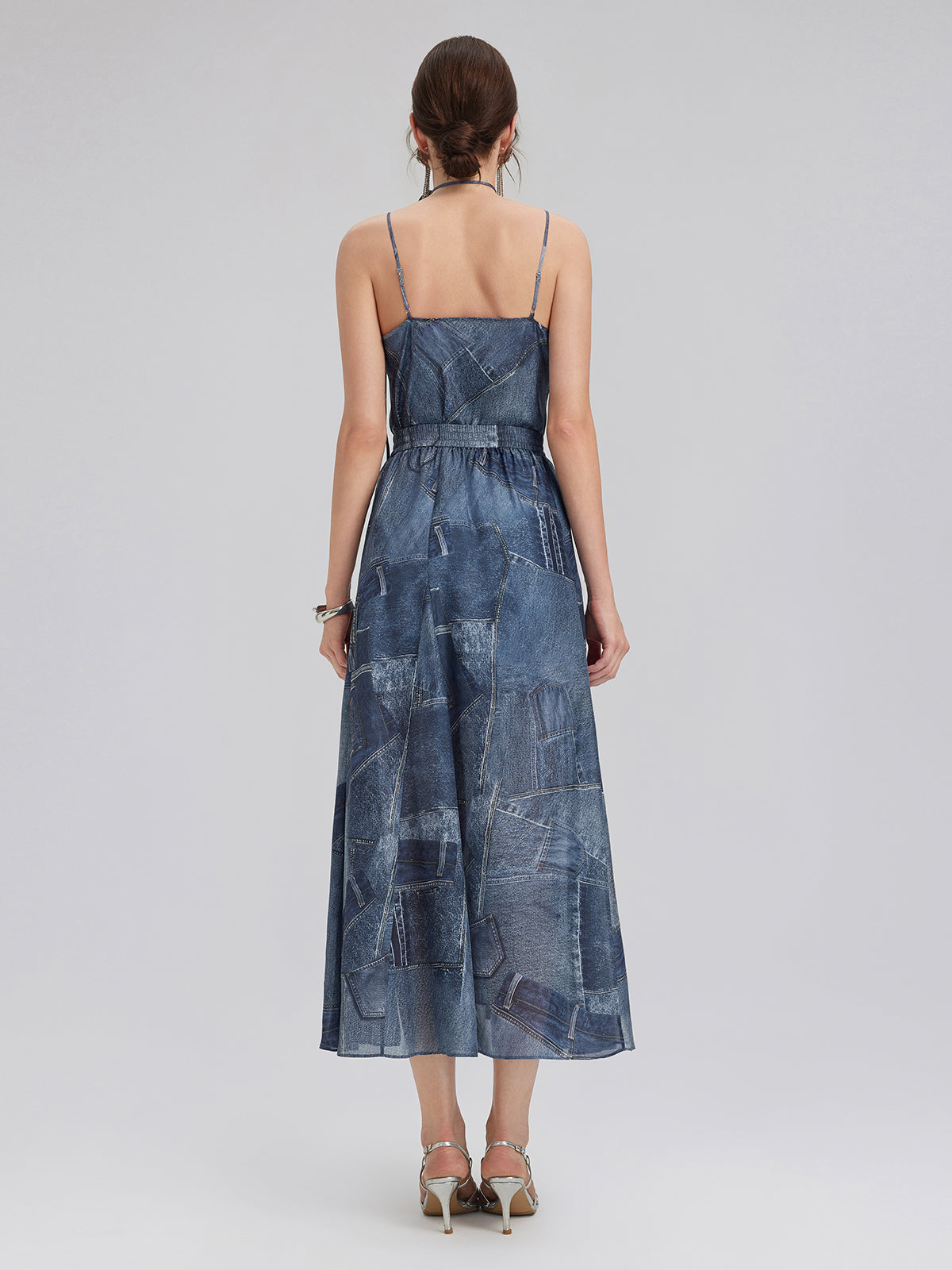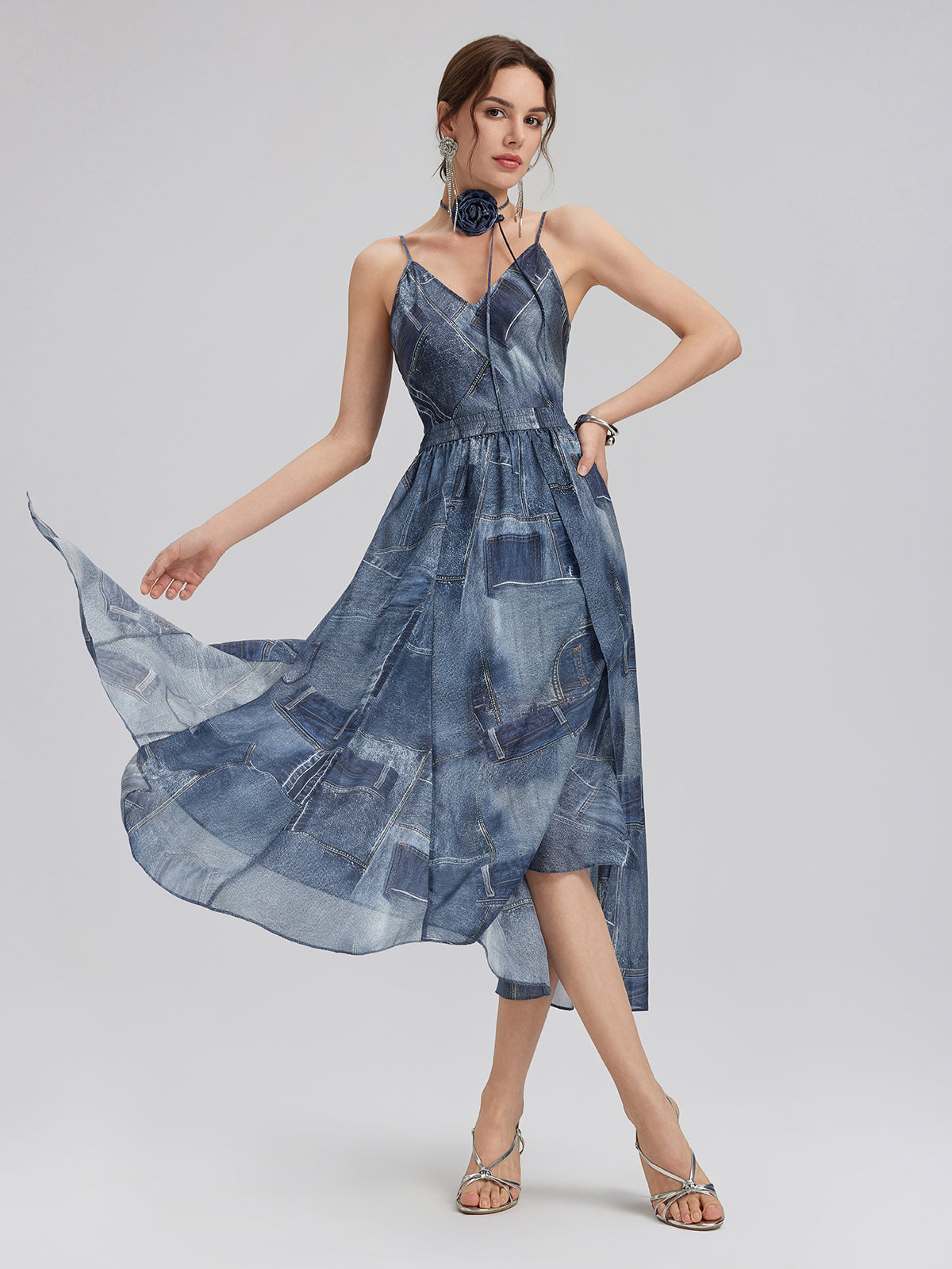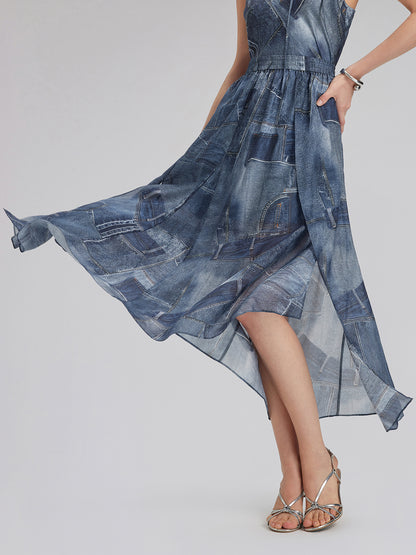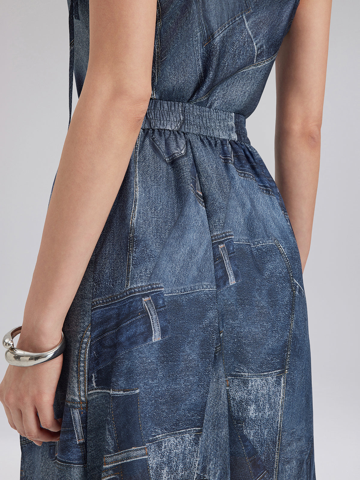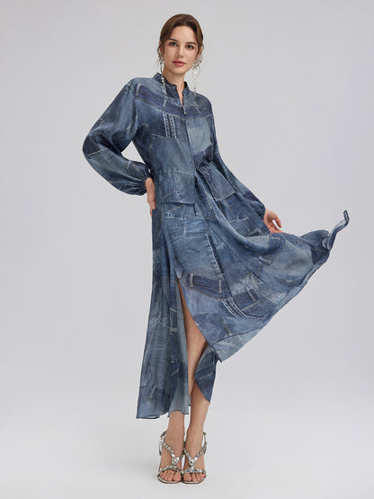 Made from soft, smooth silk chiffon that’s lightweight and breathable. Features reworked denim print details for a unique artistic edge. An irregular hem adds fluidity and movement. Elastic waistband ensures a comfortable fit and easy wear.