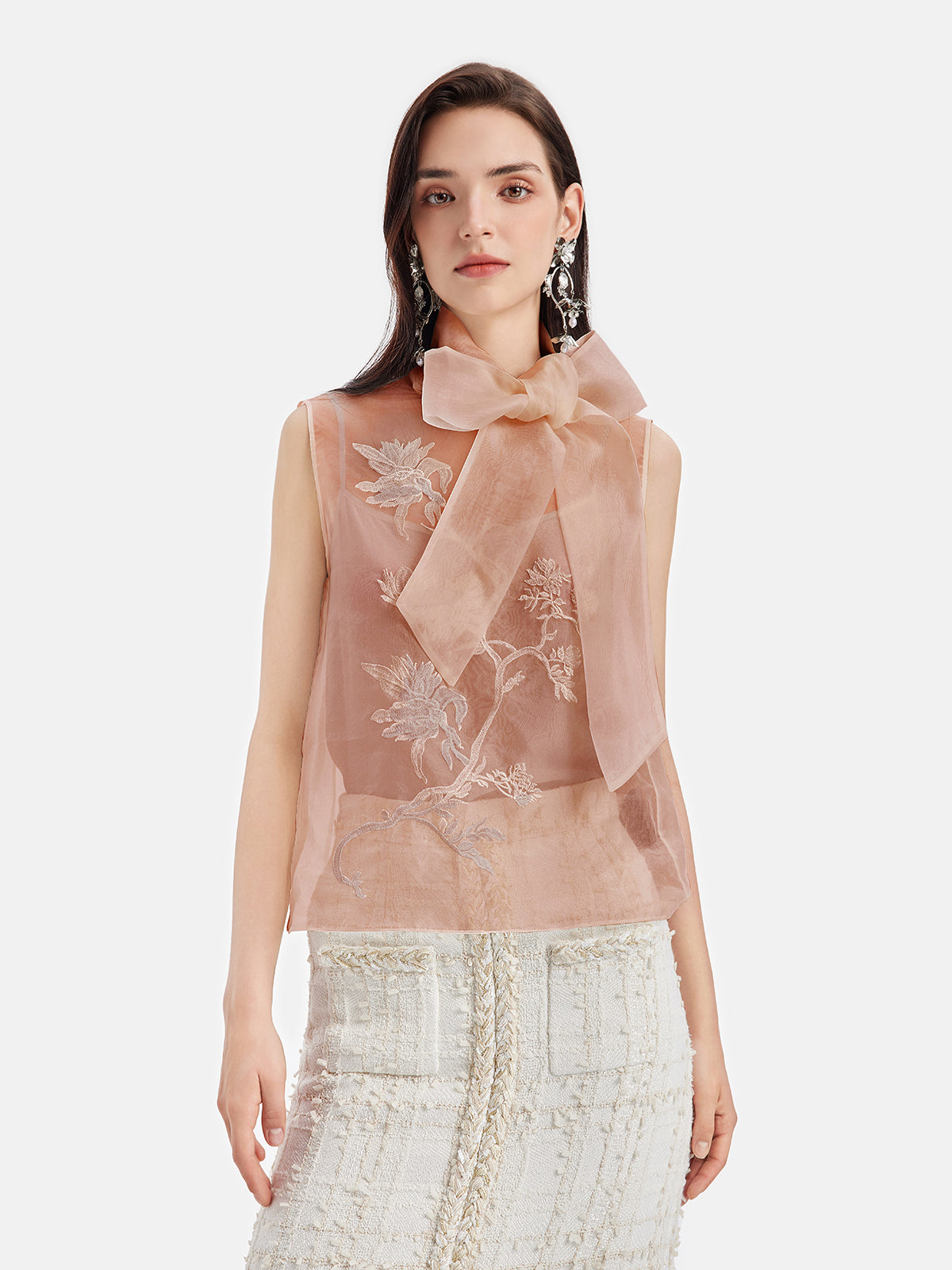 Made from premium mulberry silk, this blouse offers a luxurious feel with a natural sheen. Intricate floral embroidery adds texture and elegance, while the adjustable tie-neck detail creates a romantic touch. The semi-sheer fabric enhances its airy, graceful look. Perfect for both work and formal occasions, it's a versatile piece that pairs effortlessly with trousers or skirts for a refined yet stylish outfit. (Comes with a camisole.)