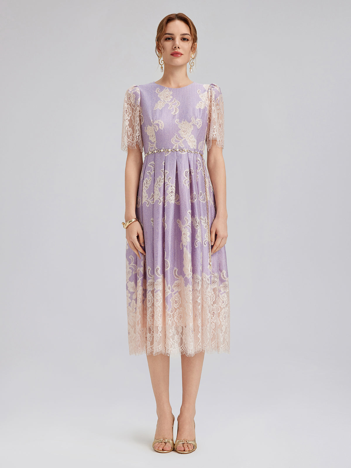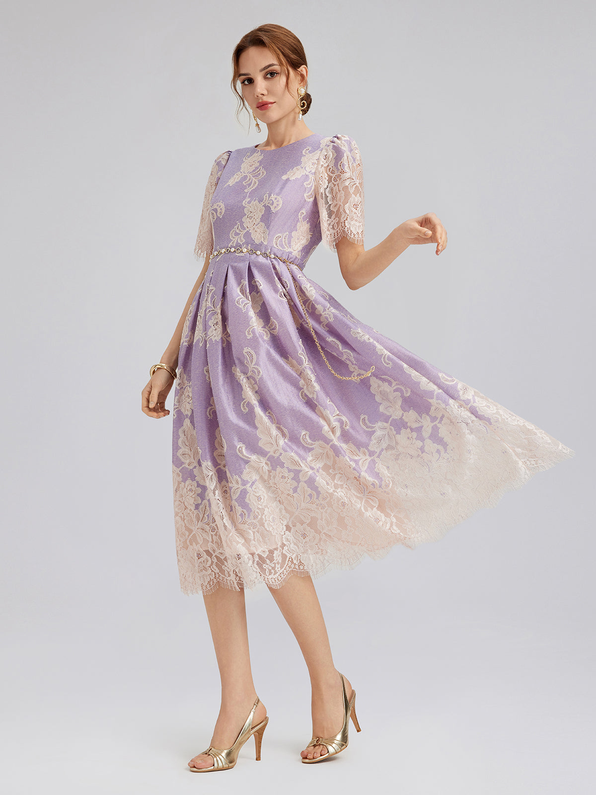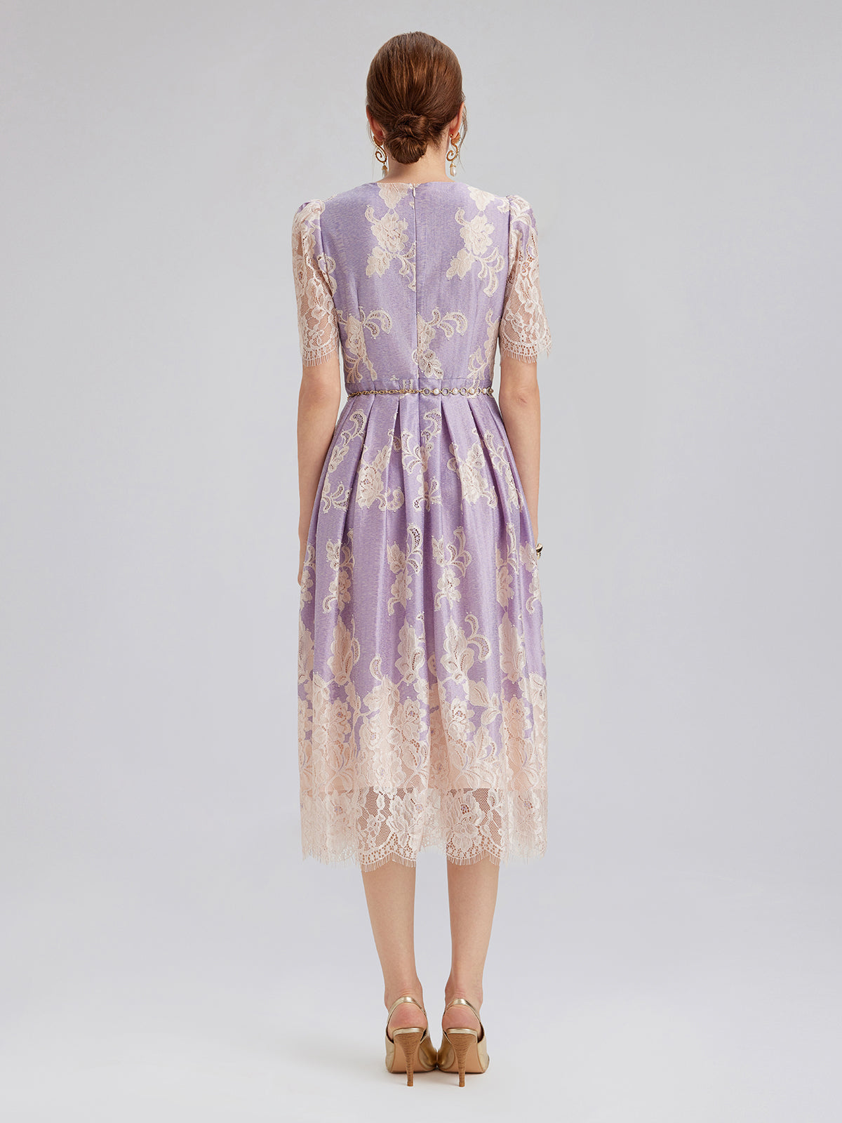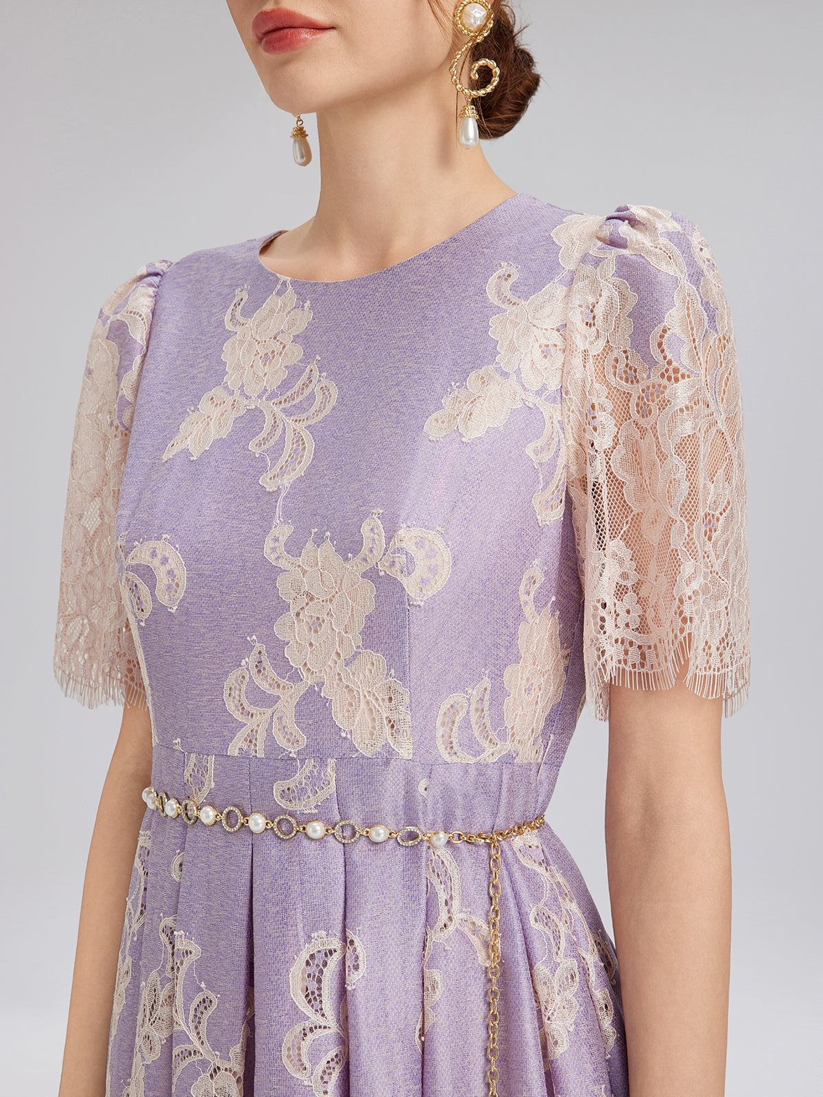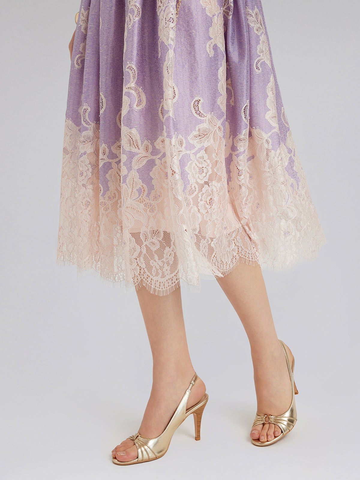 Custom lace panels soften the silhouette with intricate texture, while a delicate waist chain adds a touch of polish. The high-waisted cut elongates and flatters, paired with a back zip for easy wear. Designed for both subtle allure and feminine ease.